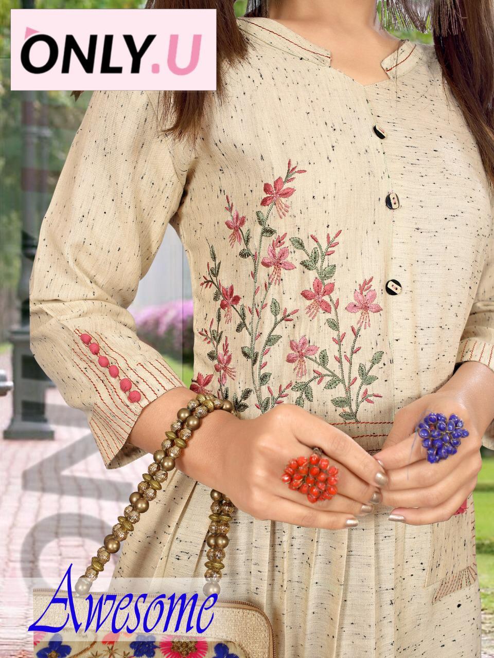 ? *Only.U* ? ?????????? Catalog - AWESOME AMAIRA* ?????????? Brand : *Only.U* Fabric : Ryon Slub, two tone maslin ?Size : M(38), L(40), XL(42) ?Designs : 6 ?Length : 44" + ?Rate : *Rs 599* per pcs . Set To Set. GST 5 Percent Extra. Delivery- Tomorrow -: Thanks : - ?? *Only.U* ?? |