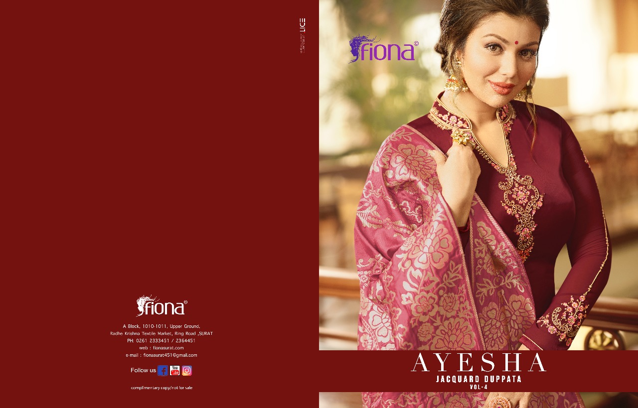 Buy Online Ayesha Jacquard Duppata Vol 4 By Fiona 22201 Series Fancy Satin Georgette Salwar Kameez Catlog Wholesale Dealer Surat 7 Pcs of Full Catalogue at Wholesale Price. Looking for Ayesha Jacquard Duppata Vol 4 By Fiona 22201 Series Fancy Satin Georgette Salwar Kameez Catlog Wholesale Dealer Surat Full Catalouge at Best Price? Buy Now Ayesha Jacquard Duppata Vol 4 By Fiona 22201 Series Fancy Satin Georgette Salwar Kameez Catlog Wholesale Dealer Surat at Wholesale Rate of Rs 9765 with Total 7 Pcs from authroized dealer and supplier of FIONA Brand. Cost of Each piece is just only Rs 1395 which is very low and affordable price to resale the product in your retail store ,This is Surat based Wholesale Supplier & Dealer of FIONA Brand. Click on Brand name to Know more about FIONA Brand's products.Call or Whatsapp on 9898838984 for booking or enquiry