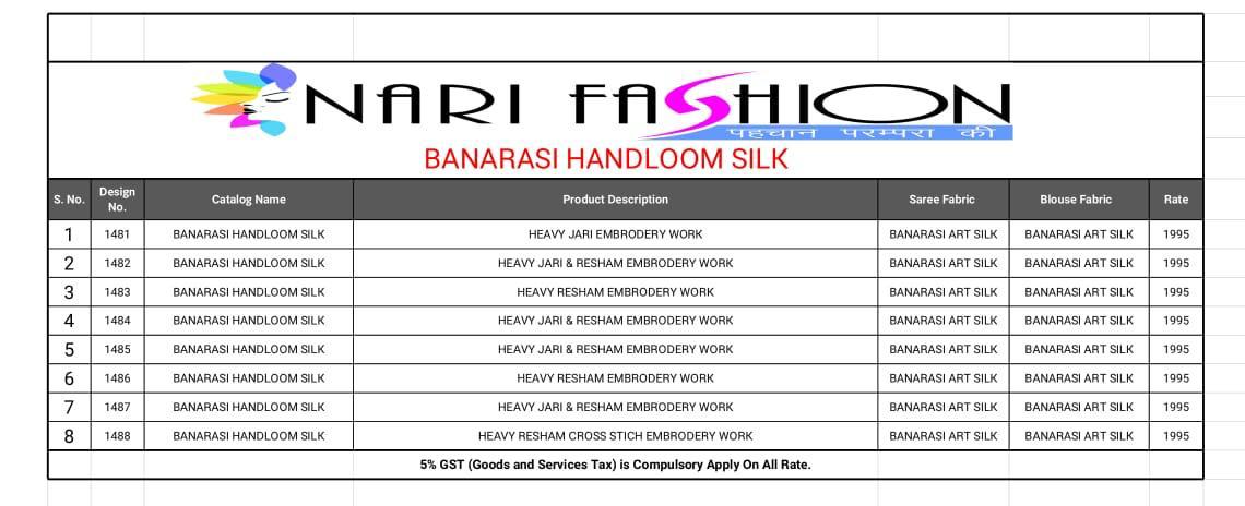 Buy Online Banarasi Handloom Silk Saree By Nari Fashion 1481 Series Fancy Party Wear Handloom Silk Saree Collection Wholesaler Surat 8 Pcs of Full Catalogue at Wholesale Price. Looking for Banarasi Handloom Silk Saree By Nari Fashion 1481 Series Fancy Party Wear Handloom Silk Saree Collection Wholesaler Surat Full Catalouge at Best Price? Buy Now Banarasi Handloom Silk Saree By Nari Fashion 1481 Series Fancy Party Wear Handloom Silk Saree Collection Wholesaler Surat at Wholesale Rate of Rs 15960 with Total 8 Pcs from authroized dealer and supplier of Nari Fashion Brand. Cost of Each piece is just only Rs 1995 which is very low and affordable price to resale the product in your retail store ,This is Surat based Wholesale Supplier & Dealer of Nari Fashion Brand. Click on Brand name to Know more about Nari Fashion Brand's products.Call or Whatsapp on 9898838984 for booking or enquiry