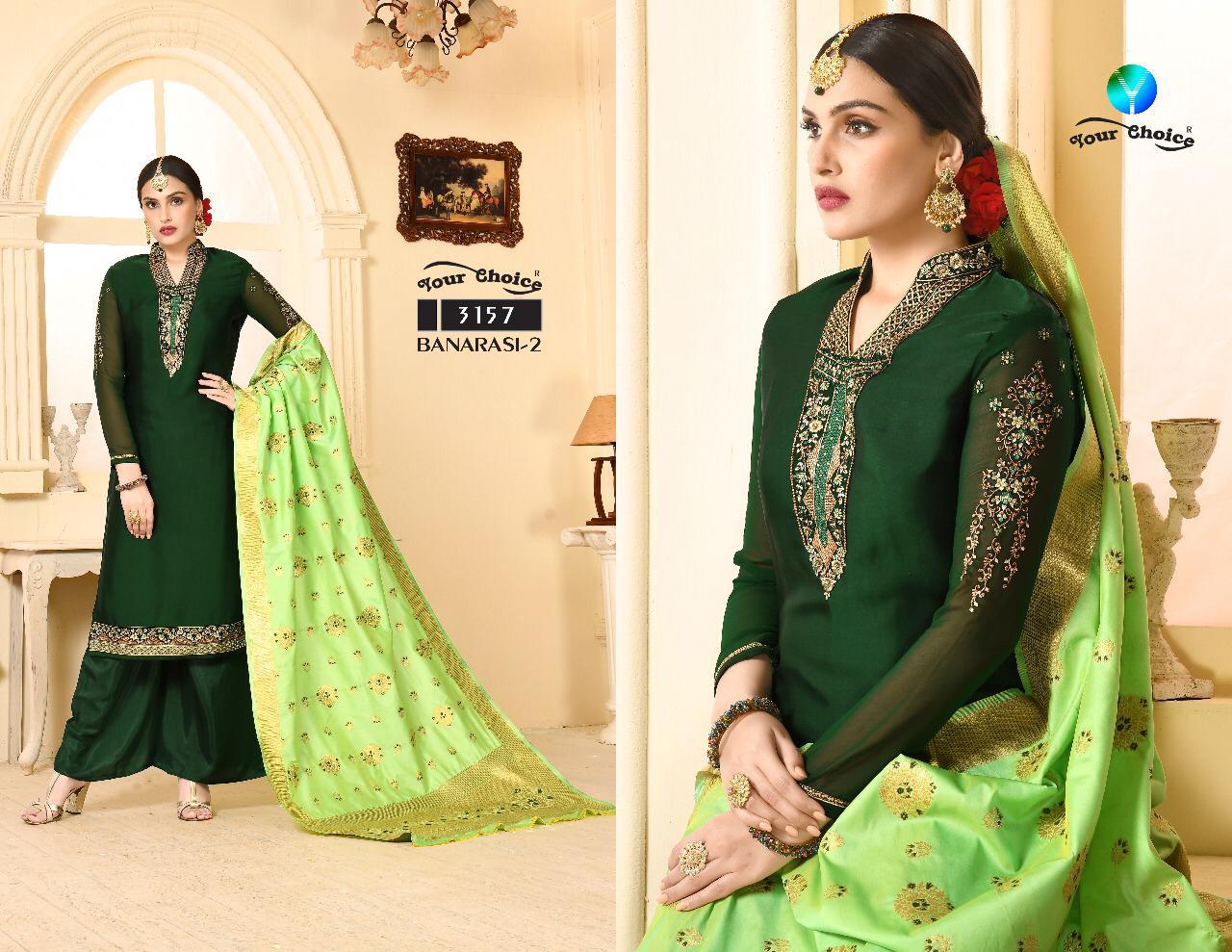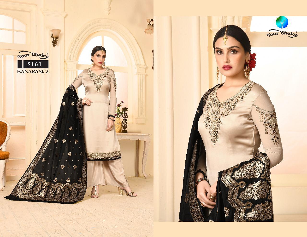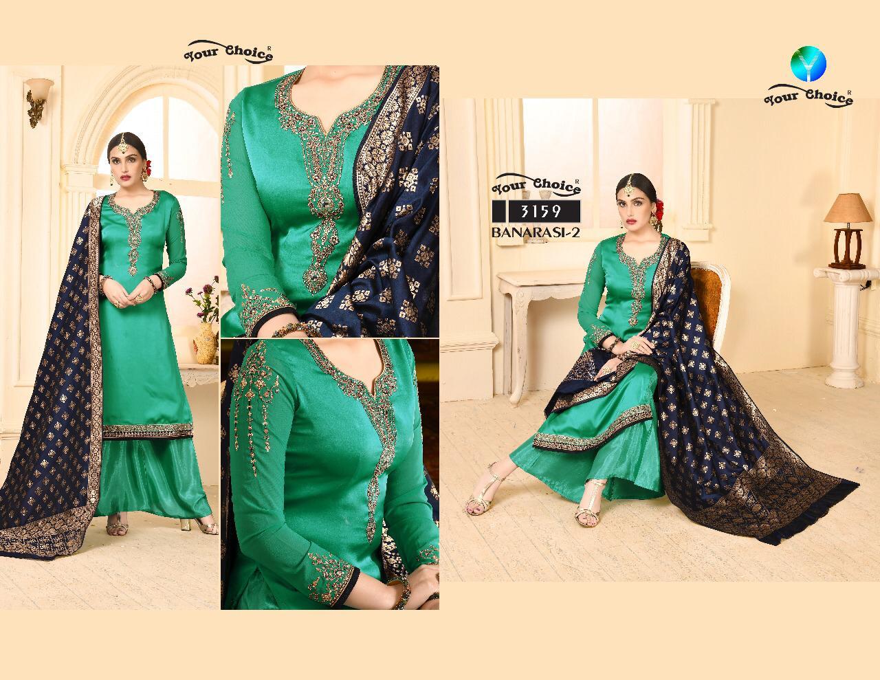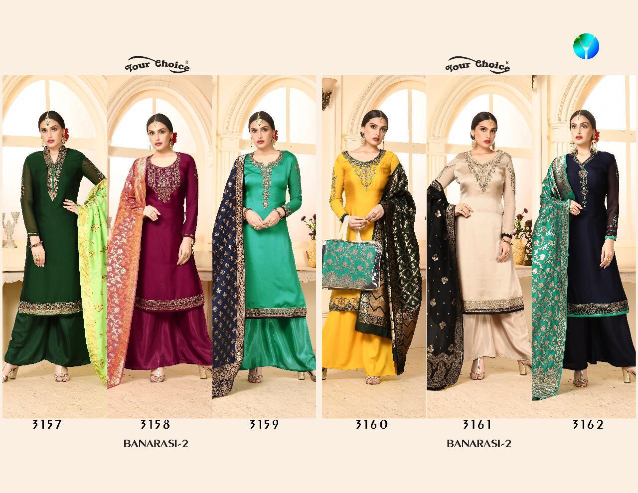 Buy Online Banarasi Vol 2 By Your Choice 3157 Series Fancy Satin Georgette Party Wear Sarara Suit Collection Wholesaler Surat 6 Pcs of Full Catalogue at Wholesale Price. Looking for Banarasi Vol 2 By Your Choice 3157 Series Fancy Satin Georgette Party Wear Sarara Suit Collection Wholesaler Surat Full Catalouge at Best Price? Buy Now Banarasi Vol 2 By Your Choice 3157 Series Fancy Satin Georgette Party Wear Sarara Suit Collection Wholesaler Surat at Wholesale Rate of Rs 7770 with Total 6 Pcs from authroized dealer and supplier of YOUR CHOICE Brand. Cost of Each piece is just only Rs 1295 which is very low and affordable price to resale the product in your retail store ,This is Surat based Wholesale Supplier & Dealer of YOUR CHOICE Brand. Click on Brand name to Know more about YOUR CHOICE Brand's products.Call or Whatsapp on 9898838984 for booking or enquiry