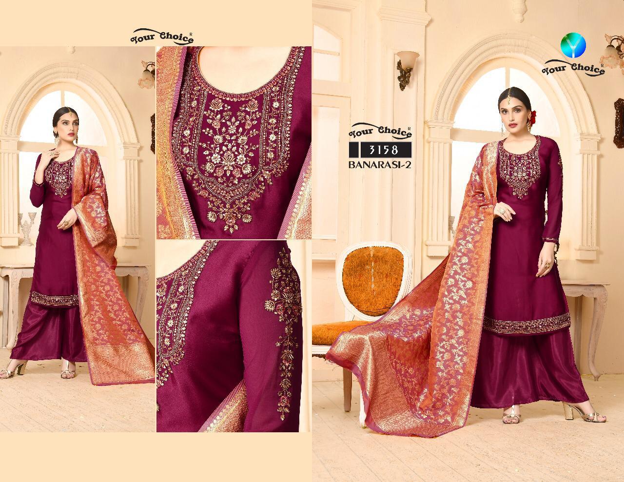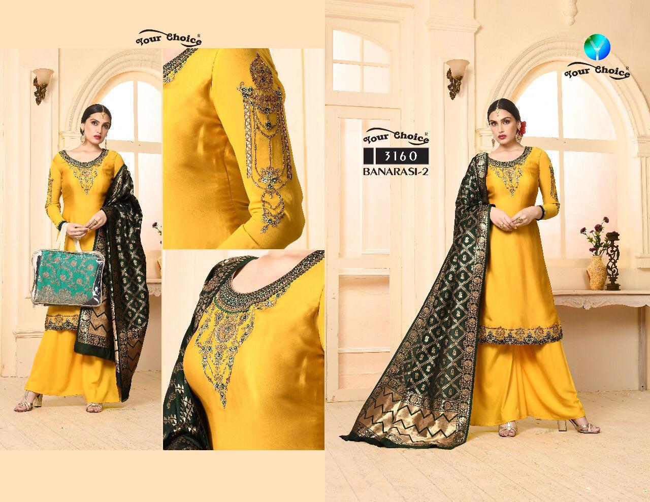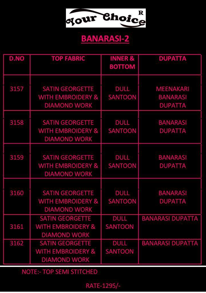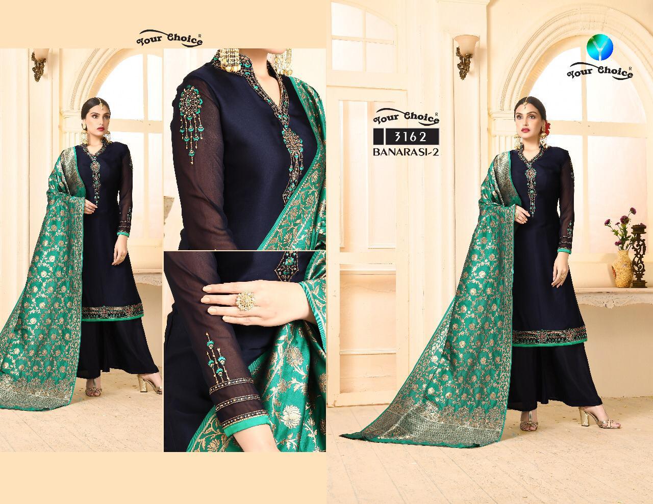 Buy Online Banarasi Vol 2 By Your Choice 3157 Series Fancy Satin Georgette Party Wear Sarara Suit Collection Wholesaler Surat 6 Pcs of Full Catalogue at Wholesale Price. Looking for Banarasi Vol 2 By Your Choice 3157 Series Fancy Satin Georgette Party Wear Sarara Suit Collection Wholesaler Surat Full Catalouge at Best Price? Buy Now Banarasi Vol 2 By Your Choice 3157 Series Fancy Satin Georgette Party Wear Sarara Suit Collection Wholesaler Surat at Wholesale Rate of Rs 7770 with Total 6 Pcs from authroized dealer and supplier of YOUR CHOICE Brand. Cost of Each piece is just only Rs 1295 which is very low and affordable price to resale the product in your retail store ,This is Surat based Wholesale Supplier & Dealer of YOUR CHOICE Brand. Click on Brand name to Know more about YOUR CHOICE Brand's products.Call or Whatsapp on 9898838984 for booking or enquiry