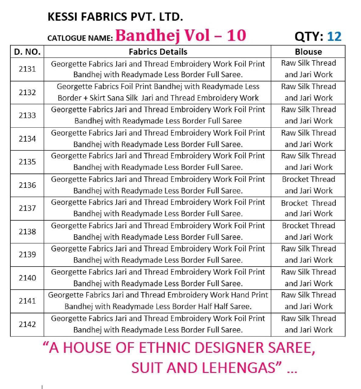 Buy Online Bandhej Vol 10 By Kessi Series 2131 To 2142 Georgette Designer Party Wear Sarees Wholesale Supplier And Dealer Surat 12 Pcs of Full Catalogue at Wholesale Price. Looking for Bandhej Vol 10 By Kessi Series 2131 To 2142 Georgette Designer Party Wear Sarees Wholesale Supplier And Dealer Surat Full Catalouge at Best Price? Buy Now Bandhej Vol 10 By Kessi Series 2131 To 2142 Georgette Designer Party Wear Sarees Wholesale Supplier And Dealer Surat at Wholesale Rate of Rs 11988 with Total 12 Pcs from authroized dealer and supplier of KESSI Brand. Cost of Each piece is just only Rs 999 which is very low and affordable price to resale the product in your retail store ,This is Surat based Wholesale Supplier & Dealer of KESSI Brand. Click on Brand name to Know more about KESSI Brand's products.Call or Whatsapp on 9898838984 for booking or enquiry