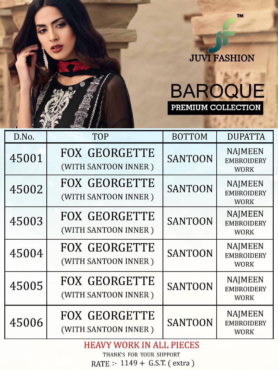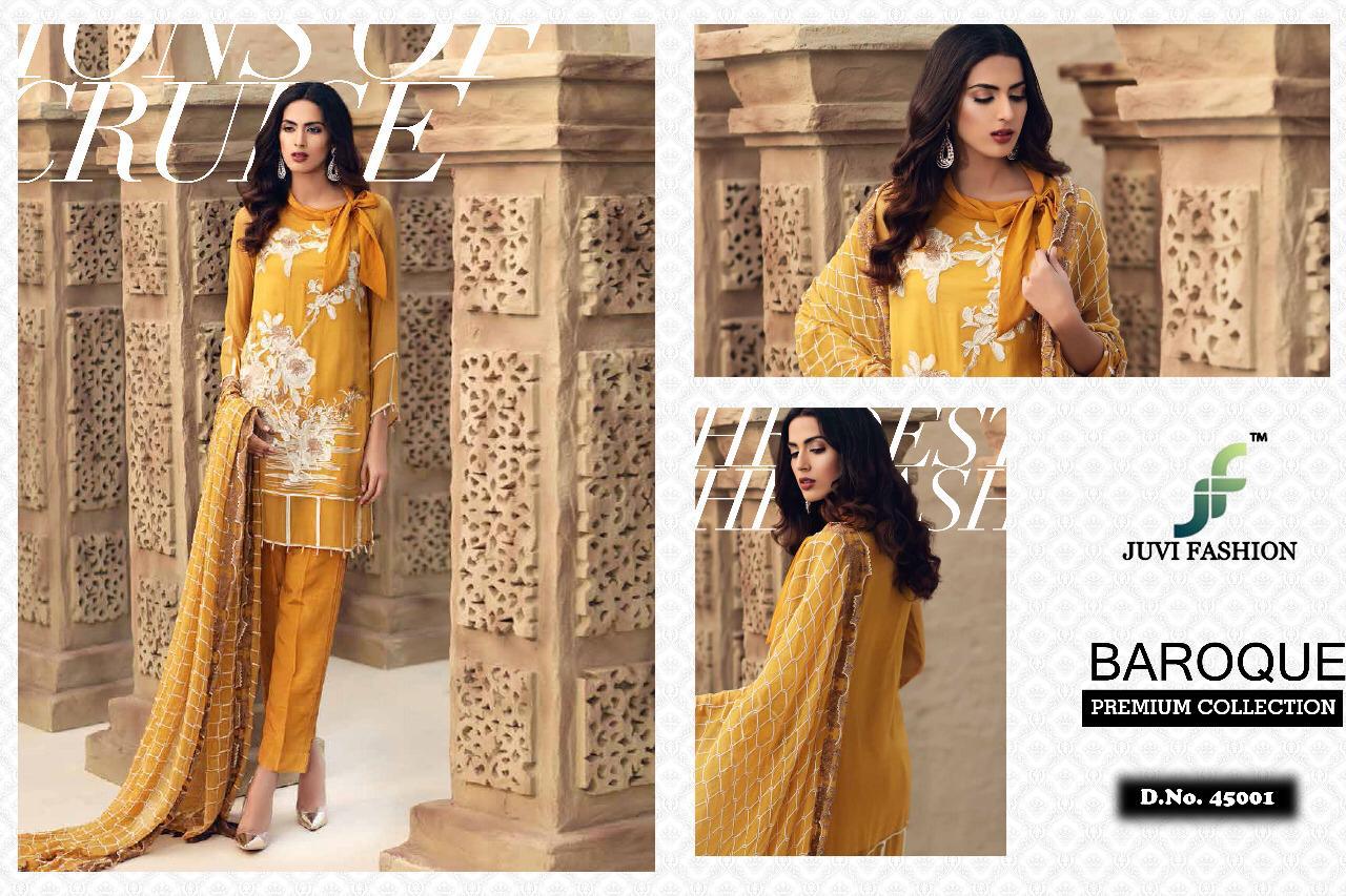 Buy Online Baroque Premium Collection By Juvi Fashion 45001 Series 6 Pcs of Full Catalogue at Wholesale Price. Looking for Baroque Premium Collection By Juvi Fashion 45001 Series Full Catalouge at Best Price? Buy Now Baroque Premium Collection By Juvi Fashion 45001 Series at Wholesale Rate of Rs 6894 with Total 6 Pcs from authroized dealer and supplier of Brand. Cost of Each piece is just only Rs 1149 which is very low and affordable price to resale the product in your retail store ,This is Surat based Wholesale Supplier & Dealer of Brand. Click on Brand name to Know more about Brand's products.Call or Whatsapp on 9898838984 for booking or enquiry