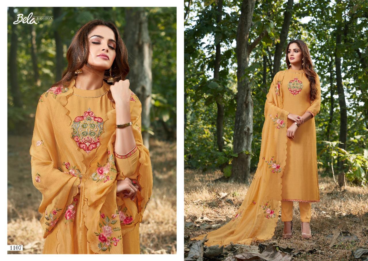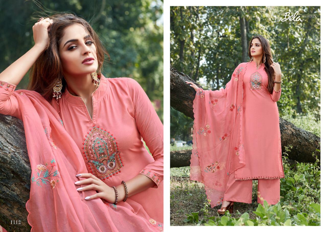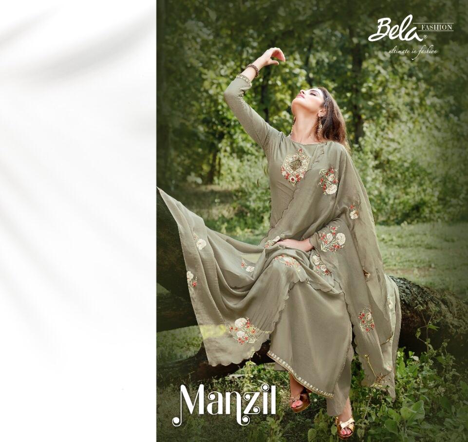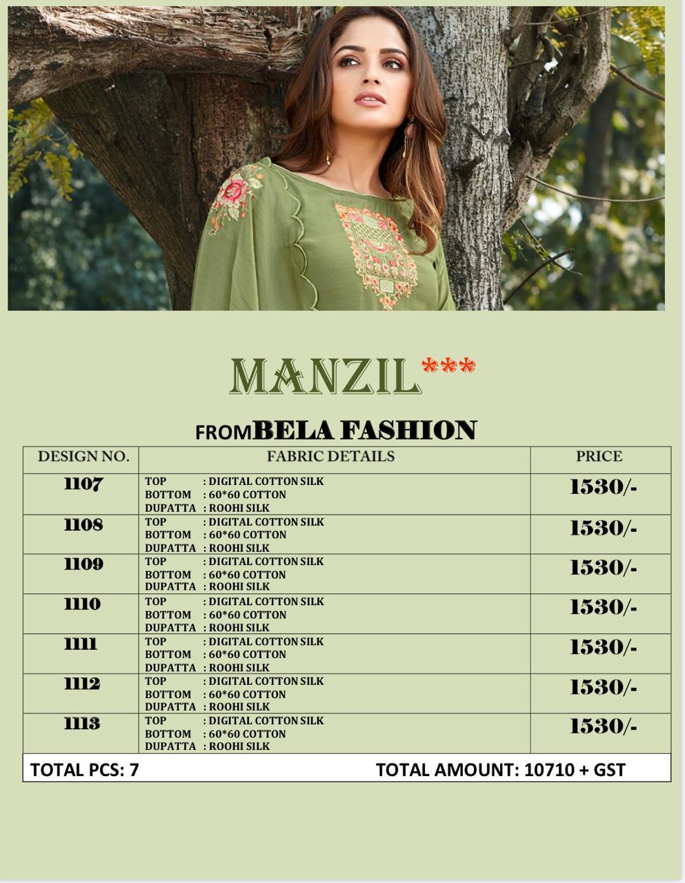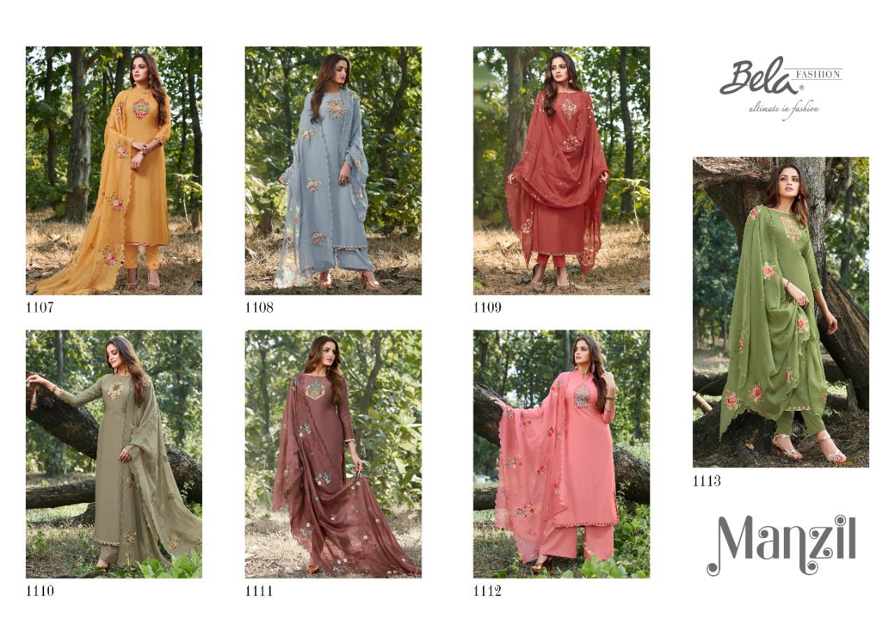Brand - BELA . Type - suit . Catlog name - MANZIL . Series - 1107 to 1113. Set & loose . Single extra 100 GST 5 Percent Extra Delivery 2 days |