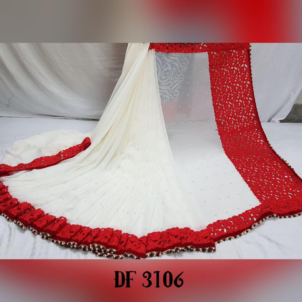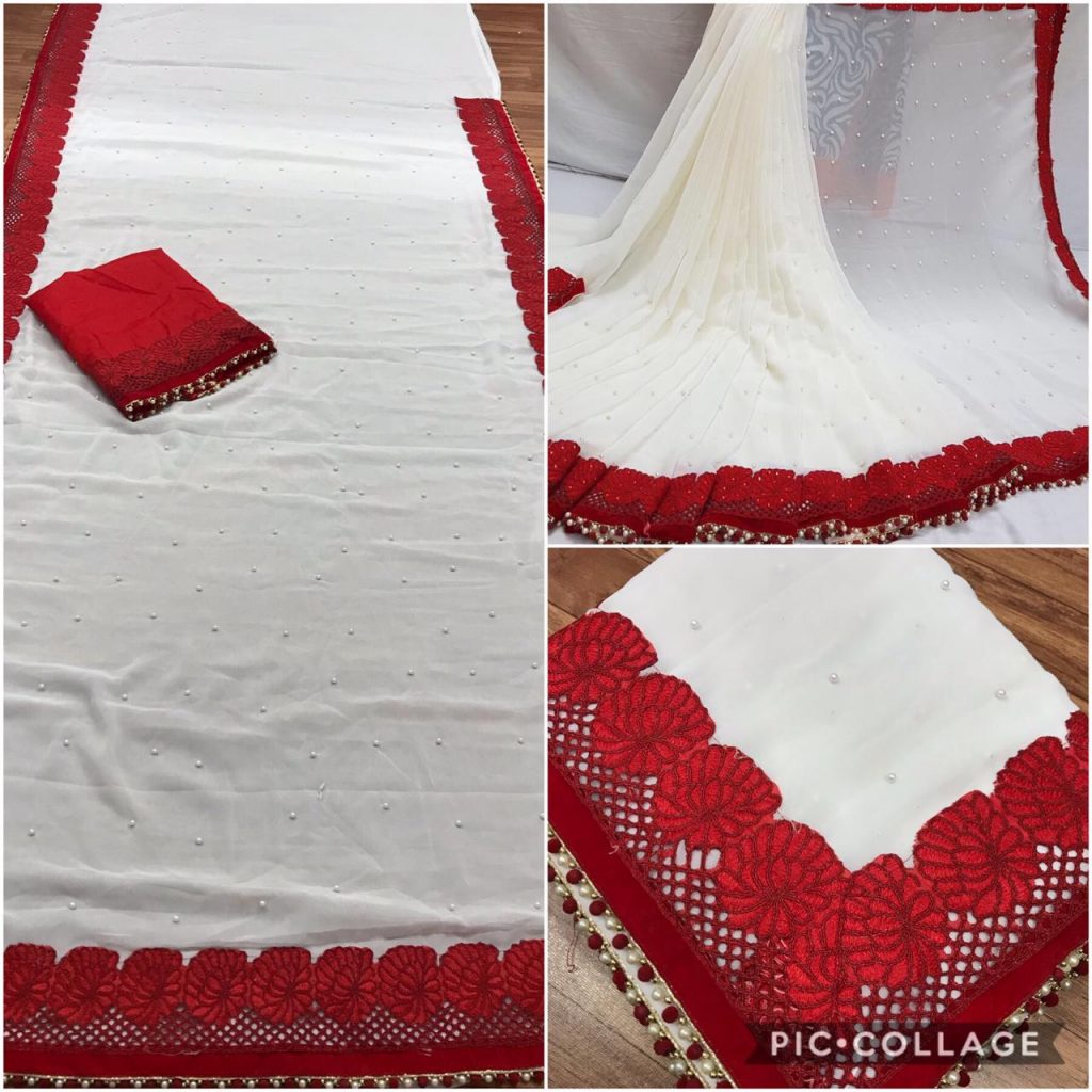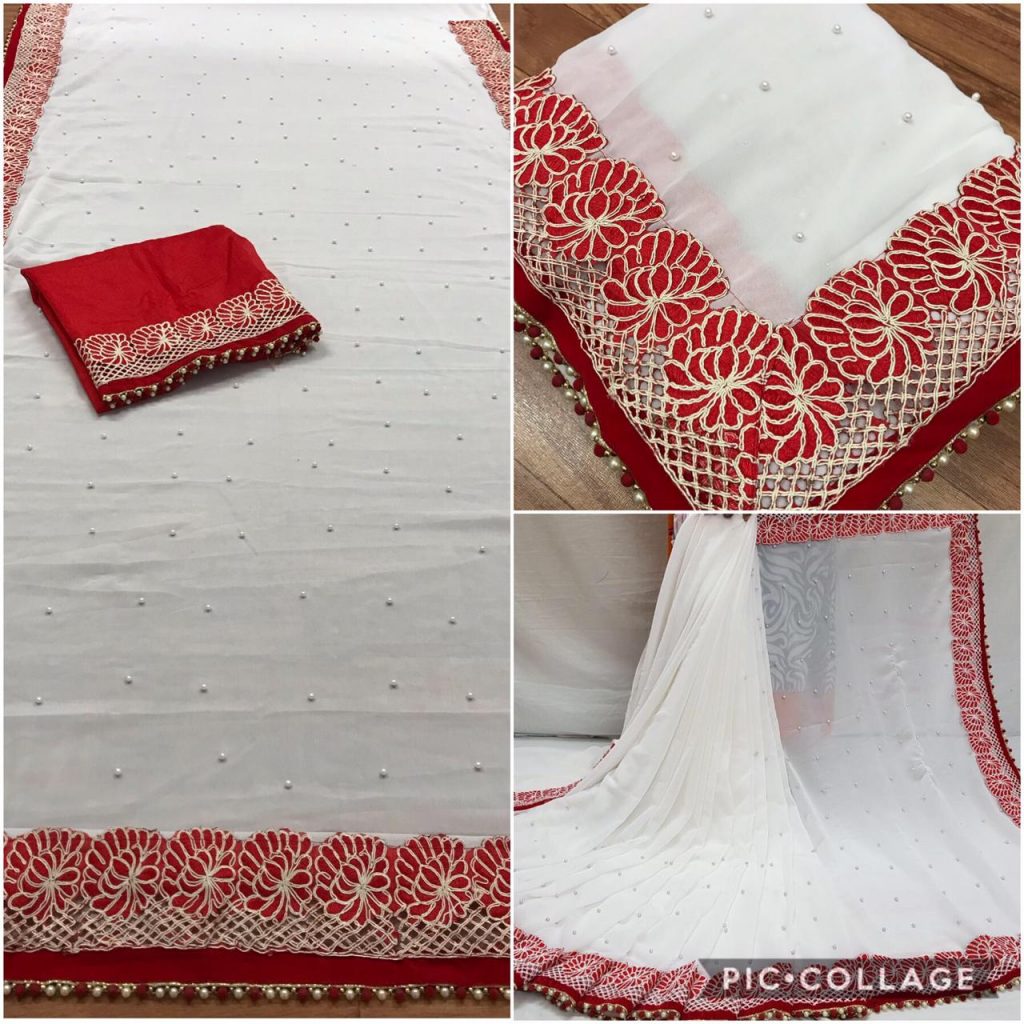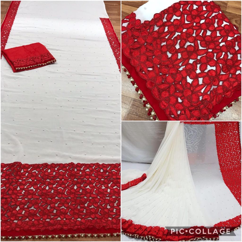 *Launching New Version Blockbuster Superhit Design* Here We Presents *CODE~ 3105,3106,3107* *PRICE-1090* Gst ship extra *SINGLE TRENDY COLOUR*? *FABRIC DETAILS*? ?Full Saree of 60 Gram georgette With Heavy Embrodery Lace Border Work ?Blouse Of Plain Red Colour Banglori Silk With Lace Border ?Saree Cut-6.30 With Blouse *Handwork Details*? New Stylish Shining Rebet Machinery Stone on Pallu & Skirt *Heavy Moti Lace Border Attached With Border* *Best Design Haves Always Best Orders*? |