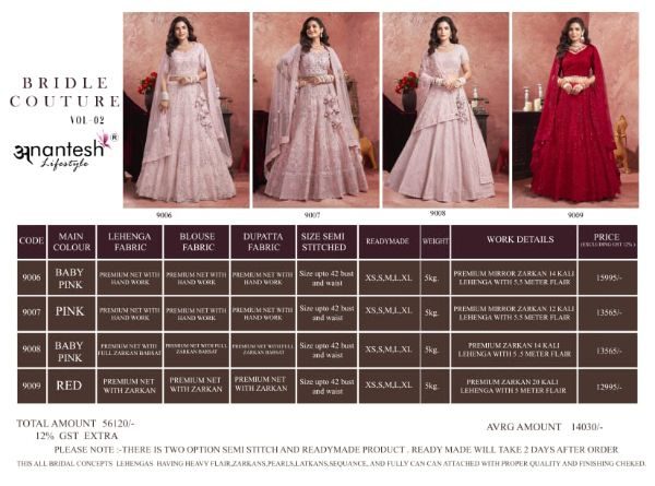 Buy Online Bridal Couture Vol 2 Series 9006 To 9009 By Anantesh Lifestyle Premium Festive Collection 4 Pcs of Full Catalogue at Wholesale Price. Looking for Bridal Couture Vol 2 Series 9006 To 9009 By Anantesh Lifestyle Premium Festive Collection Full Catalouge at Best Price? Buy Now Bridal Couture Vol 2 Series 9006 To 9009 By Anantesh Lifestyle Premium Festive Collection at Wholesale Rate of Rs 0 with Total 4 Pcs from authroized dealer and supplier of Brand. Cost of Each piece is just only Rs 0 which is very low and affordable price to resale the product in your retail store ,This is Surat based Wholesale Supplier & Dealer of Brand. Click on Brand name to Know more about Brand's products.Call or Whatsapp on 9898838984 for booking or enquiry