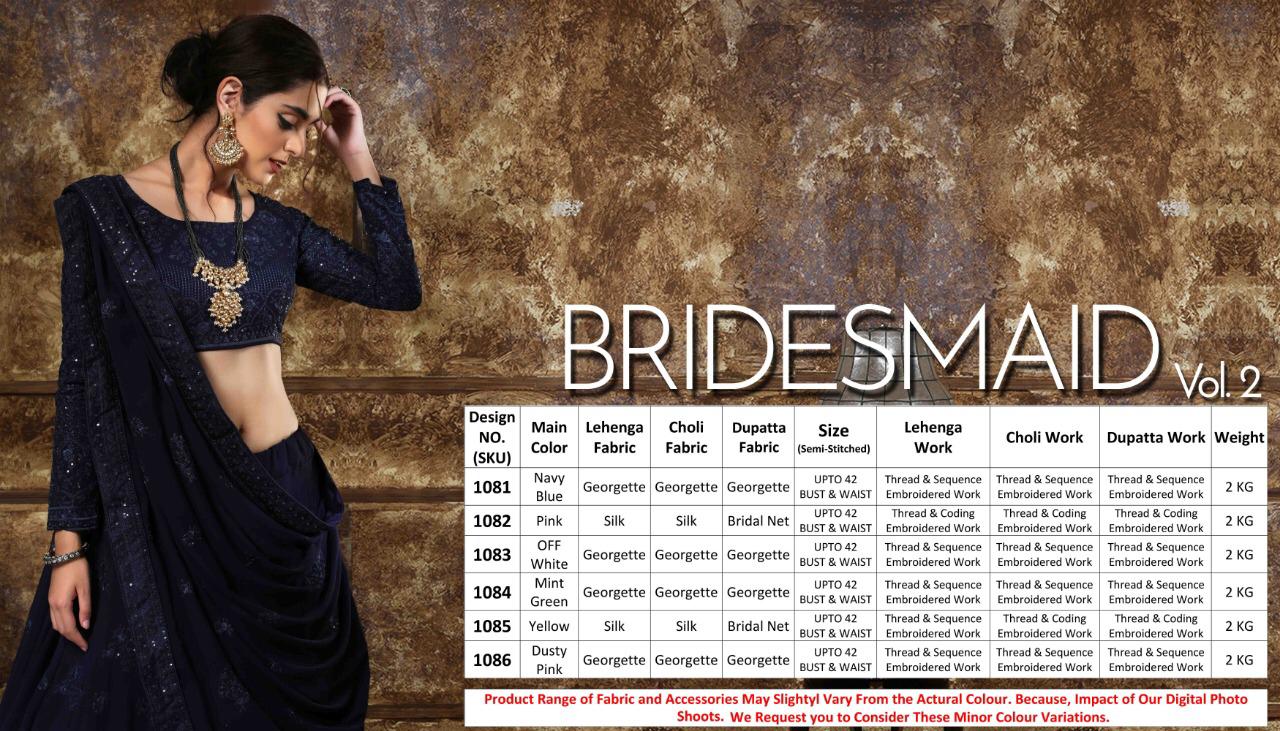 Buy Online Bridesmaid Vol 2 Series 1081 To 1086 Khushboo Party Wear Lehangas Wholesale Supplier Surat 6 Pcs of Full Catalogue at Wholesale Price. Looking for Bridesmaid Vol 2 Series 1081 To 1086 Khushboo Party Wear Lehangas Wholesale Supplier Surat Full Catalouge at Best Price? Buy Now Bridesmaid Vol 2 Series 1081 To 1086 Khushboo Party Wear Lehangas Wholesale Supplier Surat at Wholesale Rate of Rs 22200 with Total 6 Pcs from authroized dealer and supplier of BRAND'S Brand. Cost of Each piece is just only Rs 3700 which is very low and affordable price to resale the product in your retail store ,This is Surat based Wholesale Supplier & Dealer of BRAND'S Brand. Click on Brand name to Know more about BRAND'S Brand's products.Call or Whatsapp on 9898838984 for booking or enquiry