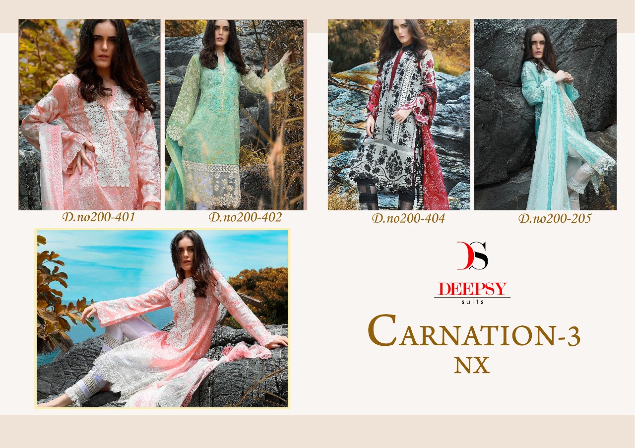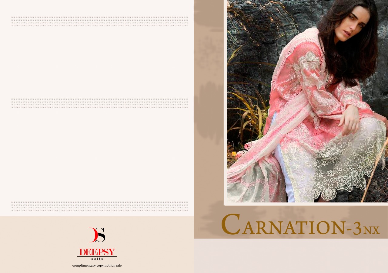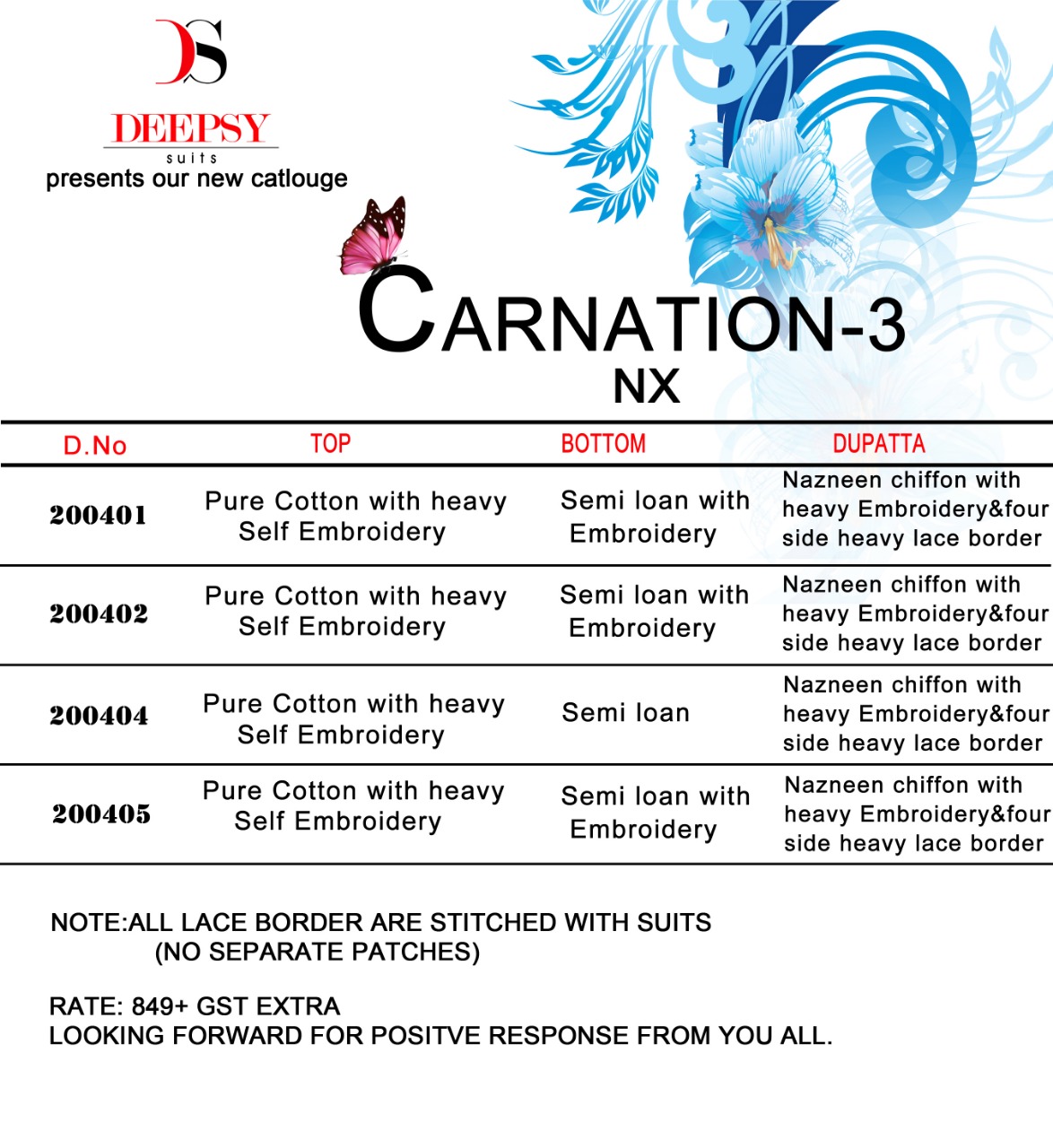 Buy Online Carnation 3 Nx By Deepsy Cotton Embroidered Suits Wholesale Supplier And Dealer Gujarat 4 Pcs of Full Catalogue at Wholesale Price. Looking for Carnation 3 Nx By Deepsy Cotton Embroidered Suits Wholesale Supplier And Dealer Gujarat Full Catalouge at Best Price? Buy Now Carnation 3 Nx By Deepsy Cotton Embroidered Suits Wholesale Supplier And Dealer Gujarat at Wholesale Rate of Rs 3396 with Total 4 Pcs from authroized dealer and supplier of DEEPSY Brand. Cost of Each piece is just only Rs 849 which is very low and affordable price to resale the product in your retail store ,This is Surat based Wholesale Supplier & Dealer of DEEPSY Brand. Click on Brand name to Know more about DEEPSY Brand's products.Call or Whatsapp on 9898838984 for booking or enquiry