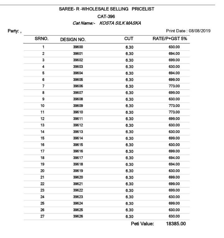 Buy Online Cat 396 Kosta Silk By Vipul Fancy Cotton Sarees Wholesale Supplier And Dealer Surat 27 Pcs of Full Catalogue at Wholesale Price. Looking for Cat 396 Kosta Silk By Vipul Fancy Cotton Sarees Wholesale Supplier And Dealer Surat Full Catalouge at Best Price? Buy Now Cat 396 Kosta Silk By Vipul Fancy Cotton Sarees Wholesale Supplier And Dealer Surat at Wholesale Rate of Rs 18387 with Total 27 Pcs from authroized dealer and supplier of VIPUL Brand. Cost of Each piece is just only Rs 681 which is very low and affordable price to resale the product in your retail store ,This is Surat based Wholesale Supplier & Dealer of VIPUL Brand. Click on Brand name to Know more about VIPUL Brand's products.Call or Whatsapp on 9898838984 for booking or enquiry