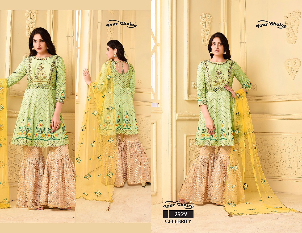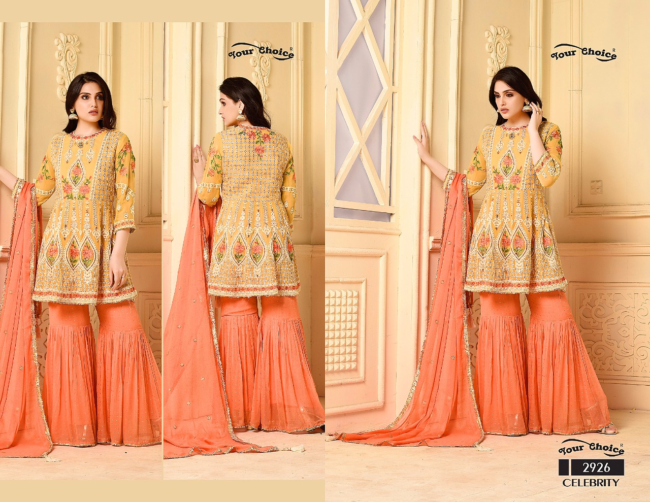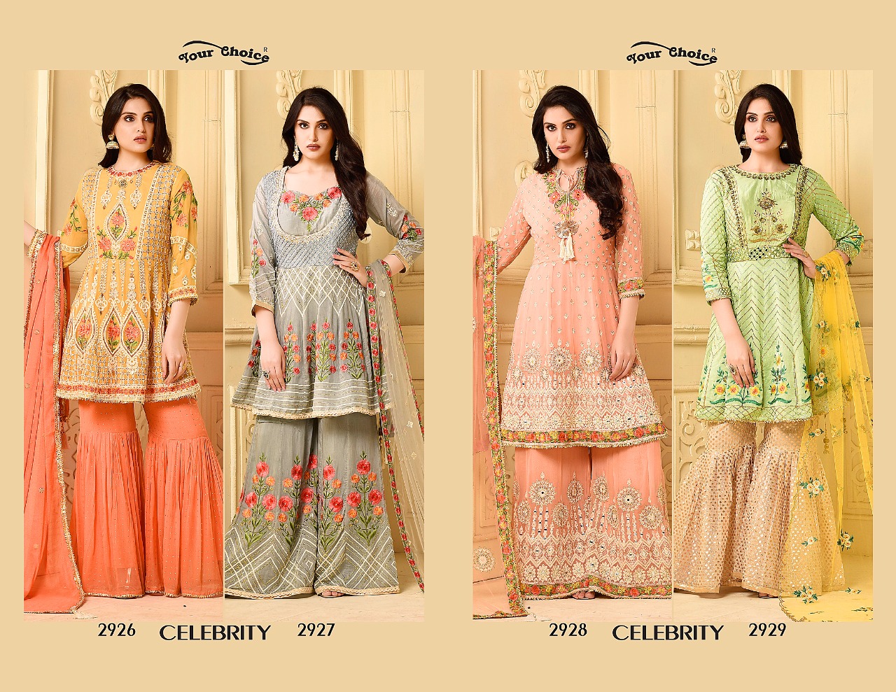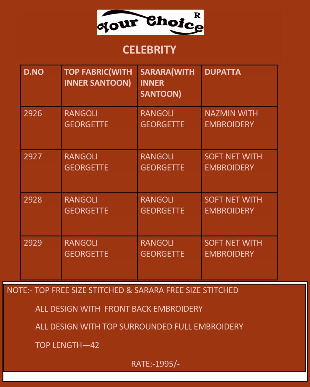 Buy Online Celebrity By Your Choice Rangoli Georgette Designer Sarara Suits Wholesale Supplier And Dealer Nityanx Surat 4 Pcs of Full Catalogue at Wholesale Price. Looking for Celebrity By Your Choice Rangoli Georgette Designer Sarara Suits Wholesale Supplier And Dealer Nityanx Surat Full Catalouge at Best Price? Buy Now Celebrity By Your Choice Rangoli Georgette Designer Sarara Suits Wholesale Supplier And Dealer Nityanx Surat at Wholesale Rate of Rs 7980 with Total 4 Pcs from authroized dealer and supplier of YOUR CHOICE Brand. Cost of Each piece is just only Rs 1995 which is very low and affordable price to resale the product in your retail store ,This is Surat based Wholesale Supplier & Dealer of YOUR CHOICE Brand. Click on Brand name to Know more about YOUR CHOICE Brand's products.Call or Whatsapp on 9898838984 for booking or enquiry