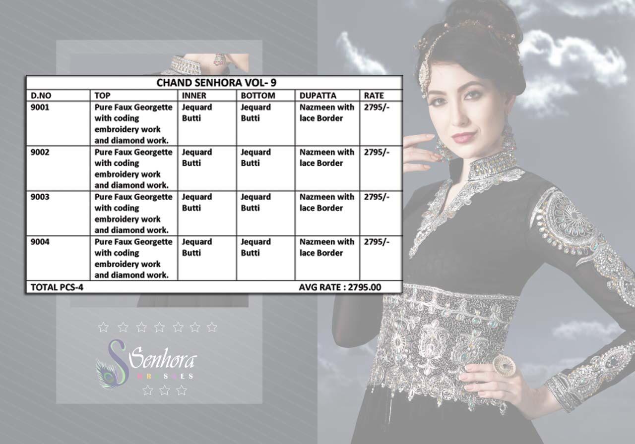 Buy Online Chand By Senhora Dresses Series 9001 To 9004 Georgette Embroidered Designer Party Wear Suits Wholesale Supplier Surat 4 Pcs of Full Catalogue at Wholesale Price. Looking for Chand By Senhora Dresses Series 9001 To 9004 Georgette Embroidered Designer Party Wear Suits Wholesale Supplier Surat Full Catalouge at Best Price? Buy Now Chand By Senhora Dresses Series 9001 To 9004 Georgette Embroidered Designer Party Wear Suits Wholesale Supplier Surat at Wholesale Rate of Rs 11180 with Total 4 Pcs from authroized dealer and supplier of Brand. Cost of Each piece is just only Rs 2795 which is very low and affordable price to resale the product in your retail store ,This is Surat based Wholesale Supplier & Dealer of Brand. Click on Brand name to Know more about Brand's products.Call or Whatsapp on 9898838984 for booking or enquiry