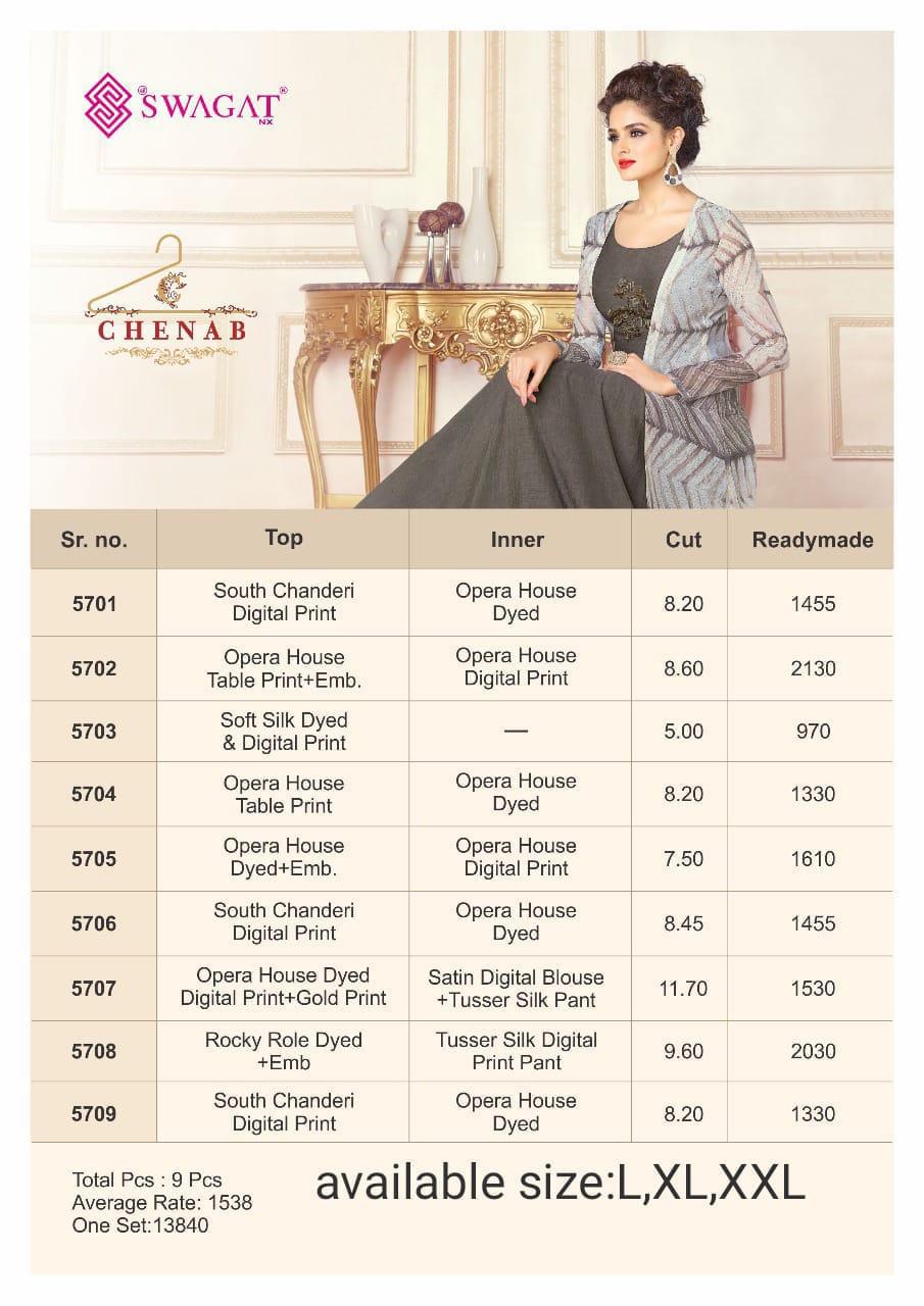 Buy Online Chenab By Swagat Beautiful Fancy Designer Party Wear Gown Wholesale Supplier And Dealer Gujarat 9 Pcs of Full Catalogue at Wholesale Price. Looking for Chenab By Swagat Beautiful Fancy Designer Party Wear Gown Wholesale Supplier And Dealer Gujarat Full Catalouge at Best Price? Buy Now Chenab By Swagat Beautiful Fancy Designer Party Wear Gown Wholesale Supplier And Dealer Gujarat at Wholesale Rate of Rs 13842 with Total 9 Pcs from authroized dealer and supplier of SWAGAT Brand. Cost of Each piece is just only Rs 1538 which is very low and affordable price to resale the product in your retail store ,This is Surat based Wholesale Supplier & Dealer of SWAGAT Brand. Click on Brand name to Know more about SWAGAT Brand's products.Call or Whatsapp on 9898838984 for booking or enquiry