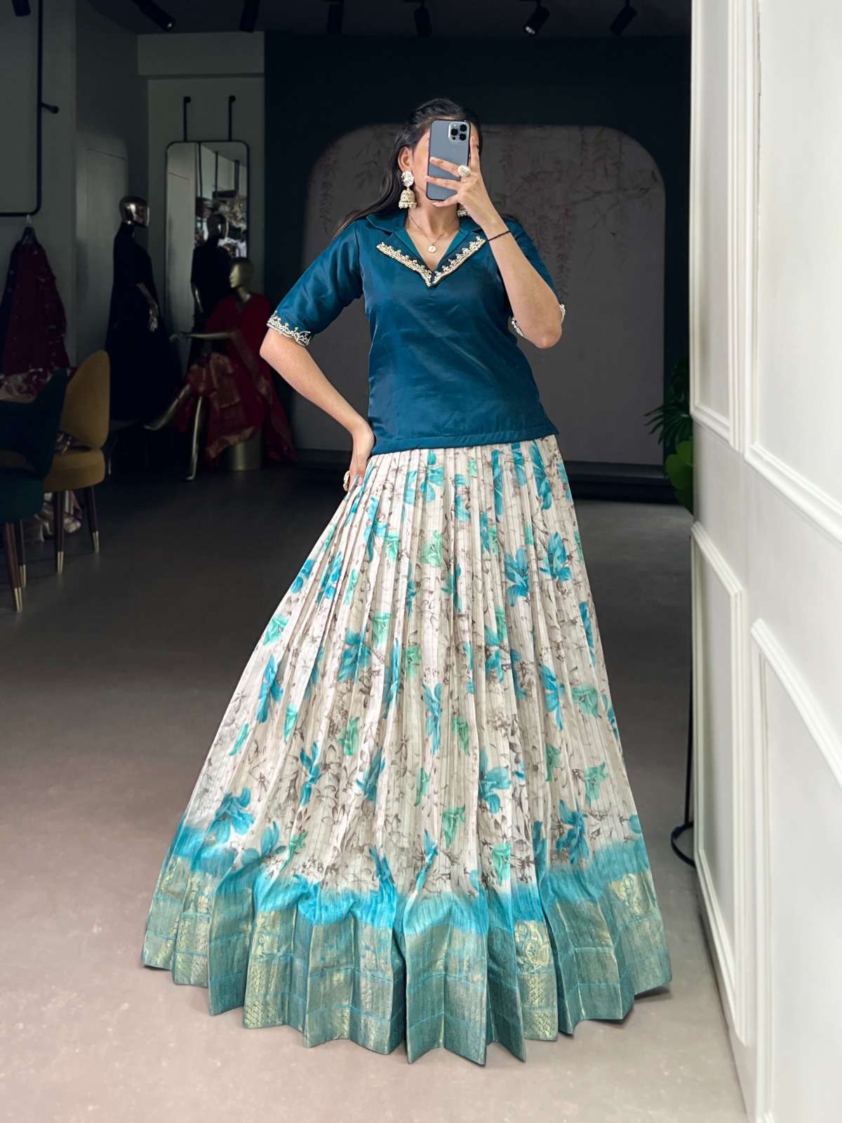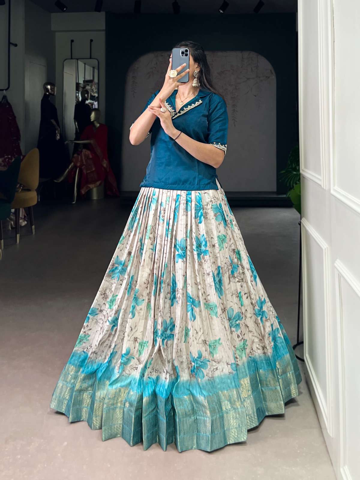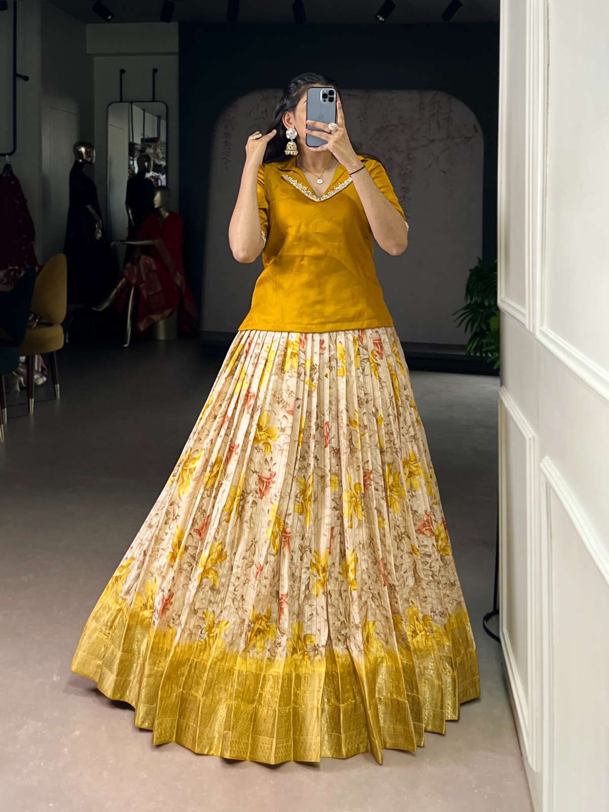 Every occasion in style with these elegant lehenga co-ords — featuring soft floral prints, luxurious borders, and vibrant blouses that radiate pure festive energy. 🌼