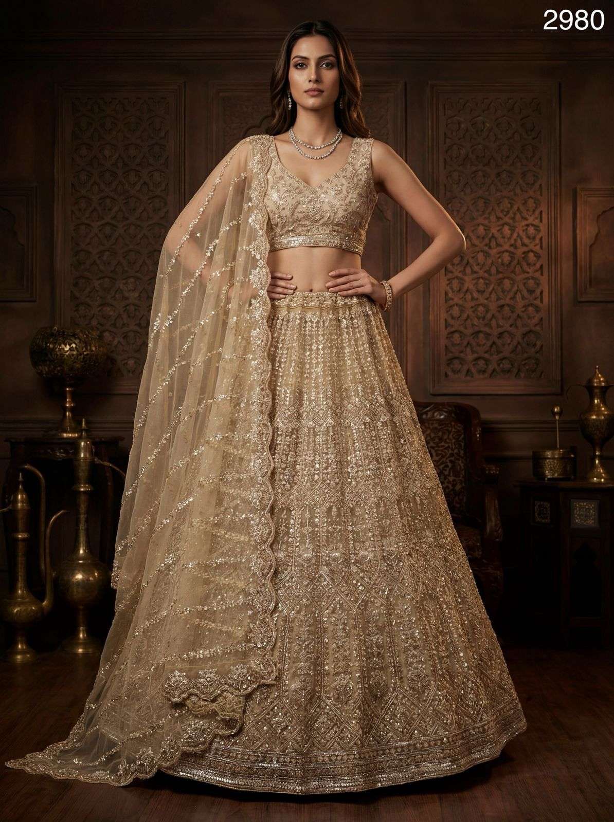 Code : 2980 Lehenga : Fabric - Net Work - Detailed Handwork Motif Handwork Crystal Pipe work Sequins and Thread work Stitching - Standard Cancan and Canvas attached free size up to 42