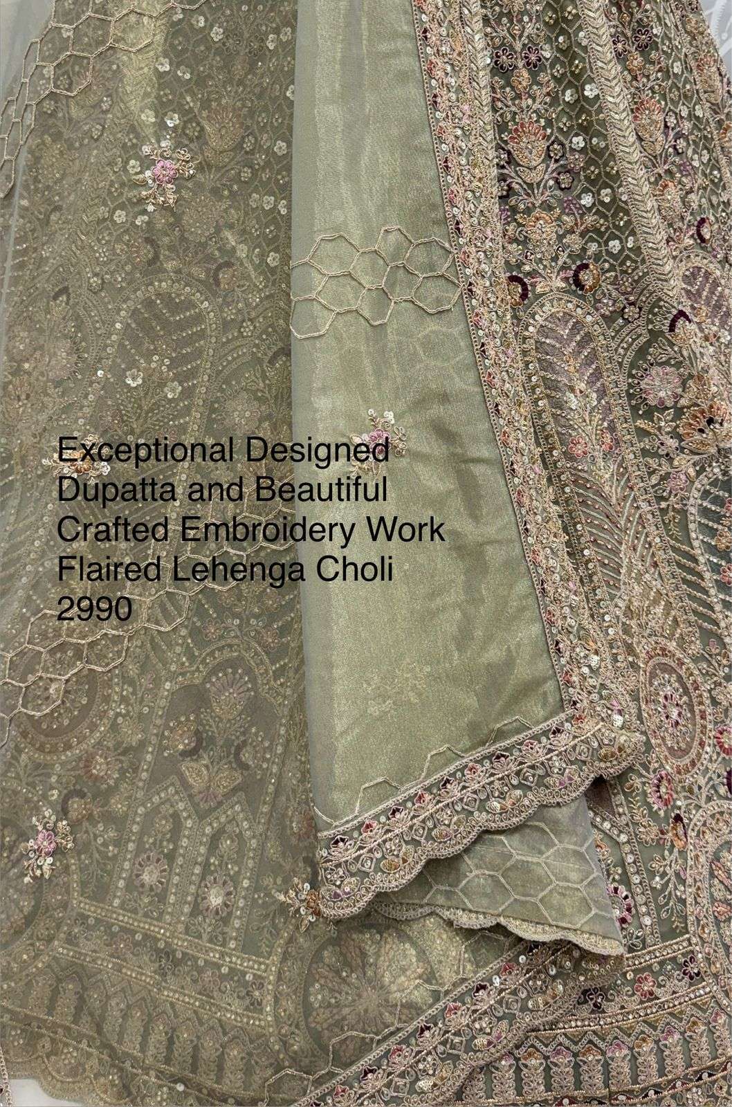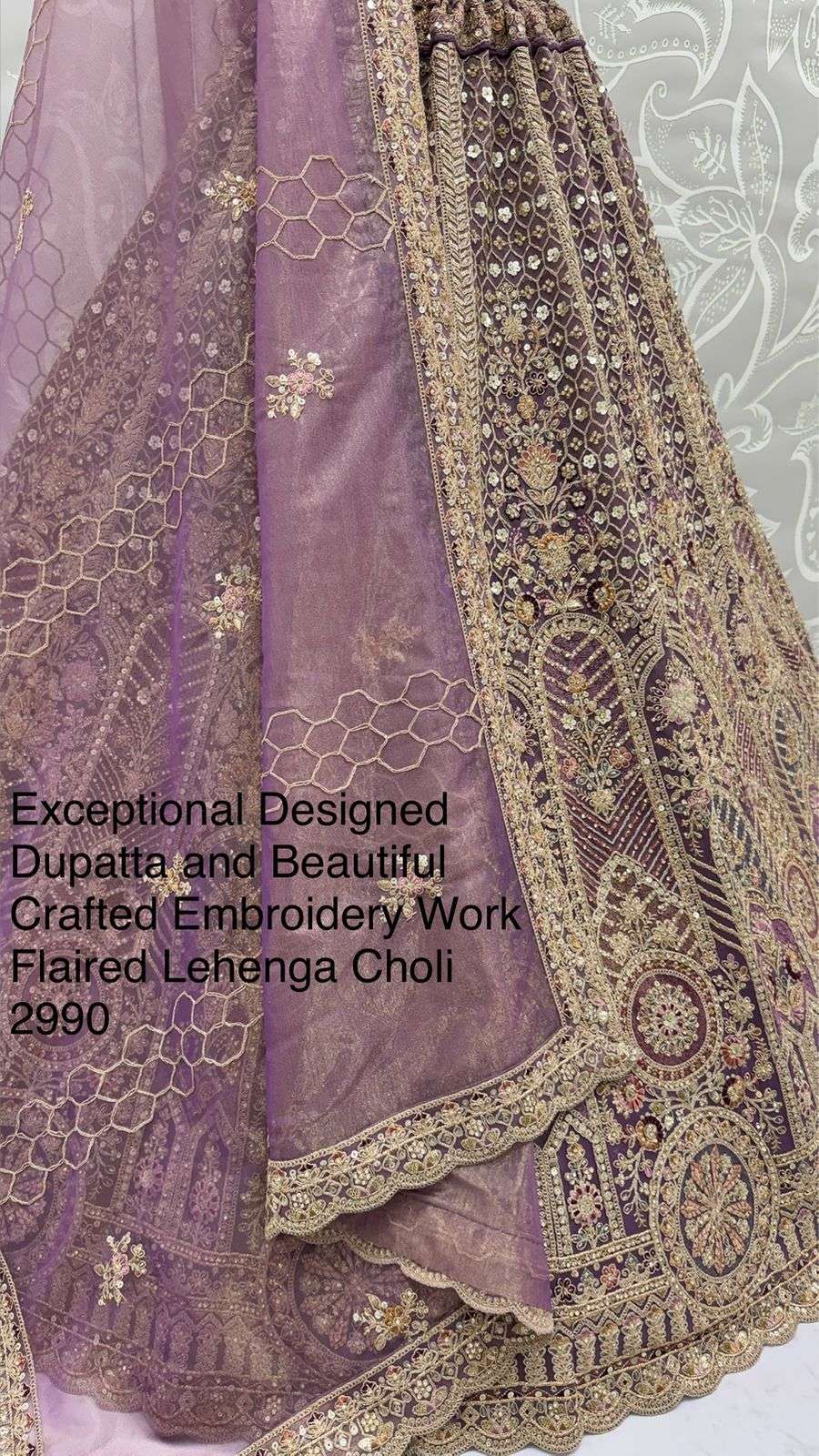 Code : 2990 (part 2) Lehenga : Fabric - Bridal Net Work - Fancy Chapat Zari Multi Thread Embroidery Dori Wor Sequince and Zircon Diamond Stitching - Standard Cancan and Canvas attached free size up to 42 Flair - Four Meter Plus