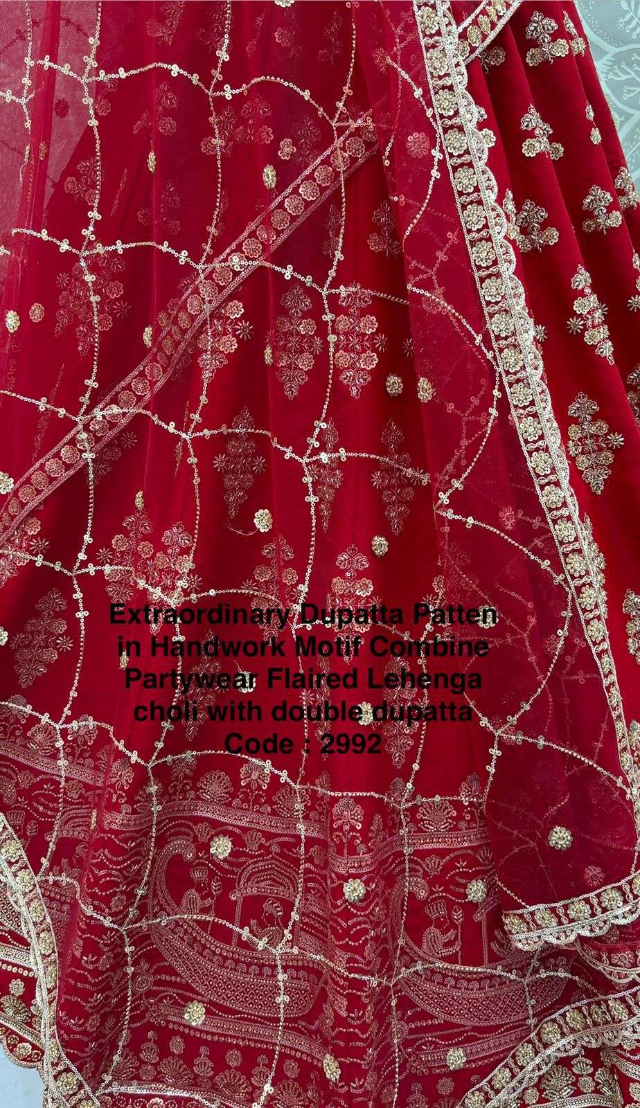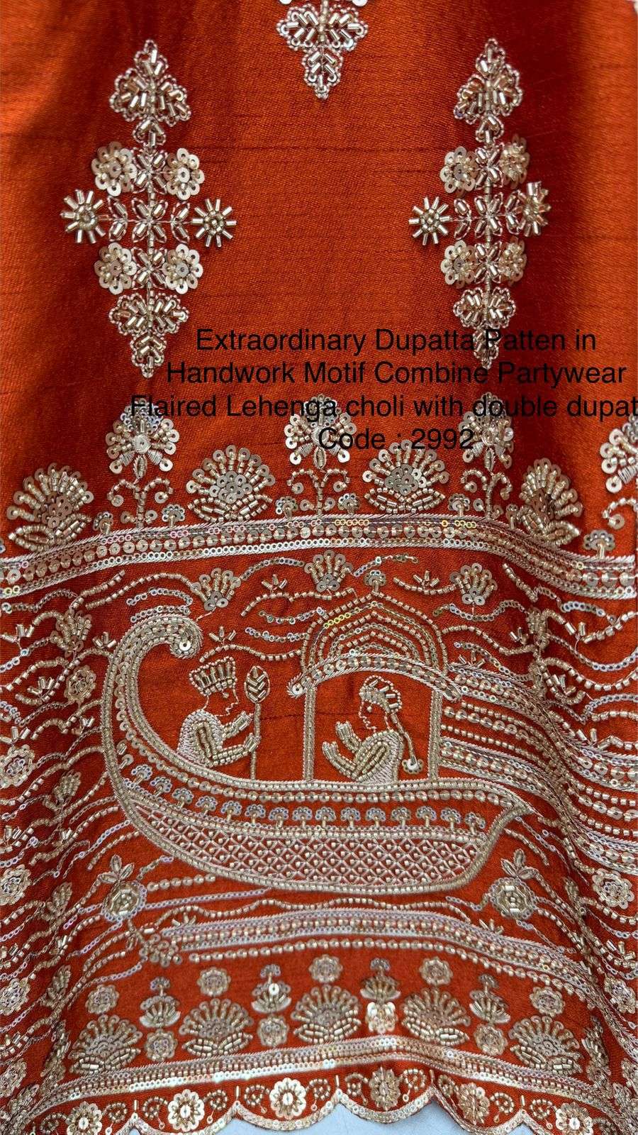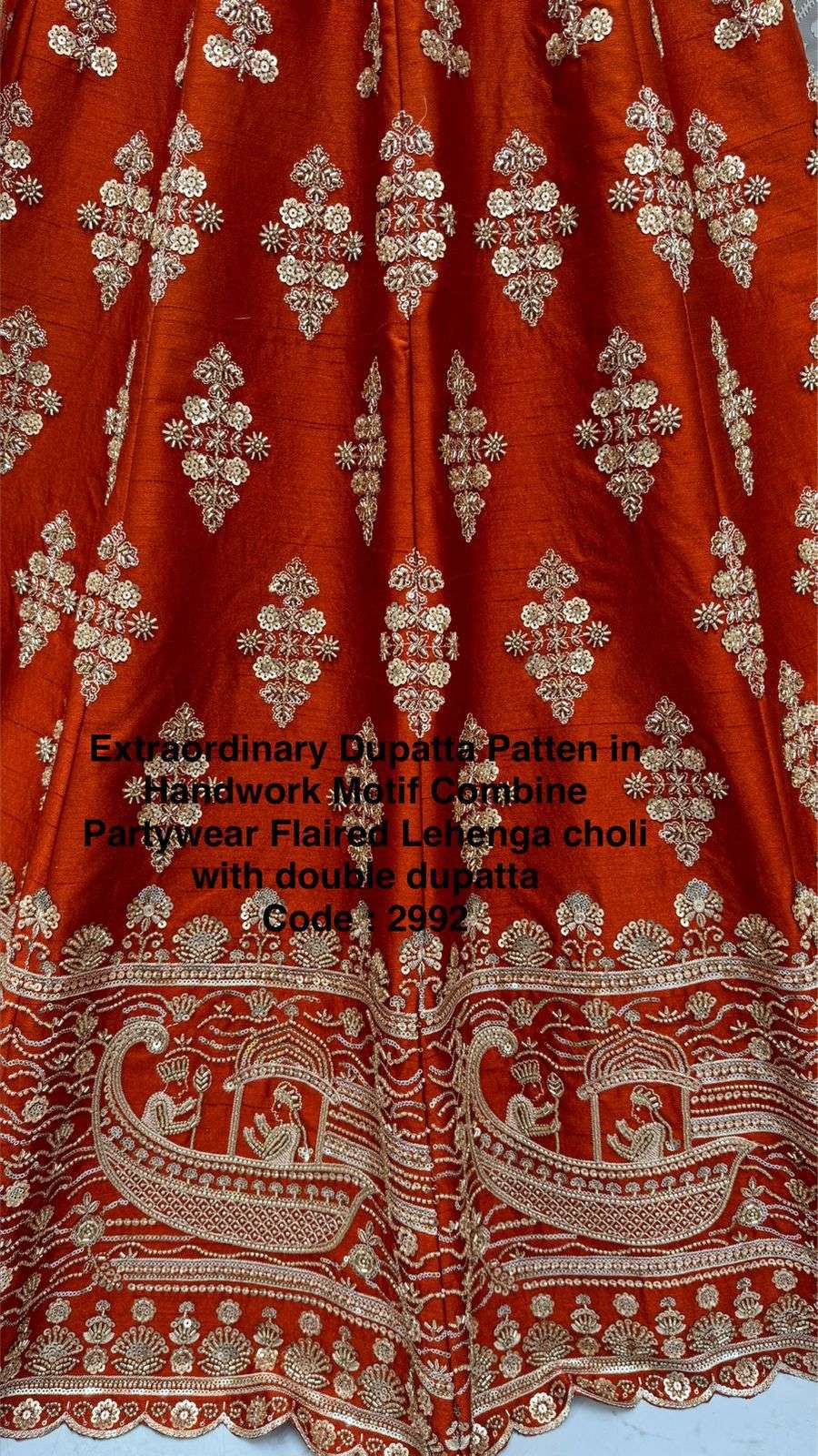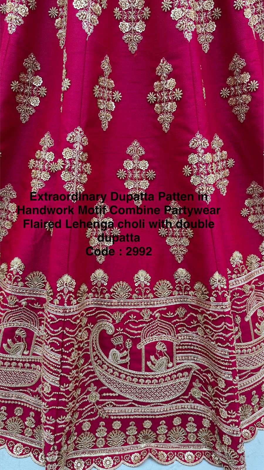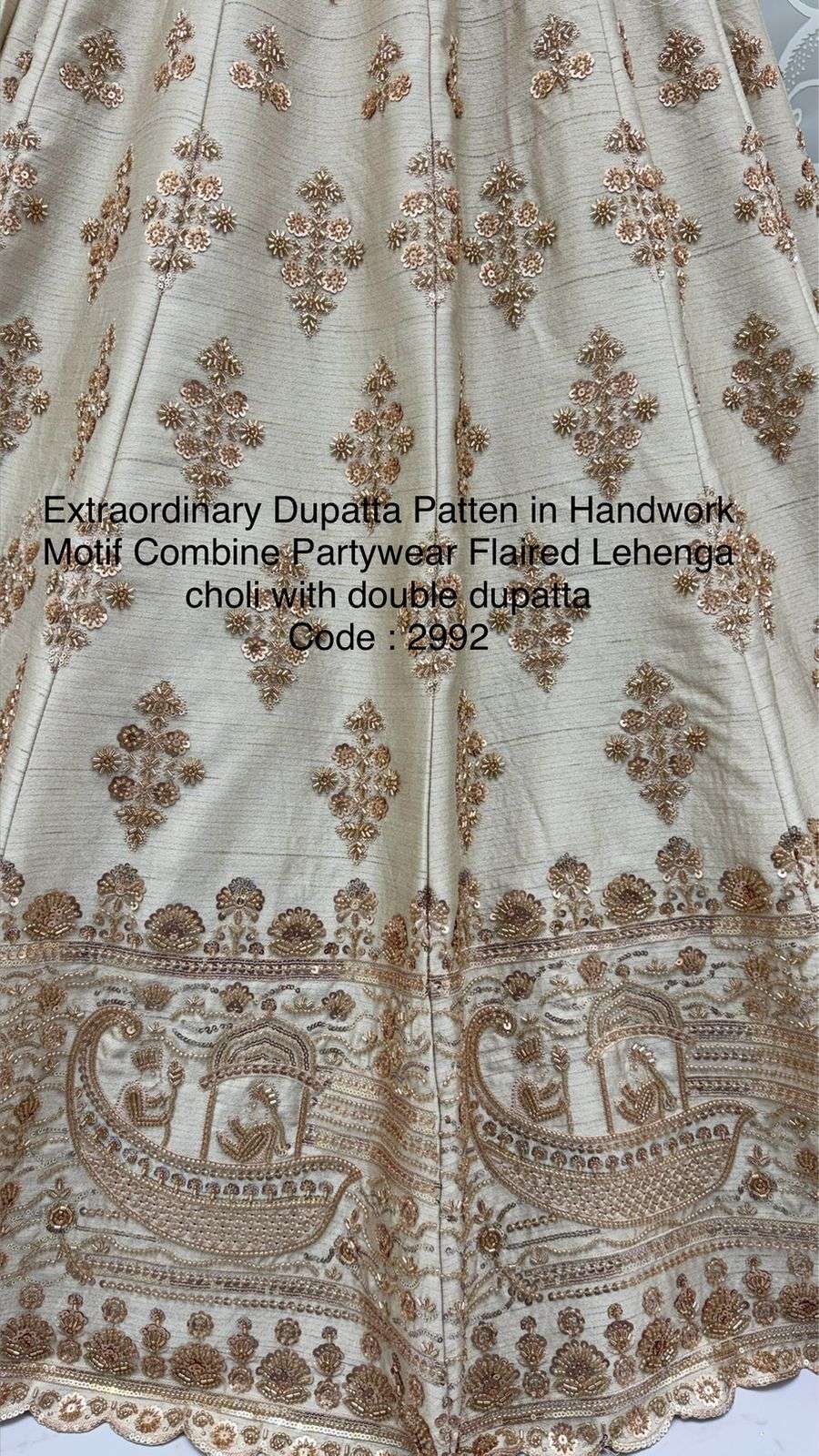 Code : 2992 Lehenga : Fabric - Slub Silk Work - Motif Work Various Sequence Zari and thread work Crystal pipe Handwork Stitching - Standard Cancan and Canvas attached free size up to 42
