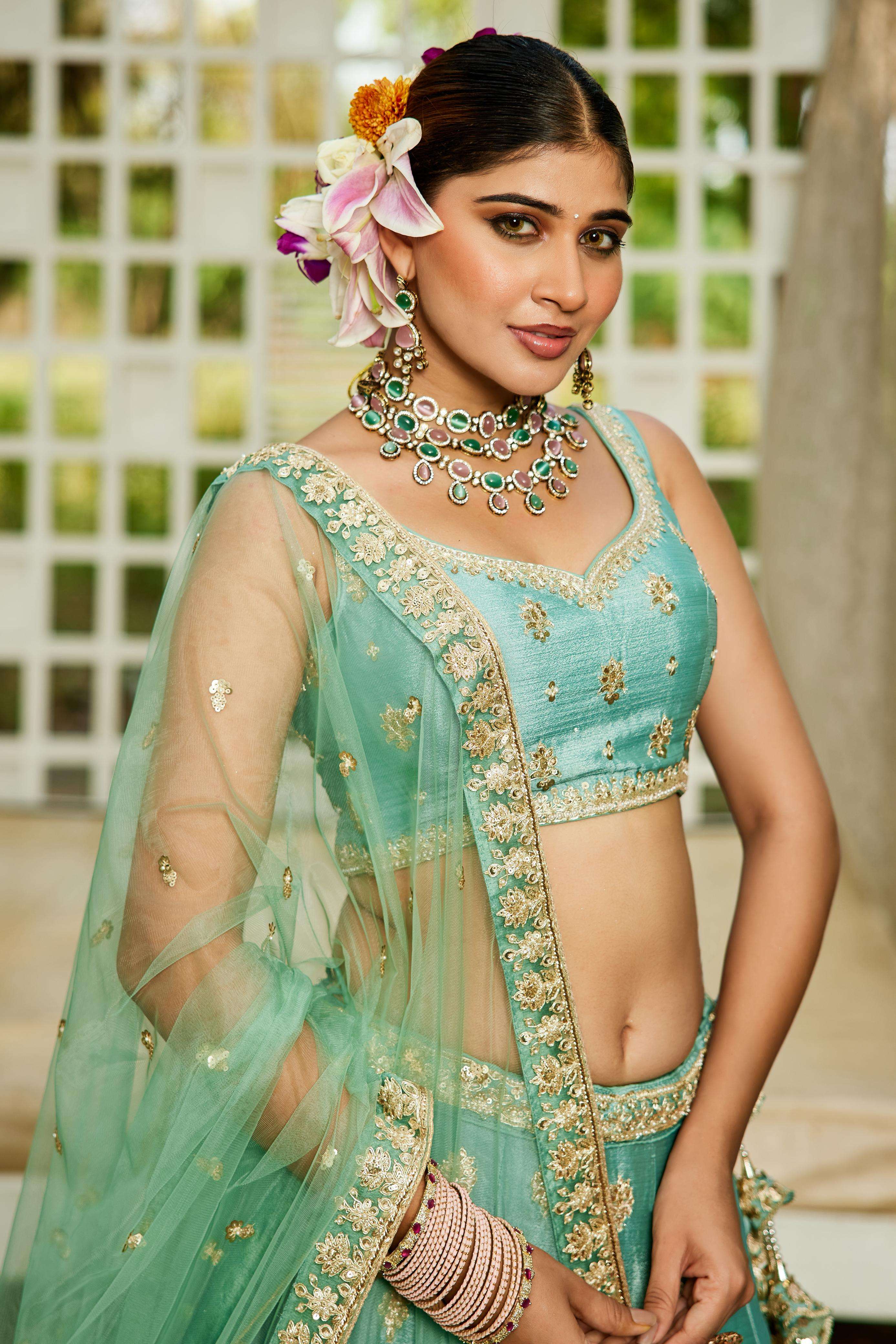Chinnon Sequinse embroidery Semi-Stitched Lehenga choli & Dupatta"• Lehenga:- Made of premium quality Lime Green Colour Chiffon fabric Full Flaire Semi-Stitched Lehenga With Sequinse and Coding work has a thread Embroidery work. Has a thread work border on the hemline.