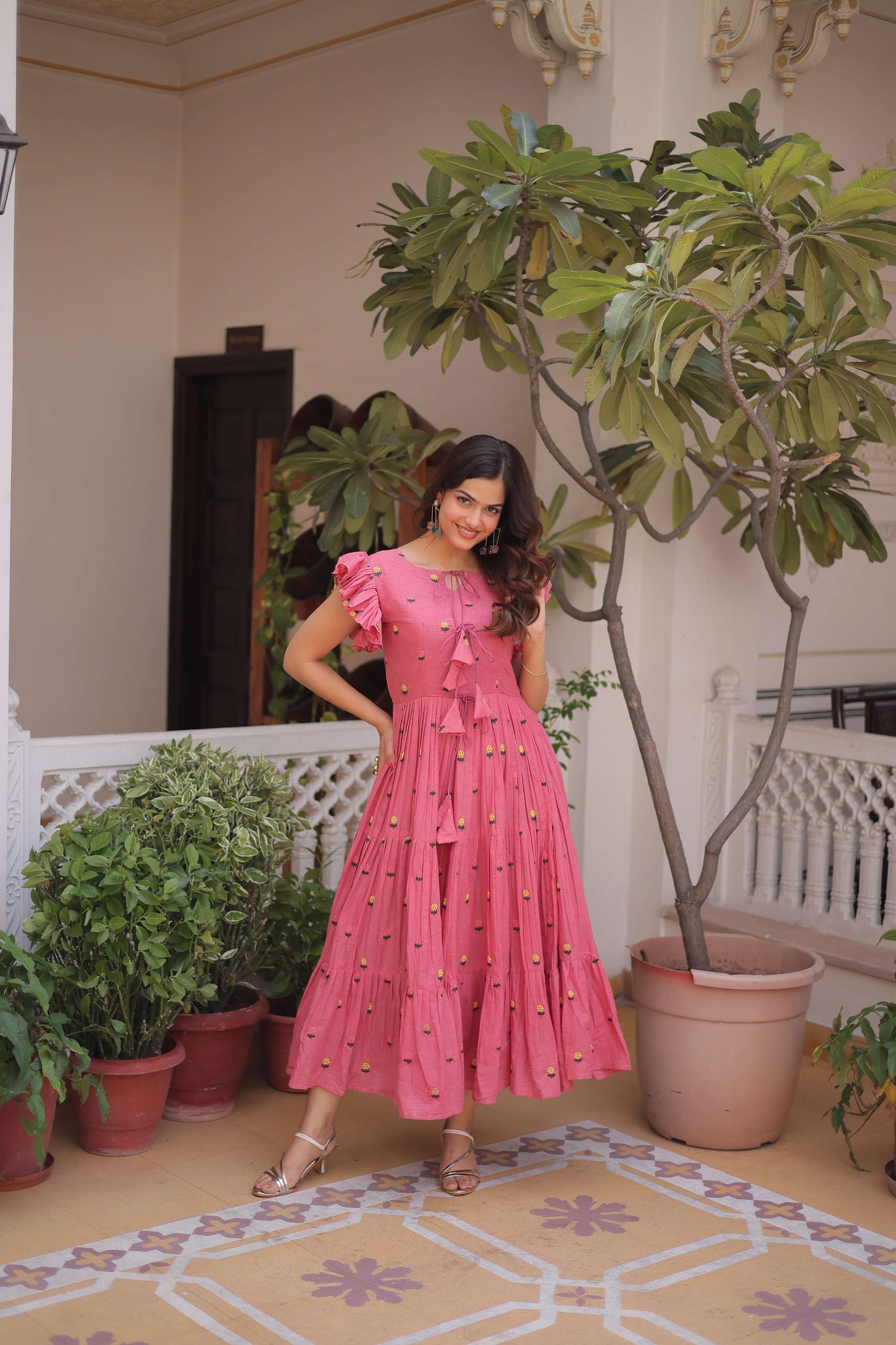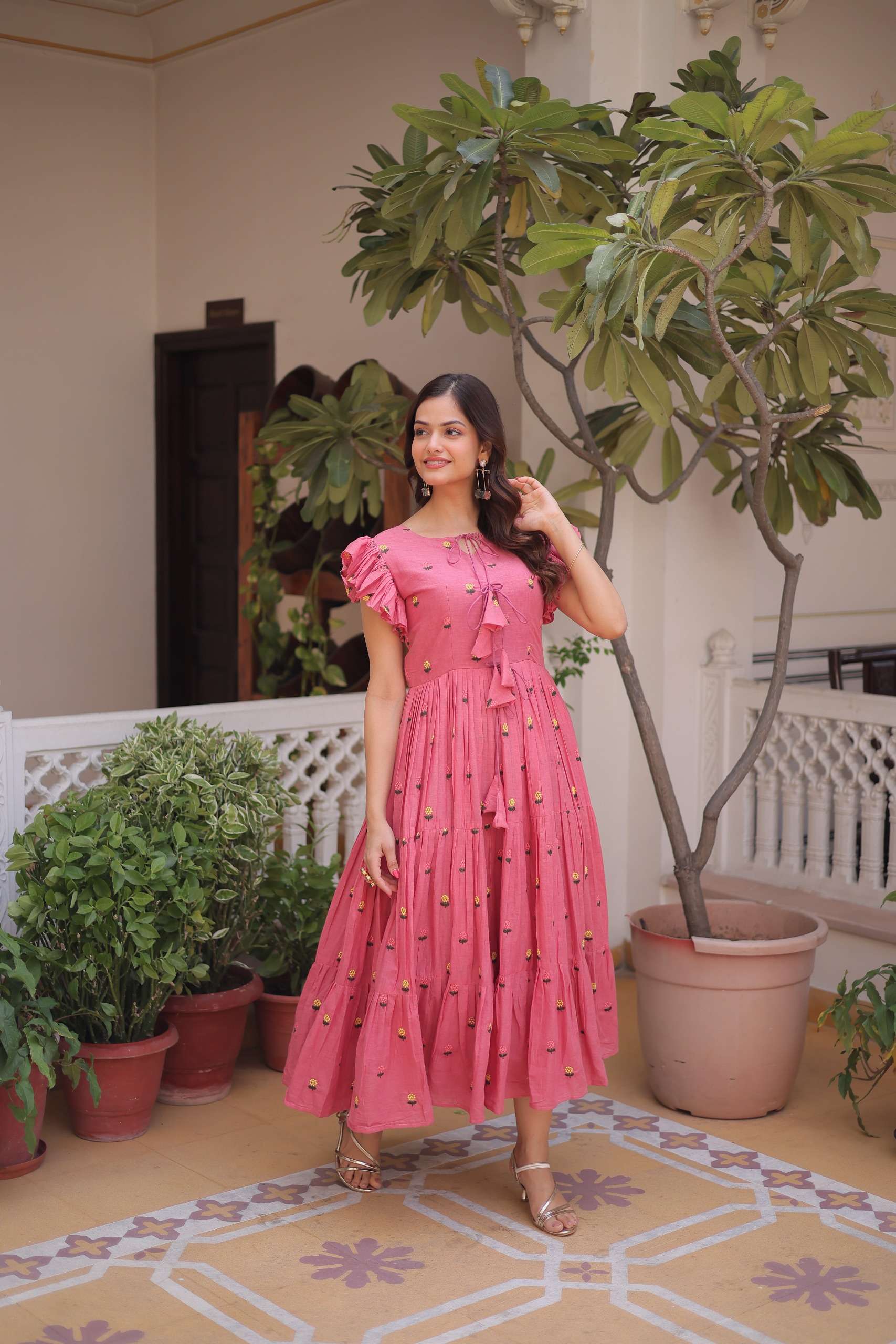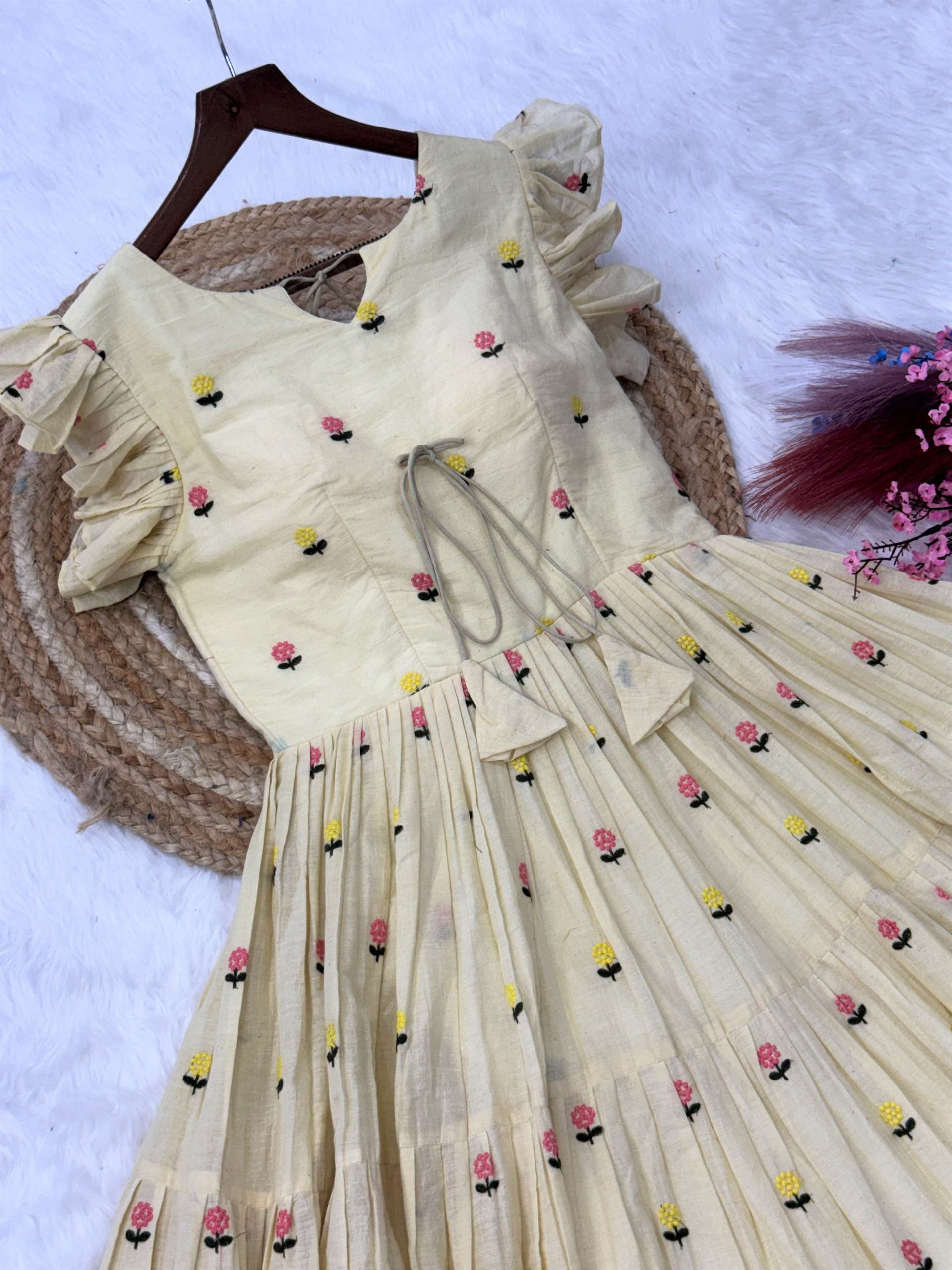 👉🏻 *KURTI :-* 👇🏻 👉🏻 *FABRICS & WORK :-* Cotton With Embroidered Work 👉🏻 *SIZE :-* M(38"), L(40"), XL(42"), XXL(44") 👉🏻 *LENGTH :-* 48 INCH 👉🏻 *SLEEVES:-* Sleeveless (Shoulder Frill Stitching) 👉🏻 *FLAIR :-* 6 MTR 👉🏻 *NECK TYPE :-* Fancy Round Neck 👉🏻 *STITCHING TYPE :-* Standard Stitching with Frill pattern