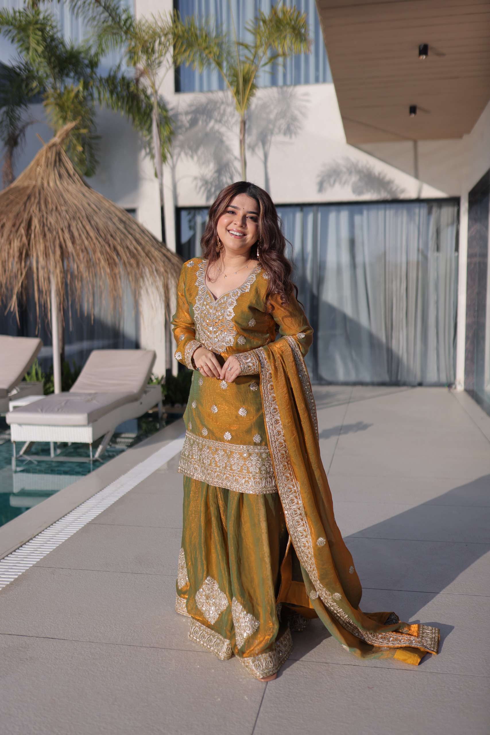 *SHARARA* :- (Full-Stitched) 👇🏻 *FABRIC & WORK* :- Fendi Chiffon with Zari Sequins Coding Embroidered work *LENGTH* :- 42 INCH *WAIST* :- 42 INCH *LINING* :- Cotton (Full Inner Top To Bottom) *STITCHING* :- Standard Stitching