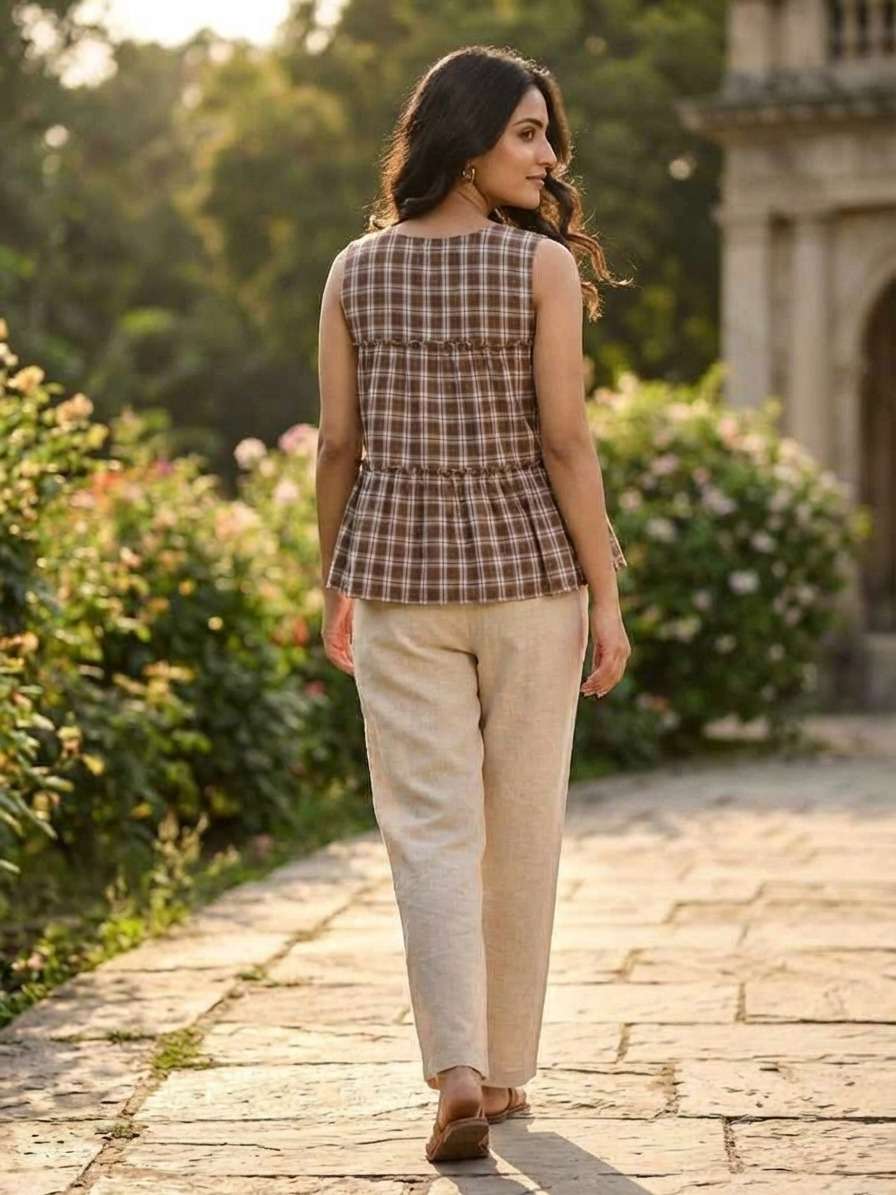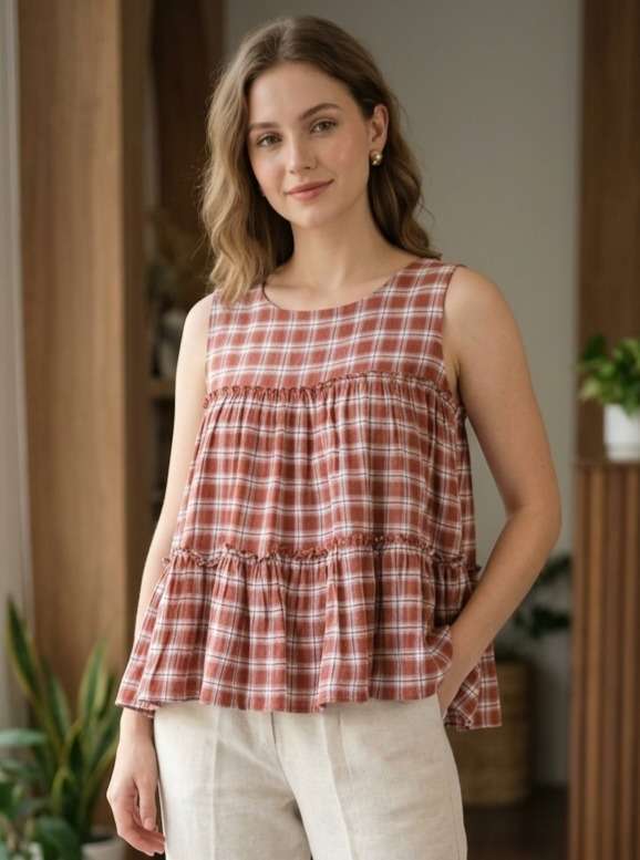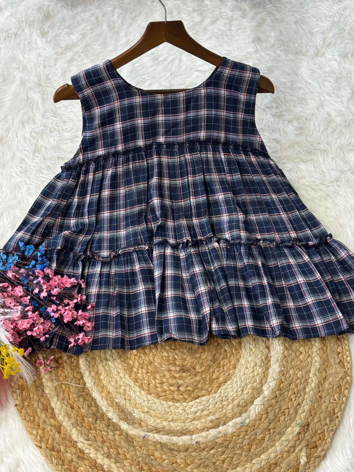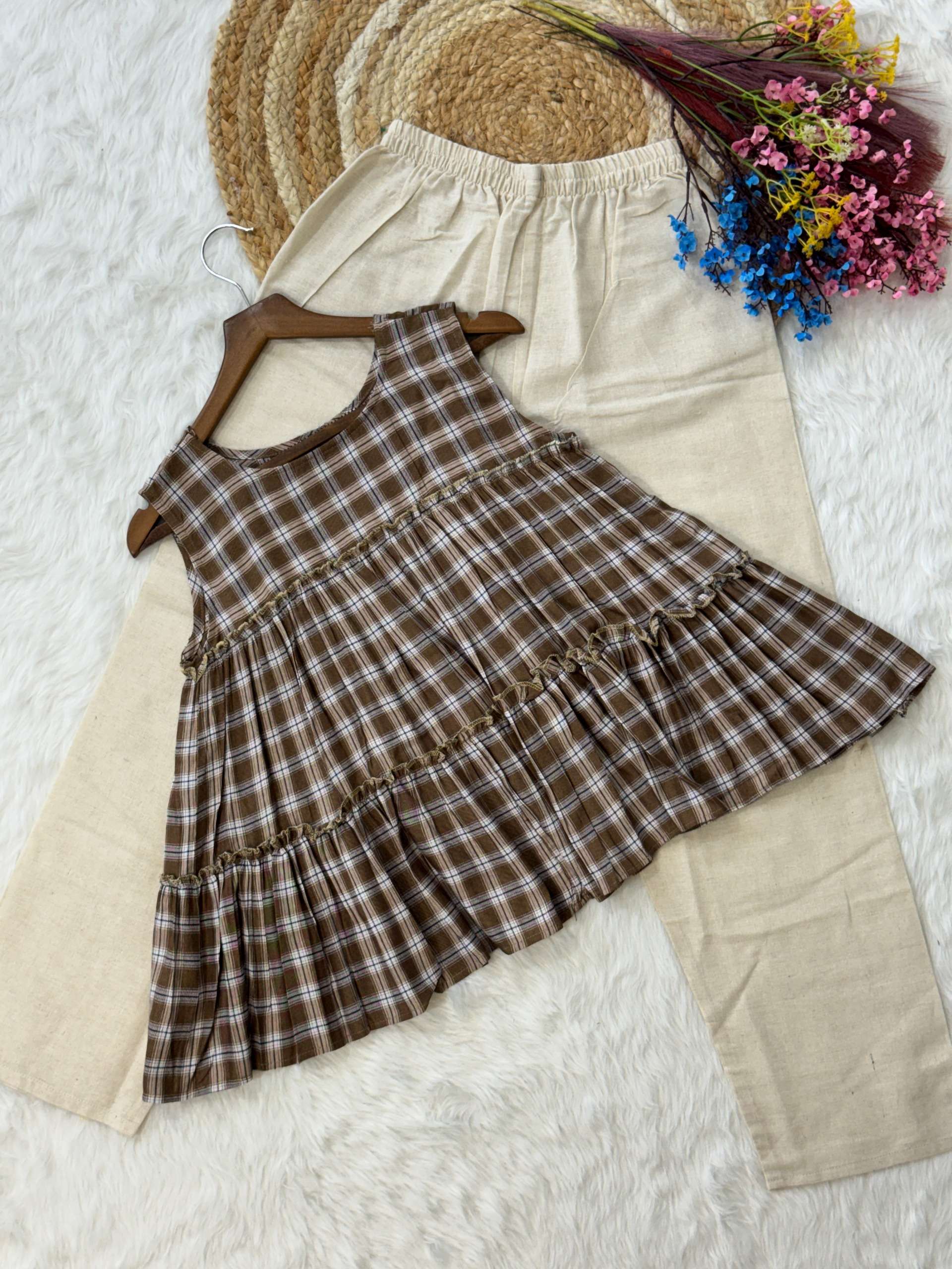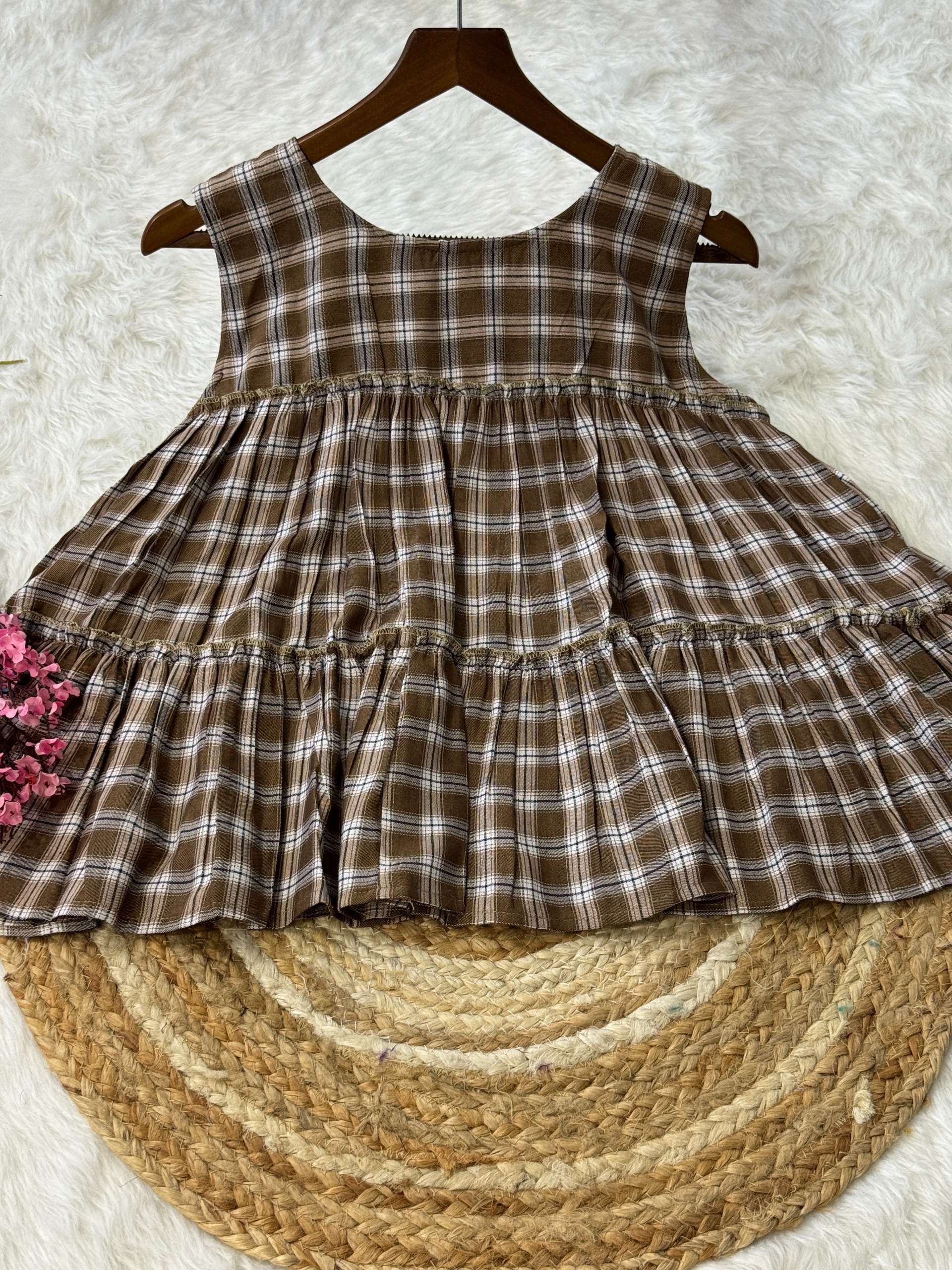 *TOP* :- 👇🏻 FABRICS :- Checks Linen Cotton LENGTH :- 28" FLAIR :- 3 Mtr SLEEVSES :- Sleevesless STITCHING :- Standard Frill stitch