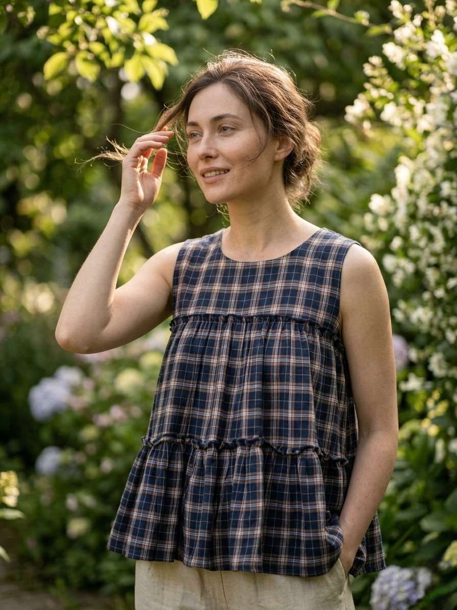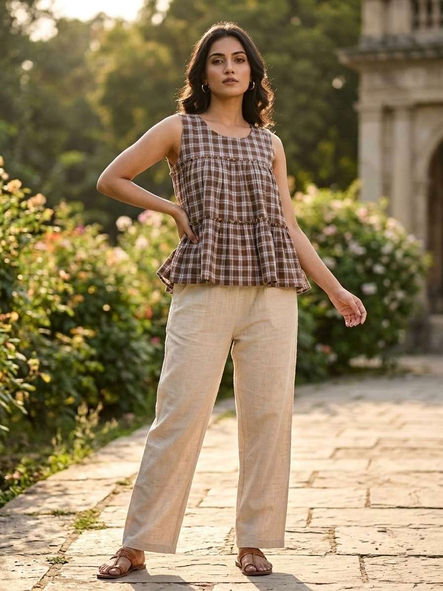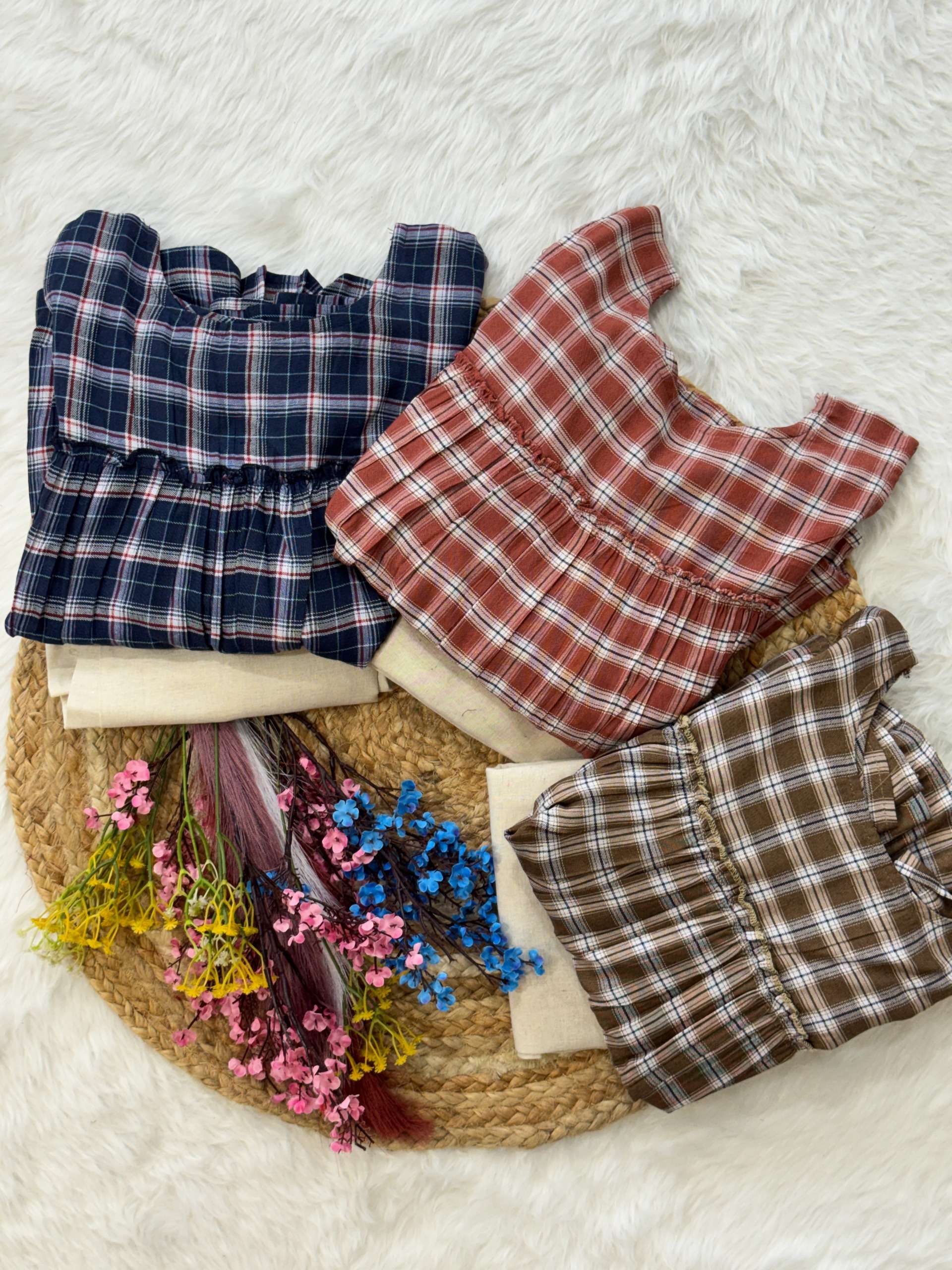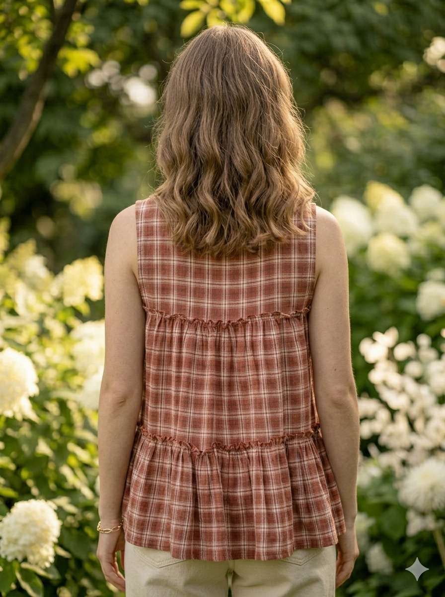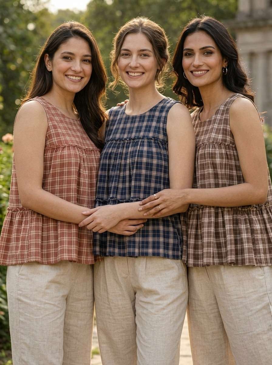 *TOP* :- 👇🏻 FABRICS :- Checks Linen Cotton LENGTH :- 28" FLAIR :- 3 Mtr SLEEVSES :- Sleevesless STITCHING :- Standard Frill stitch