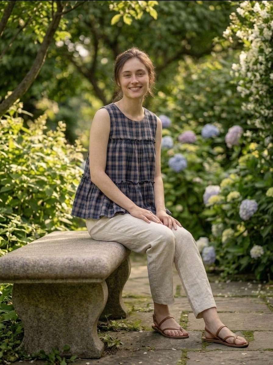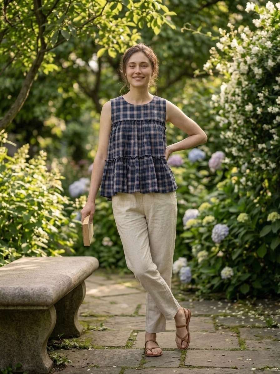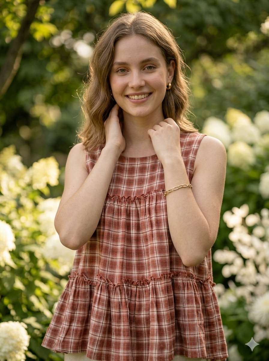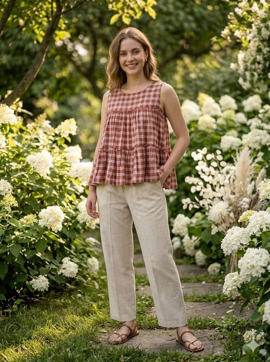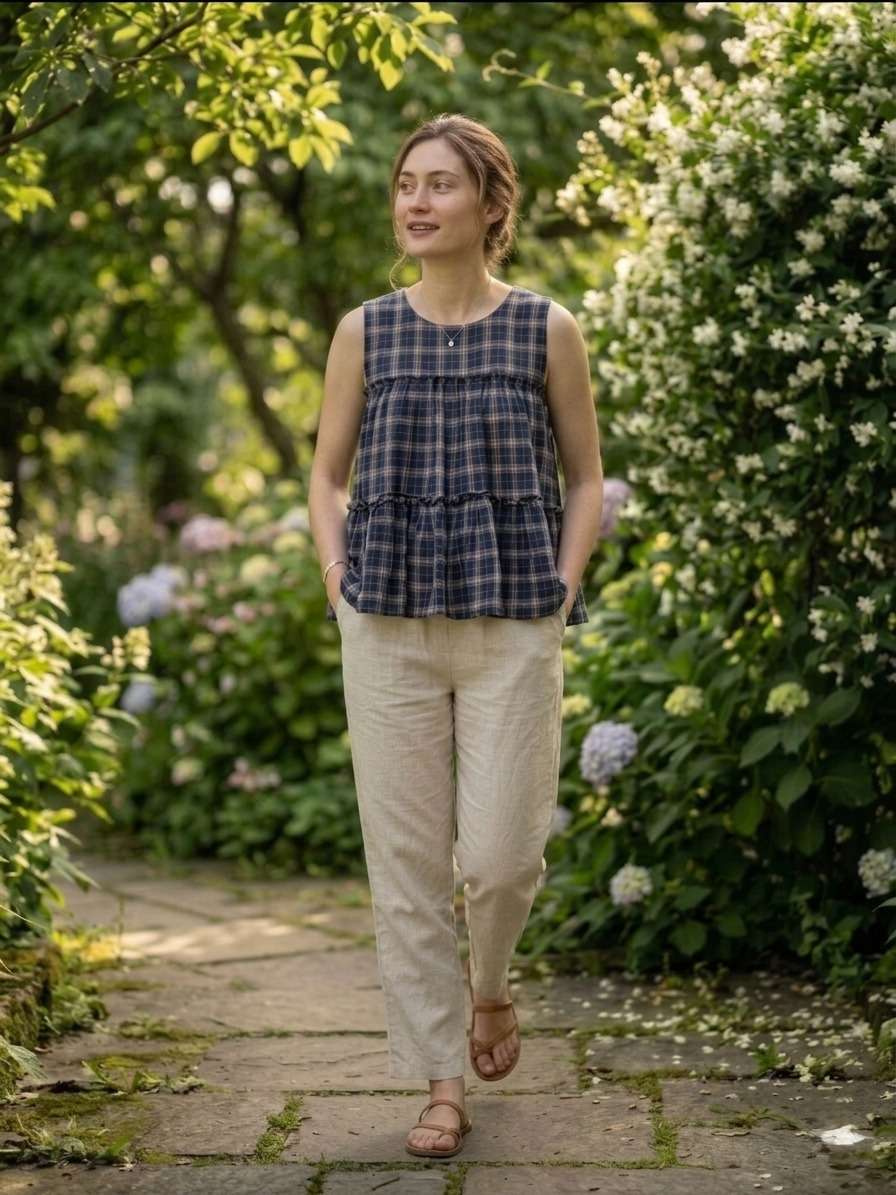 *TOP* :- 👇🏻 FABRICS :- Checks Linen Cotton LENGTH :- 28" FLAIR :- 3 Mtr SLEEVSES :- Sleevesless STITCHING :- Standard Frill stitch