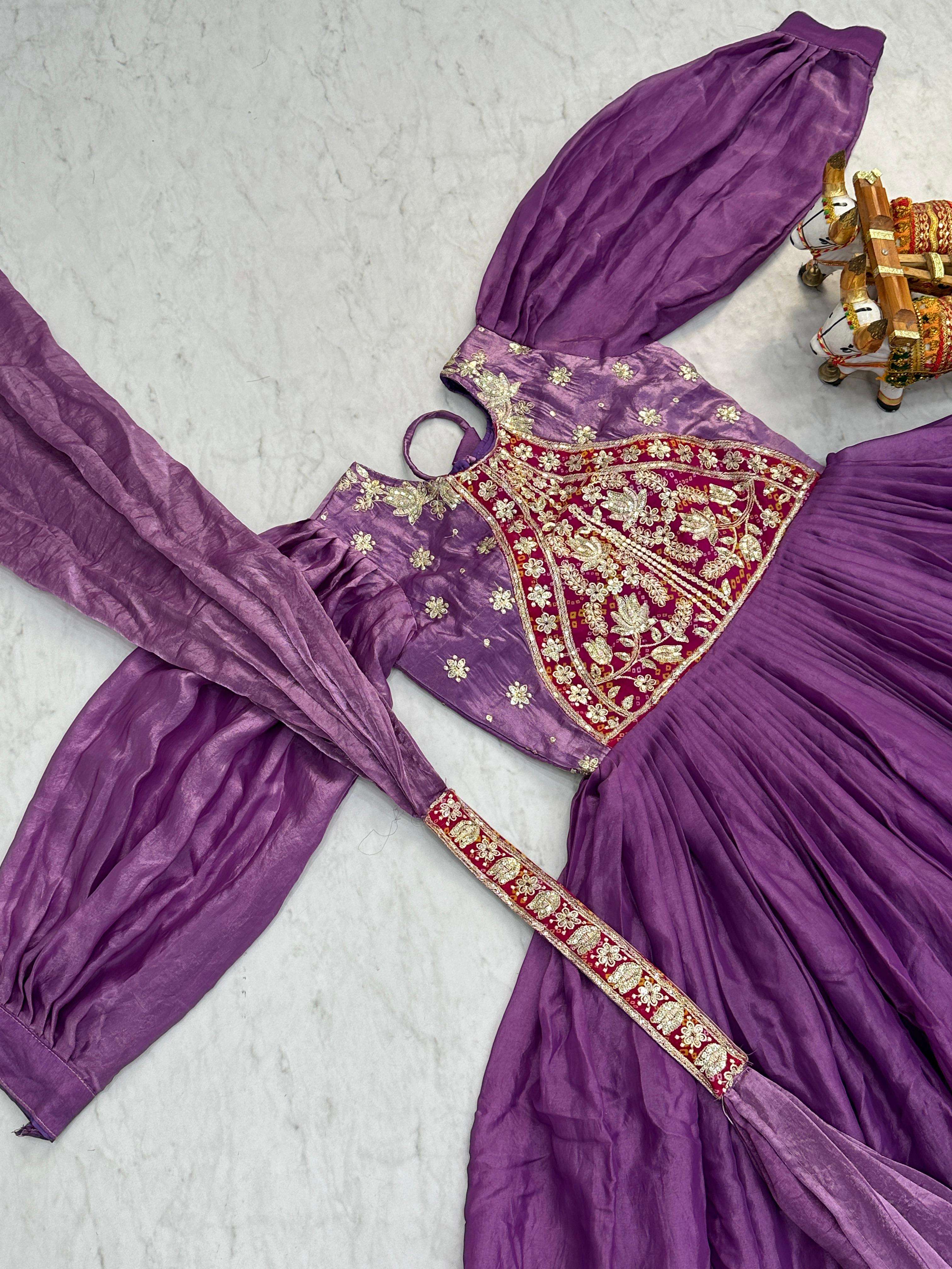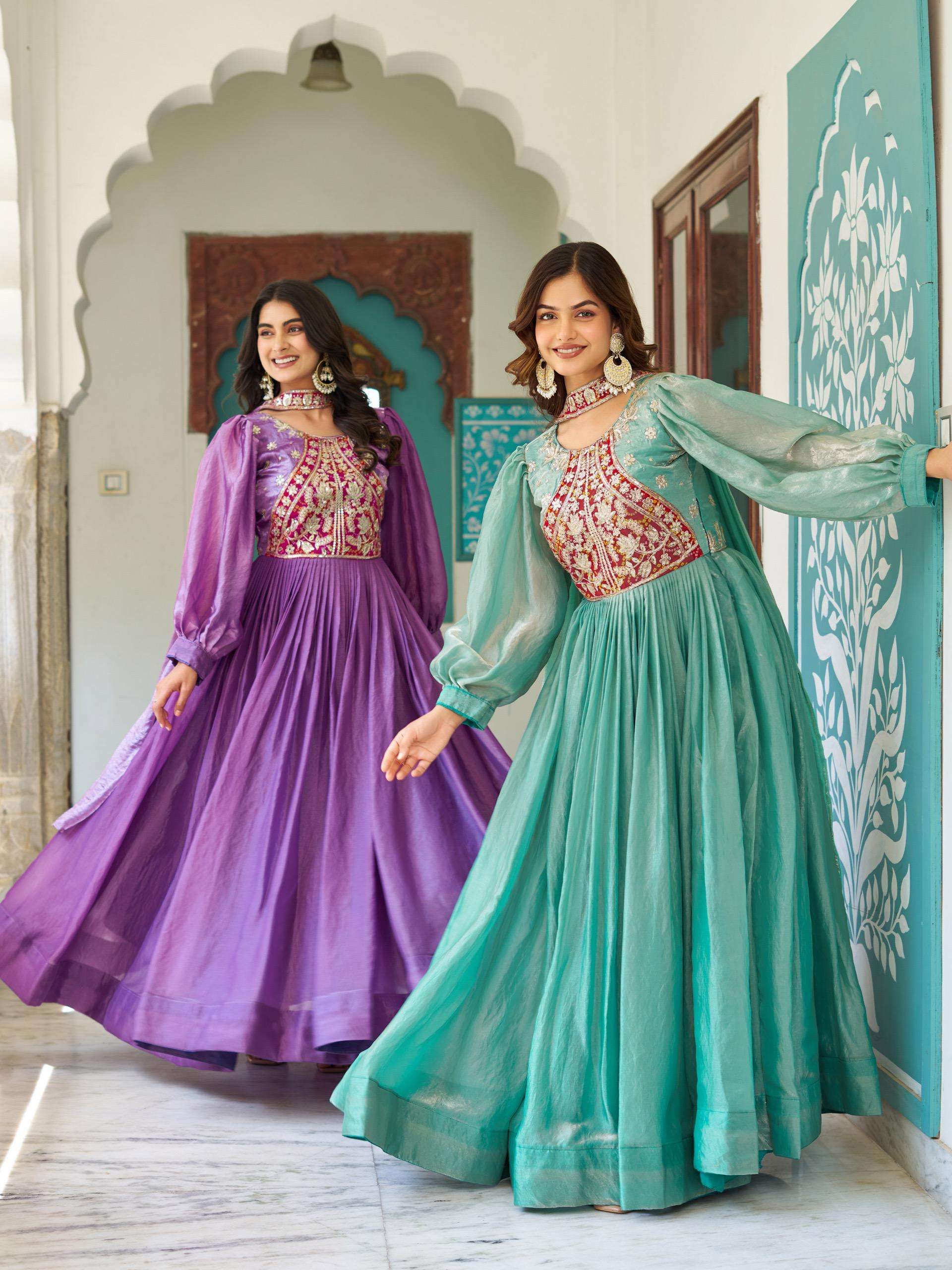 *👗Gown👗* *Fabric:-* Fendy silk *Work:-*Heavy sequence & Thread Embroidery Work *Inner:-* Micro Cotton *Flair*:-3.50 mtr *Size:-* M upto L margin XL upto 2xl margin *(Fully Stitched)*