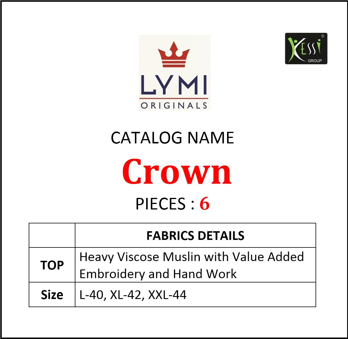 ? *LYMI (Kessi Fabrics Pvt. Ltd.)* has launched _Catalog name_ : *Crown* ? _Fabric Details_ ? ?Top :- Heavy Viscose Muslin with Value Added Embroidery and Hand Work ?Total Design :- 6 ?Rate:- Rs.999/- per Piece Set To Set. GST 5 Percent Extra ?Size;- L-40, XL-42, XXL-44 ?Dispatching 5 to 6 days later ?Booking started from now... ?Order yours soon.... |
