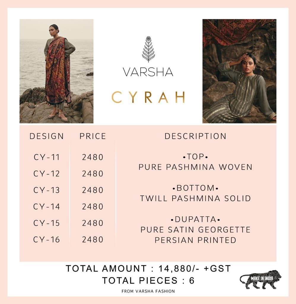 Buy Online Cyrah By Varsha Pashmina Suit Manufacturer And Dealer From India 6 Pcs of Full Catalogue at Wholesale Price. Looking for Cyrah By Varsha Pashmina Suit Manufacturer And Dealer From India Full Catalouge at Best Price? Buy Now Cyrah By Varsha Pashmina Suit Manufacturer And Dealer From India at Wholesale Rate of Rs 14880 with Total 6 Pcs from authroized dealer and supplier of Brand. Cost of Each piece is just only Rs 2480 which is very low and affordable price to resale the product in your retail store ,This is Surat based Wholesale Supplier & Dealer of Brand. Click on Brand name to Know more about Brand's products.Call or Whatsapp on 9898838984 for booking or enquiry