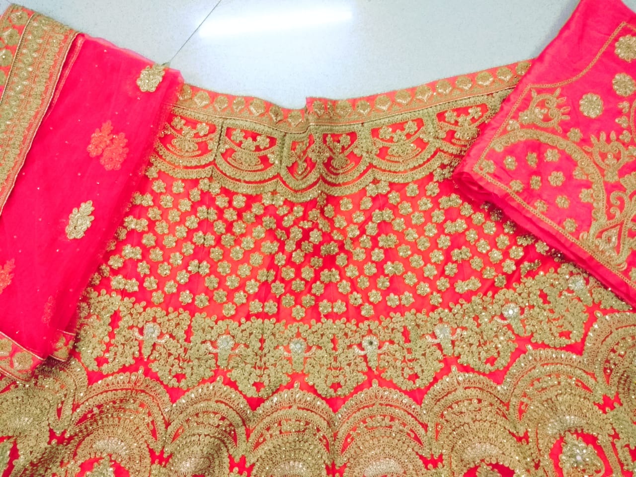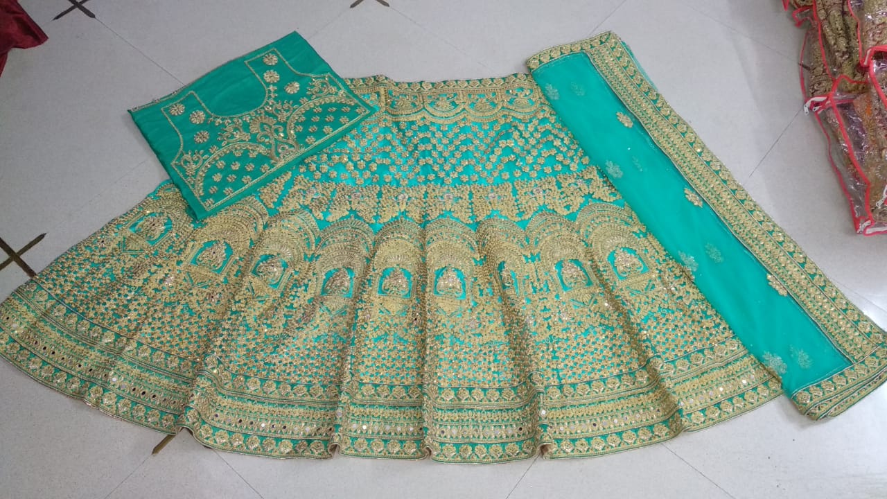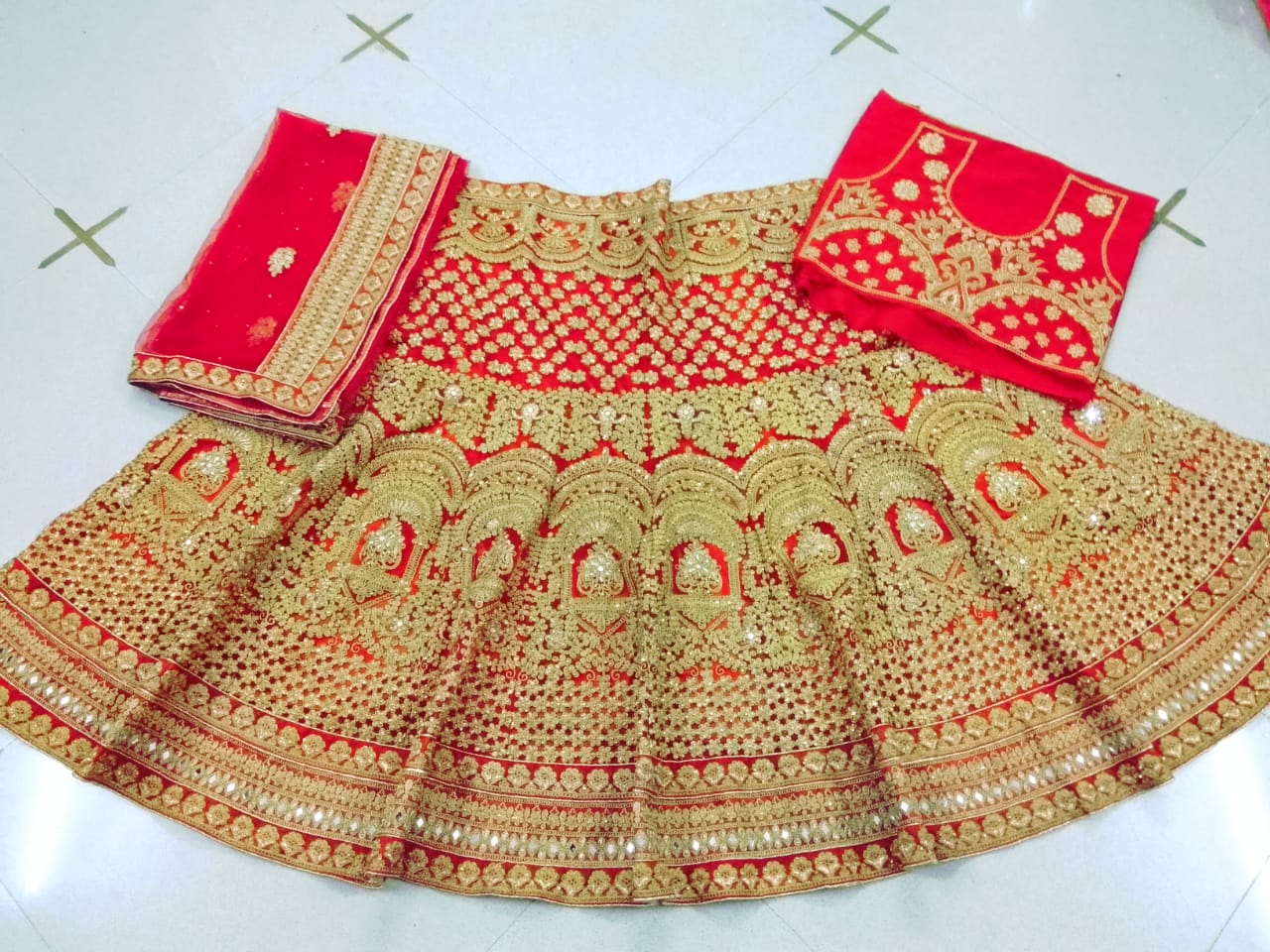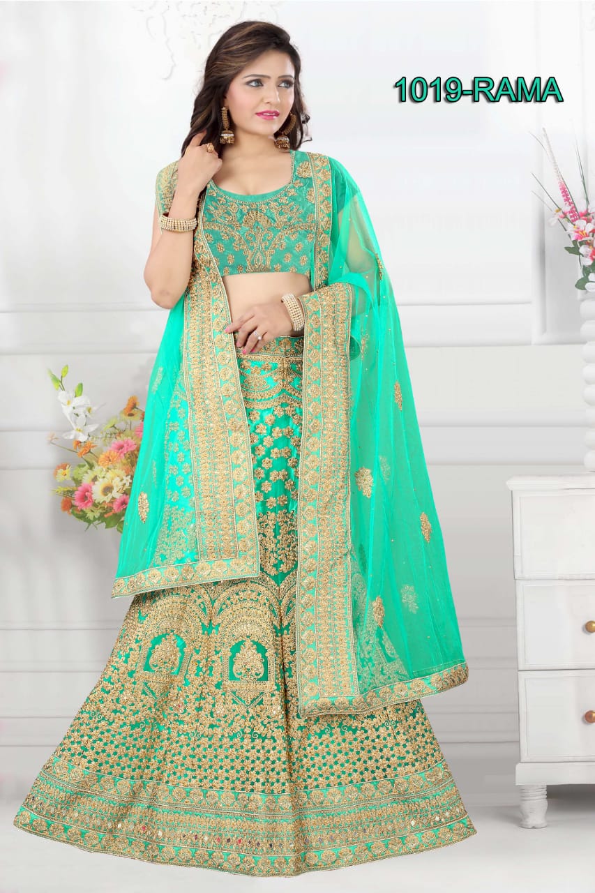 ??D.N.1019?? ??Type - Lehnga- Semi Stitched ??Colour - 3 (as shown in Red, Gujari & Rama) ??Lehnga- NET (Coding dori+ Zari Work + Diamond work) ??Inner- Satin ??Blouse- BANGLORI SILK (0.8 meter) ??Duppata- Net (2.5mtr) (Lace border+ Diamond work) ??Length Ghagra- 44inch ??Waist Size - 44 (XXL) ?Weight - 1.5 kg per piece ?Price INR 2799/- ? per piece |