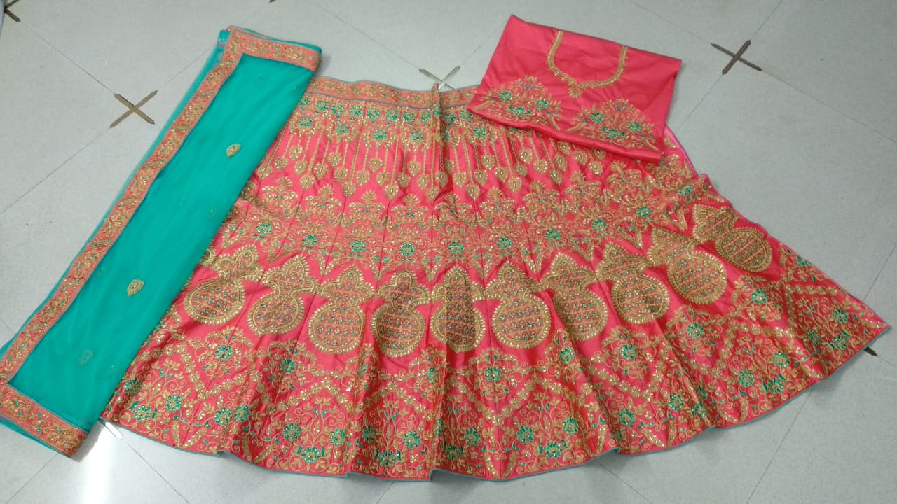 ??D.N.1045?? ??Type - Lehnga- Semi Stitched ??Colour - 4 (as shown in Pic) ??Lehnga-Â DEWSENA SILK (Embroidery dori+ Badla Zari Work + Diamond work) ??Inner- Satin ??Blouse- DEWSENA SILK (0.8 meter) ??Duppata- Net (2.5mtr) (Lace border+ Diamond work) ??Length Ghagra- 44 inch ??Waist Size - 44 (XXL) ?Weight - 1.6 kg per piece ?Price INR 2449/- ? per piece For singleÂ?s price call or whatsapp on +919898838984 |