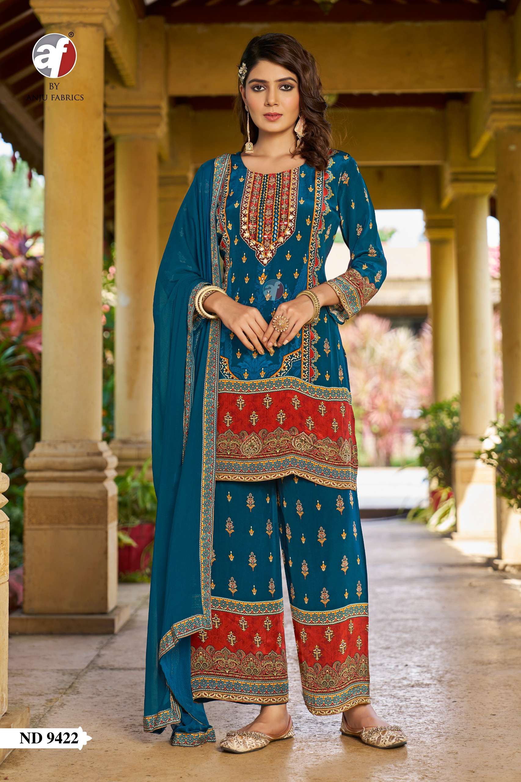 D NO ND 9422 9429 by Anju fabric SHORT KURTI PALAZZO DUPATTA collection manufacturers surat