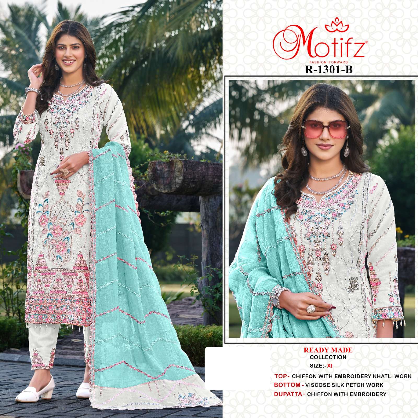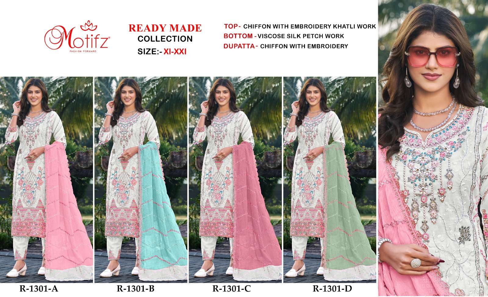Buy Online D no R 1301 by motifz suit collection manufacturers surat 4 Pcs of Full Catalogue at Wholesale Price. Looking for D no R 1301 by motifz suit collection manufacturers surat Full Catalouge at Best Price? Buy Now D no R 1301 by motifz suit collection manufacturers surat at Wholesale Rate of Rs 6796 with Total 4 Pcs from authroized dealer and supplier of Motifz Brand. Cost of Each piece is just only Rs 1699 which is very low and affordable price to resale the product in your retail store ,This is Surat based Wholesale Supplier & Dealer of Motifz Brand. Click on Brand name to Know more about Motifz Brand's products.Call or Whatsapp on 9898838984 for booking or enquiry