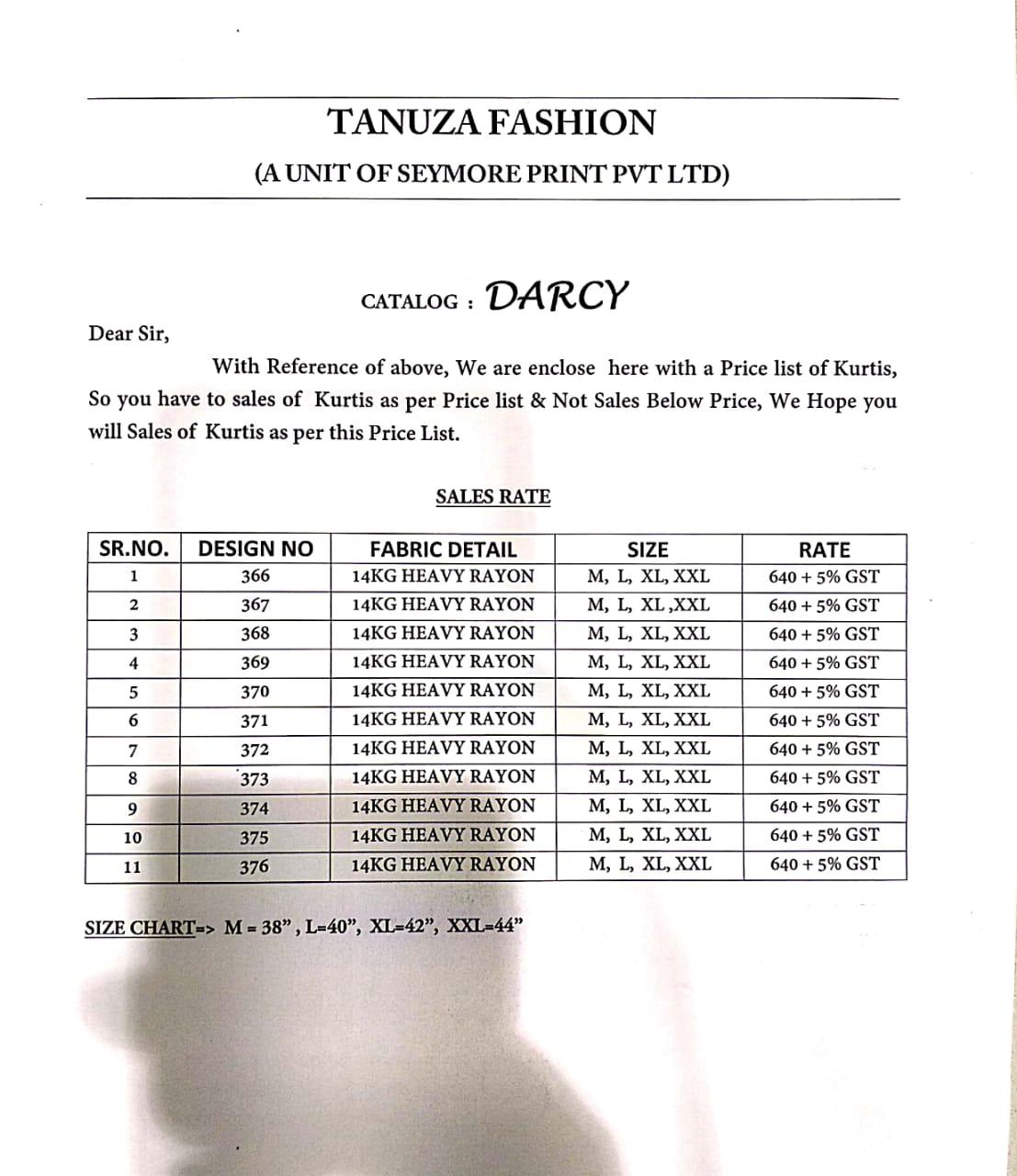 Brand - Tanuja. Catlog name - DARCY . Series -366 to 376. Set To Set. GST 5 Percent Extra. Delivery from tomorrow |