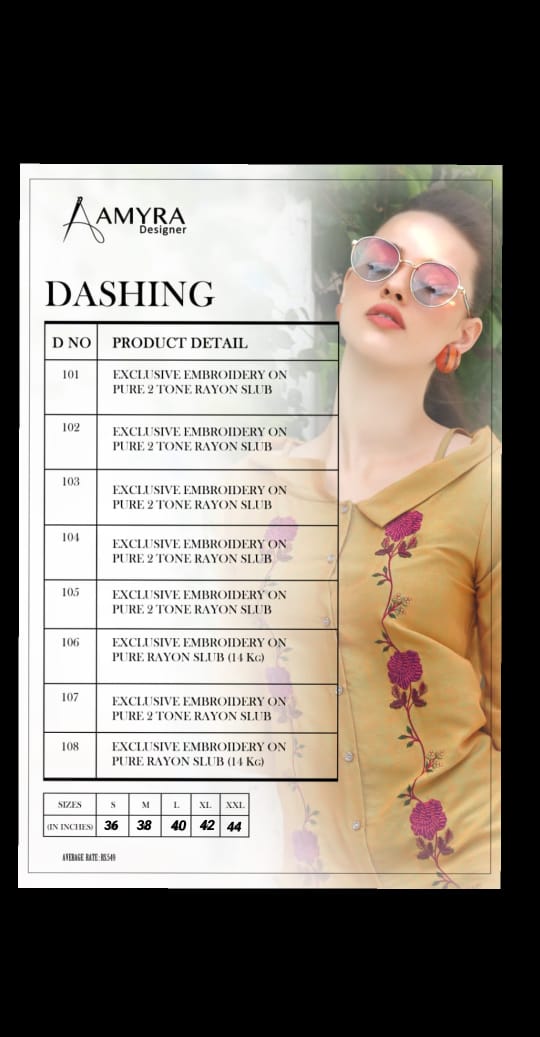 ?_AMYRA_DESIGNER_? Presenting our new catalogue ? *DASHING*? Fabric Detail? *?Top* :- HEAVY 2 TONE REYON SLUB COTTON & HEAVY REYON SLUB(14kg.) WITH EXCLUSIVE EMBROIDERY..... *Size L XL XXL 40 42 44 ?Designs: 8?? pcs catloge Rate- 4?9?9? |