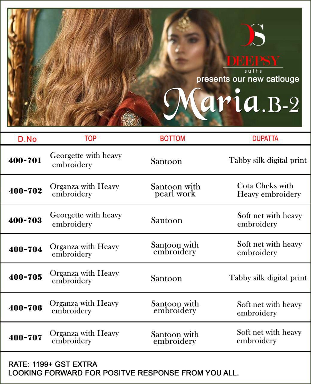 Buy Online Deepsy Maria B 2 Wholesale Dealer Supplier From Surat Bangladesh Wholesaler 7 Pcs of Full Catalogue at Wholesale Price. Looking for Deepsy Maria B 2 Wholesale Dealer Supplier From Surat Bangladesh Wholesaler Full Catalouge at Best Price? Buy Now Deepsy Maria B 2 Wholesale Dealer Supplier From Surat Bangladesh Wholesaler at Wholesale Rate of Rs 8393 with Total 7 Pcs from authroized dealer and supplier of DEEPSY Brand. Cost of Each piece is just only Rs 1199 which is very low and affordable price to resale the product in your retail store ,This is Surat based Wholesale Supplier & Dealer of DEEPSY Brand. Click on Brand name to Know more about DEEPSY Brand's products.Call or Whatsapp on 9898838984 for booking or enquiry