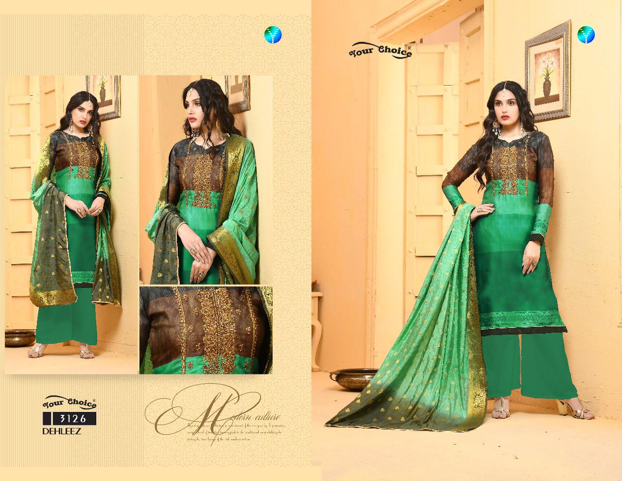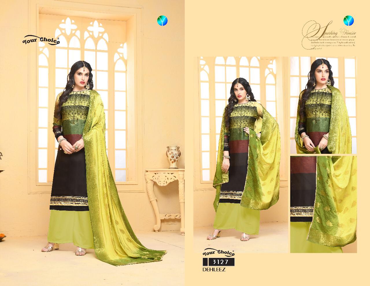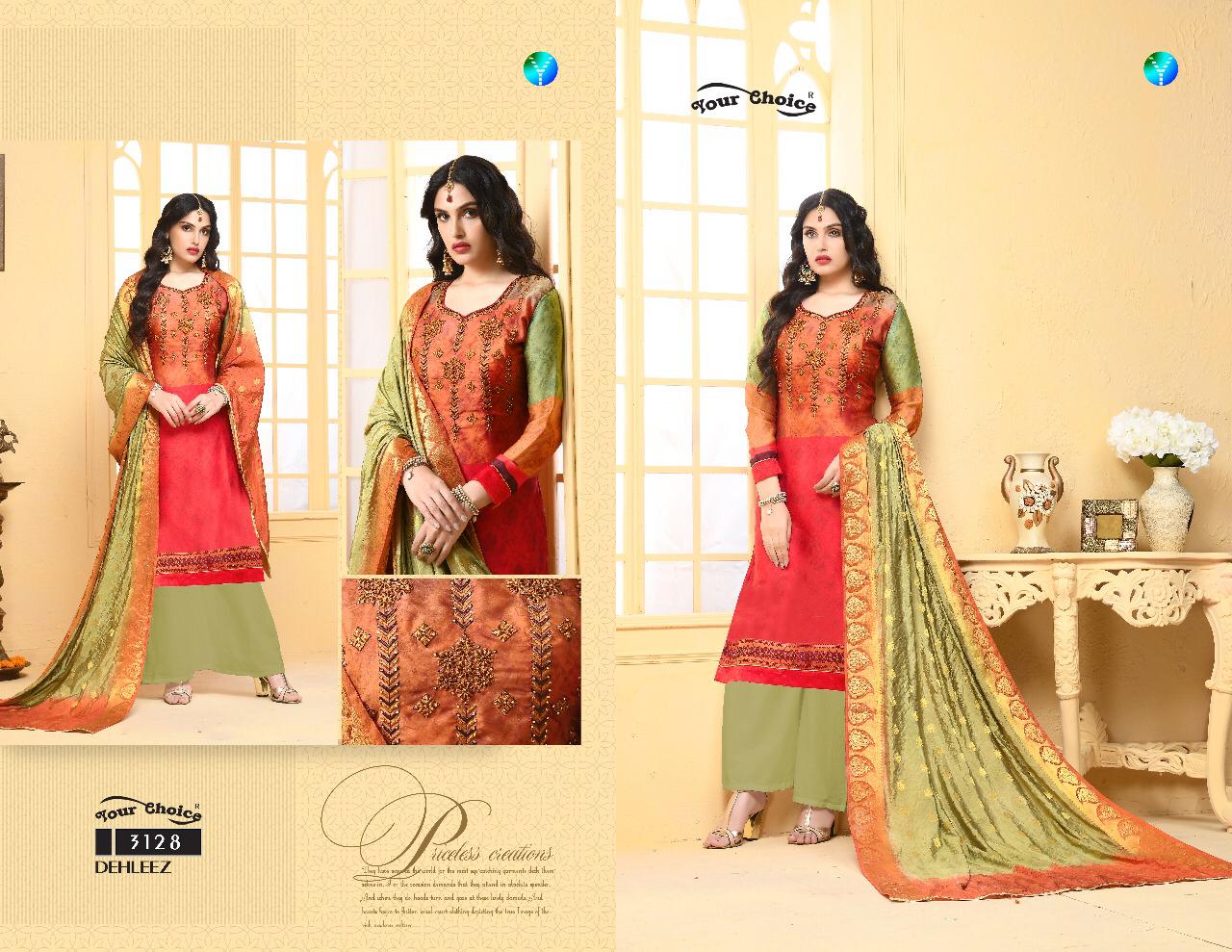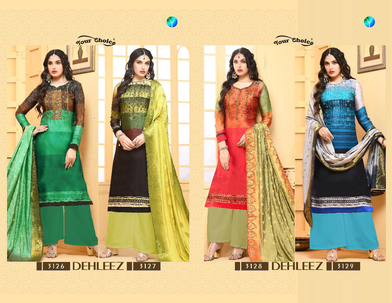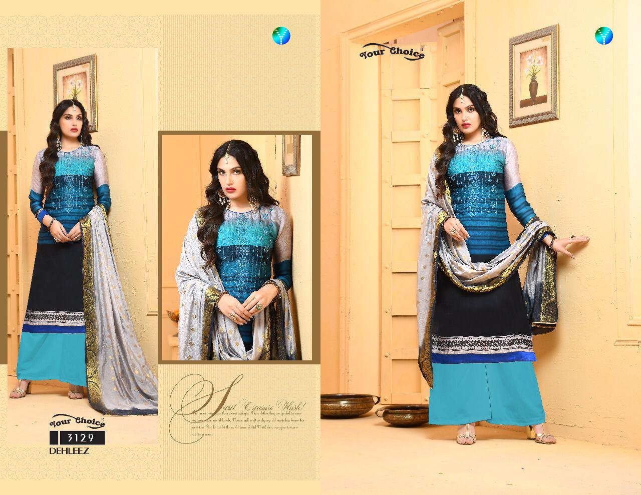 Buy Online Dehleej By Your Choice 3126 Series Fancy Designer Satin Georgette Sarara Suit Collection Wholesaler Surat 4 Pcs of Full Catalogue at Wholesale Price. Looking for Dehleej By Your Choice 3126 Series Fancy Designer Satin Georgette Sarara Suit Collection Wholesaler Surat Full Catalouge at Best Price? Buy Now Dehleej By Your Choice 3126 Series Fancy Designer Satin Georgette Sarara Suit Collection Wholesaler Surat at Wholesale Rate of Rs 3980 with Total 4 Pcs from authroized dealer and supplier of YOUR CHOICE Brand. Cost of Each piece is just only Rs 995 which is very low and affordable price to resale the product in your retail store ,This is Surat based Wholesale Supplier & Dealer of YOUR CHOICE Brand. Click on Brand name to Know more about YOUR CHOICE Brand's products.Call or Whatsapp on 9898838984 for booking or enquiry