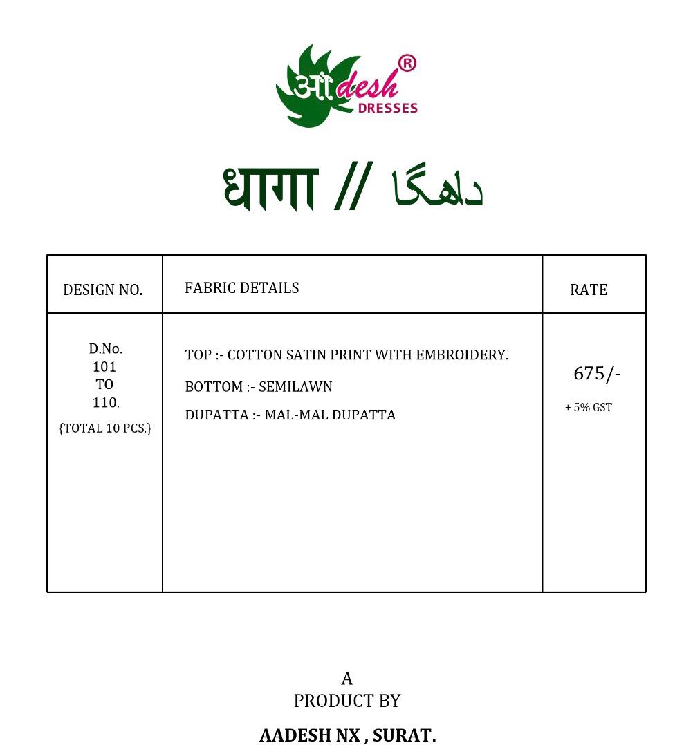 Buy Online Dhaga By Aadesh Cotton Embroidered Suits Wholesale Supplier Gujarat 10 Pcs of Full Catalogue at Wholesale Price. Looking for Dhaga By Aadesh Cotton Embroidered Suits Wholesale Supplier Gujarat Full Catalouge at Best Price? Buy Now Dhaga By Aadesh Cotton Embroidered Suits Wholesale Supplier Gujarat at Wholesale Rate of Rs 6750 with Total 10 Pcs from authroized dealer and supplier of Brand. Cost of Each piece is just only Rs 675 which is very low and affordable price to resale the product in your retail store ,This is Surat based Wholesale Supplier & Dealer of Brand. Click on Brand name to Know more about Brand's products.Call or Whatsapp on 9898838984 for booking or enquiry