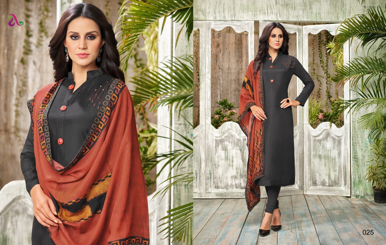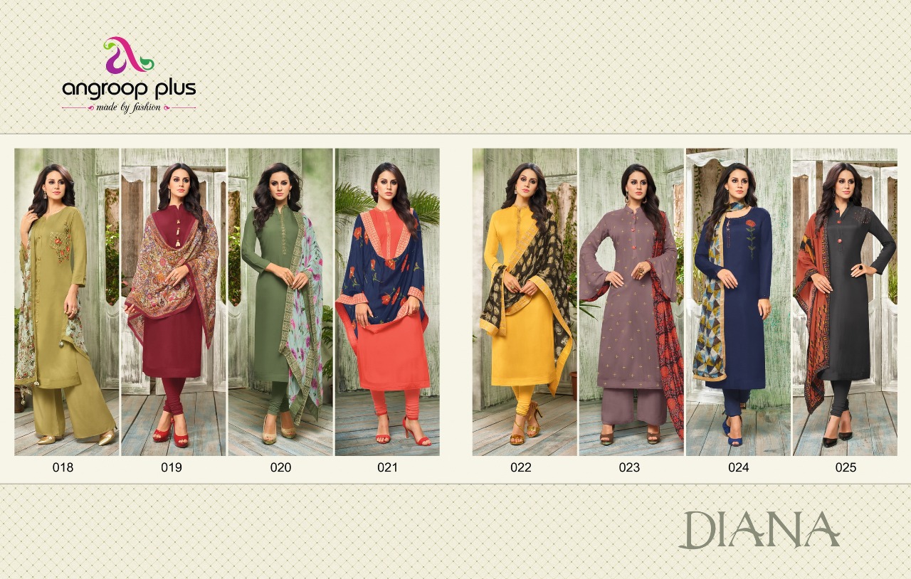 *Catelog :DIANA* ???????? ?? *Top: masline silk*with emb* ?? *Bottom:cotton solid* ?? *Dupatta :masline digital stall dup ??*Designs:8 ??all accesories are inc excl bag packing ANGROOP PLUS ?? Price:650/- only |