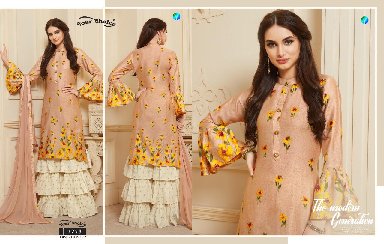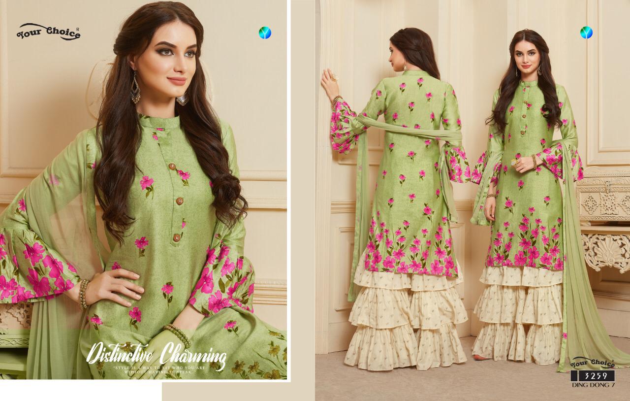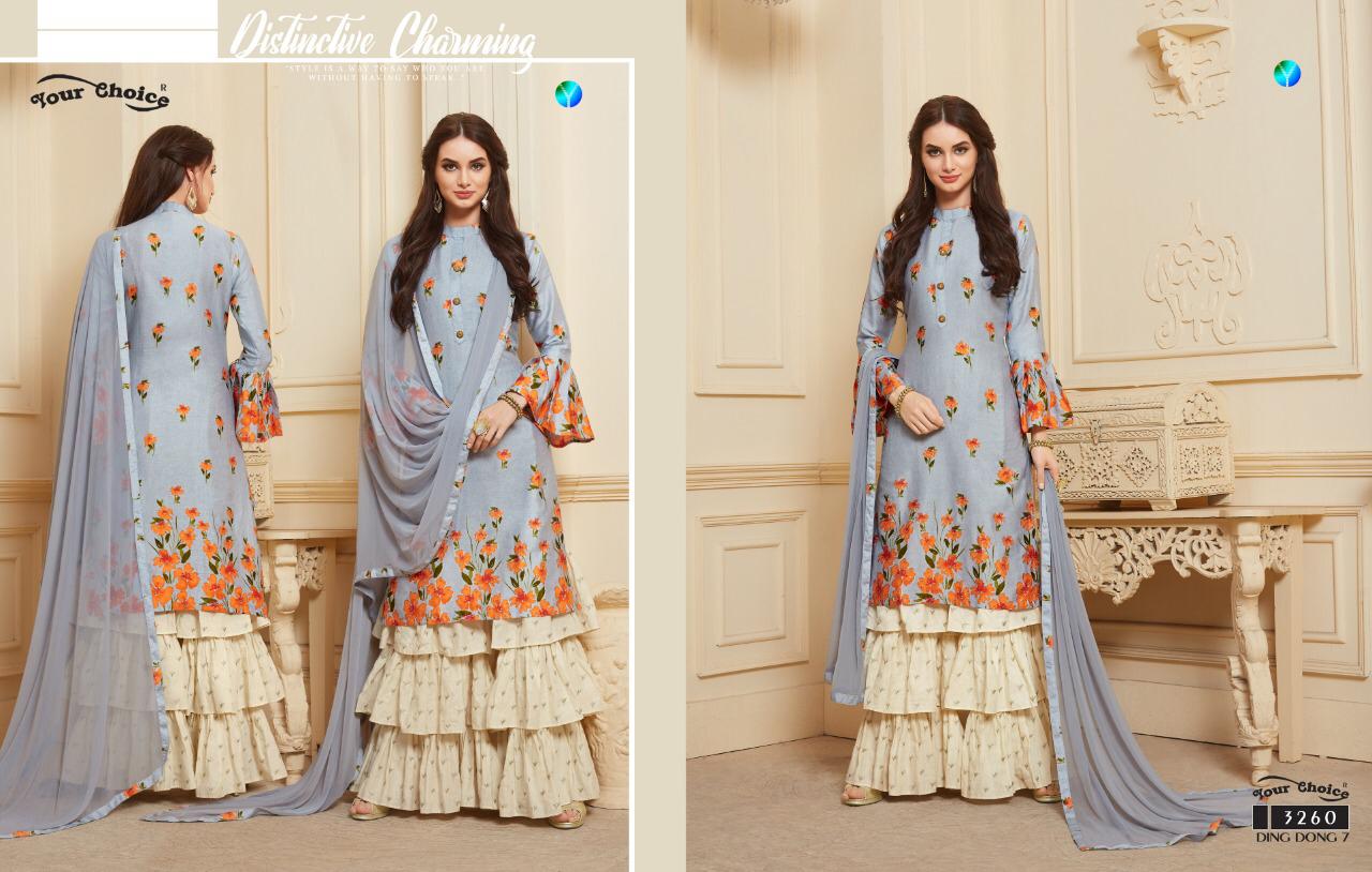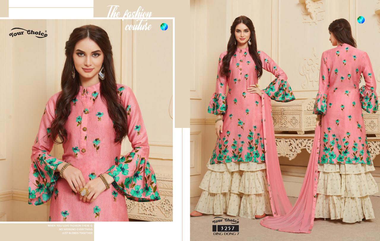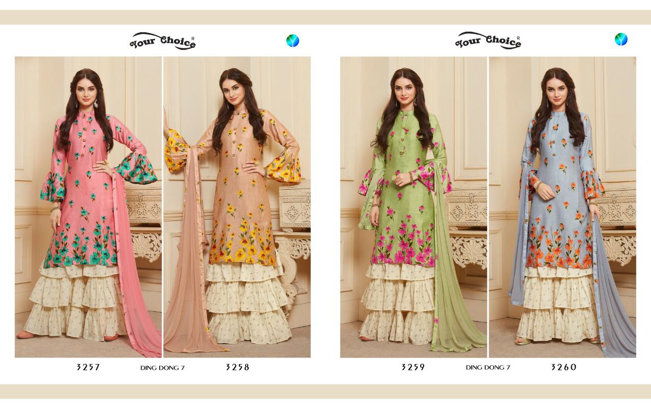 Buy Online Ding Dong 7 By Your Choice Series 3257 To 3260 Silk Printed Sarara Suits Wholesale Supplier Gujarat 4 Pcs of Full Catalogue at Wholesale Price. Looking for Ding Dong 7 By Your Choice Series 3257 To 3260 Silk Printed Sarara Suits Wholesale Supplier Gujarat Full Catalouge at Best Price? Buy Now Ding Dong 7 By Your Choice Series 3257 To 3260 Silk Printed Sarara Suits Wholesale Supplier Gujarat at Wholesale Rate of Rs 4780 with Total 4 Pcs from authroized dealer and supplier of YOUR CHOICE Brand. Cost of Each piece is just only Rs 1195 which is very low and affordable price to resale the product in your retail store ,This is Surat based Wholesale Supplier & Dealer of YOUR CHOICE Brand. Click on Brand name to Know more about YOUR CHOICE Brand's products.Call or Whatsapp on 9898838984 for booking or enquiry