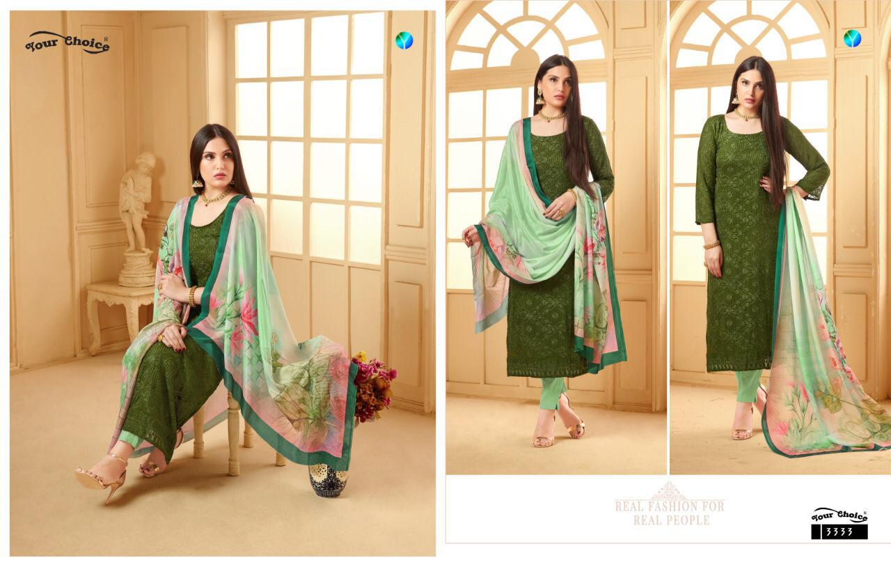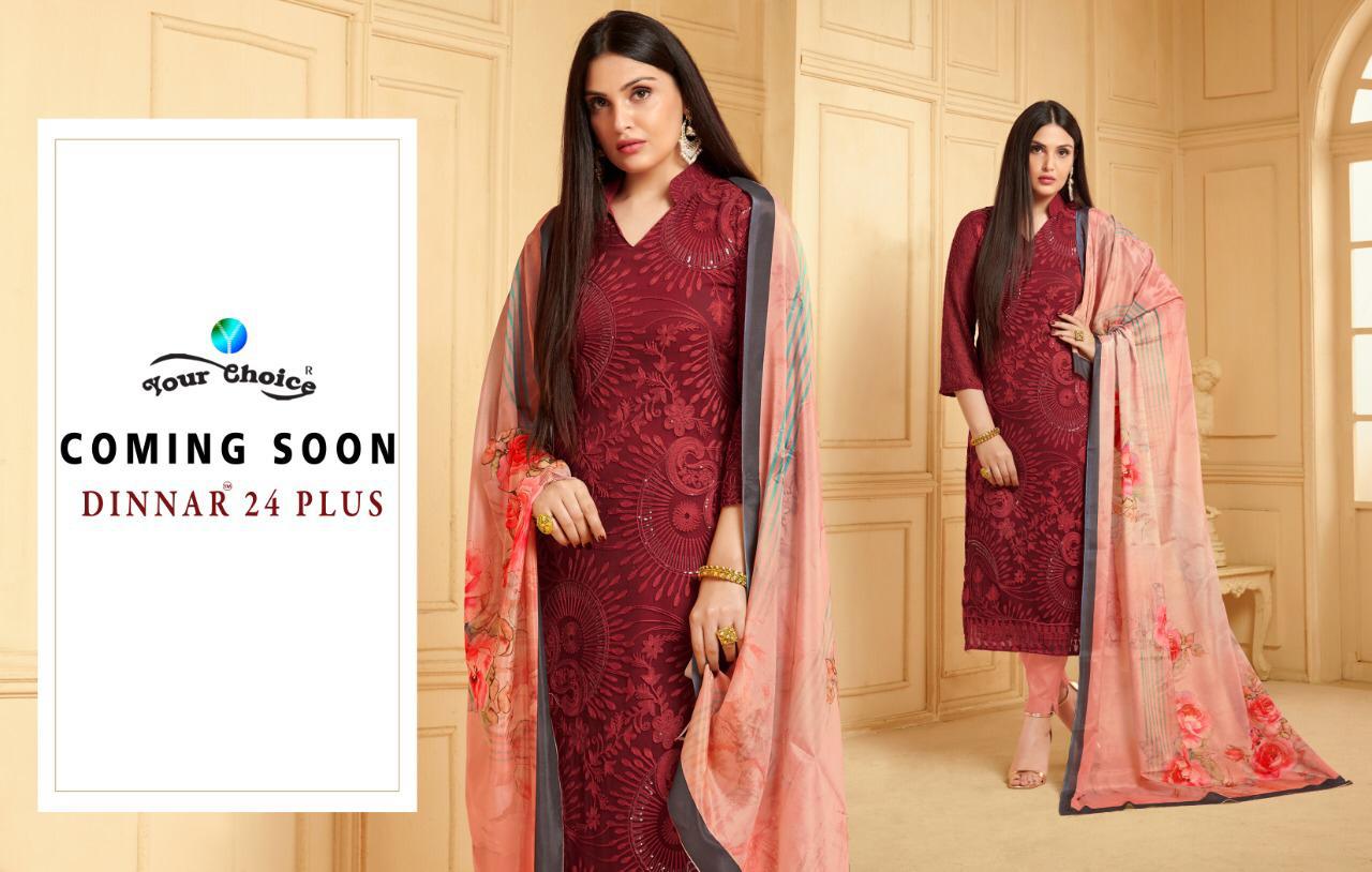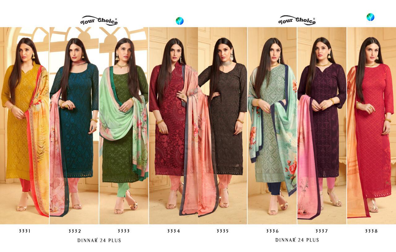 Buy Online Dinner 24 By Your Choice Chiffon Suits Wholesale Supplier Gujarat 895 Pcs of Full Catalogue at Wholesale Price. Looking for Dinner 24 By Your Choice Chiffon Suits Wholesale Supplier Gujarat Full Catalouge at Best Price? Buy Now Dinner 24 By Your Choice Chiffon Suits Wholesale Supplier Gujarat at Wholesale Rate of Rs 7160 with Total 895 Pcs from authroized dealer and supplier of YOUR CHOICE Brand. Cost of Each piece is just only Rs 8 which is very low and affordable price to resale the product in your retail store ,This is Surat based Wholesale Supplier & Dealer of YOUR CHOICE Brand. Click on Brand name to Know more about YOUR CHOICE Brand's products.Call or Whatsapp on 9898838984 for booking or enquiry