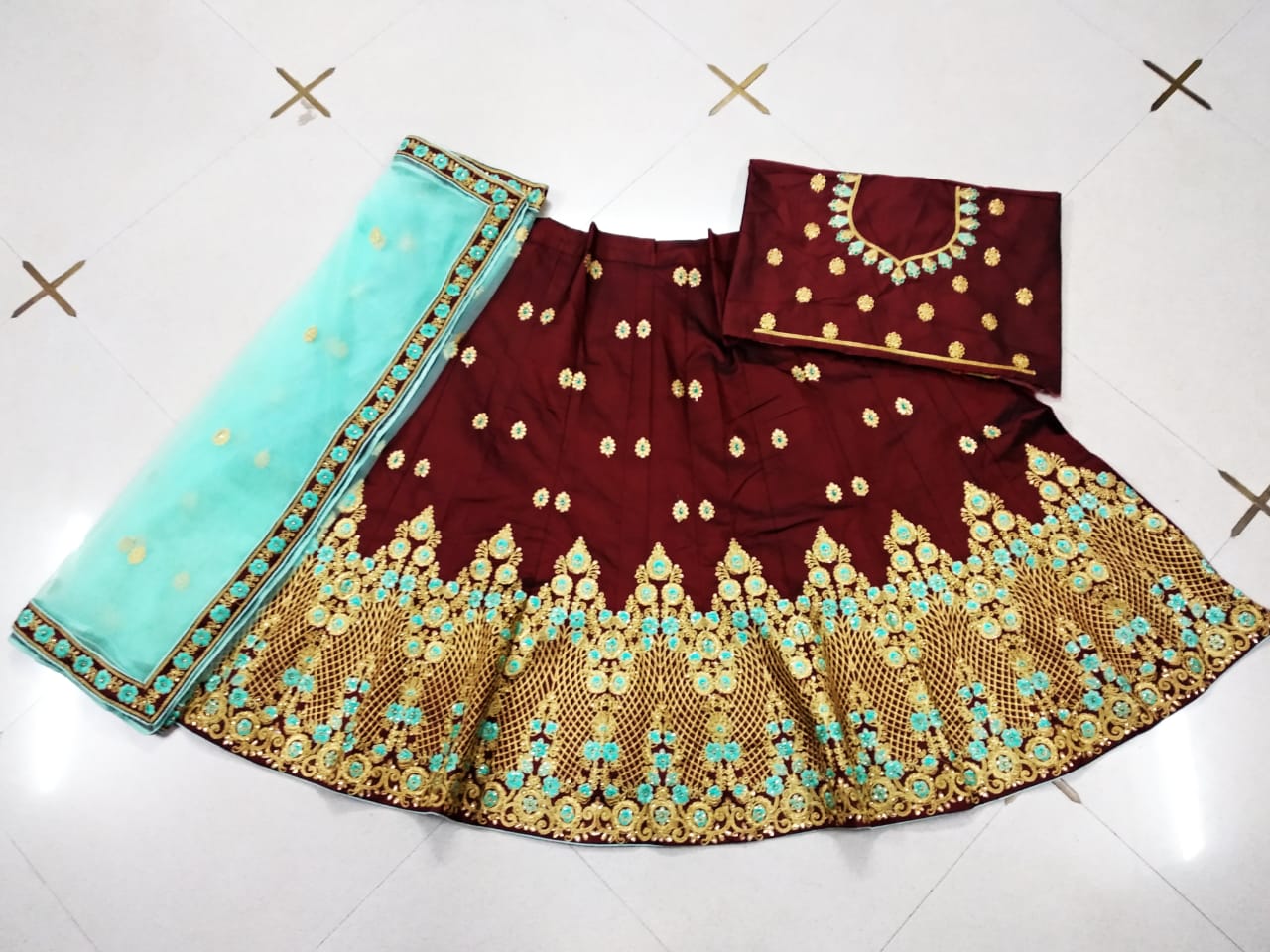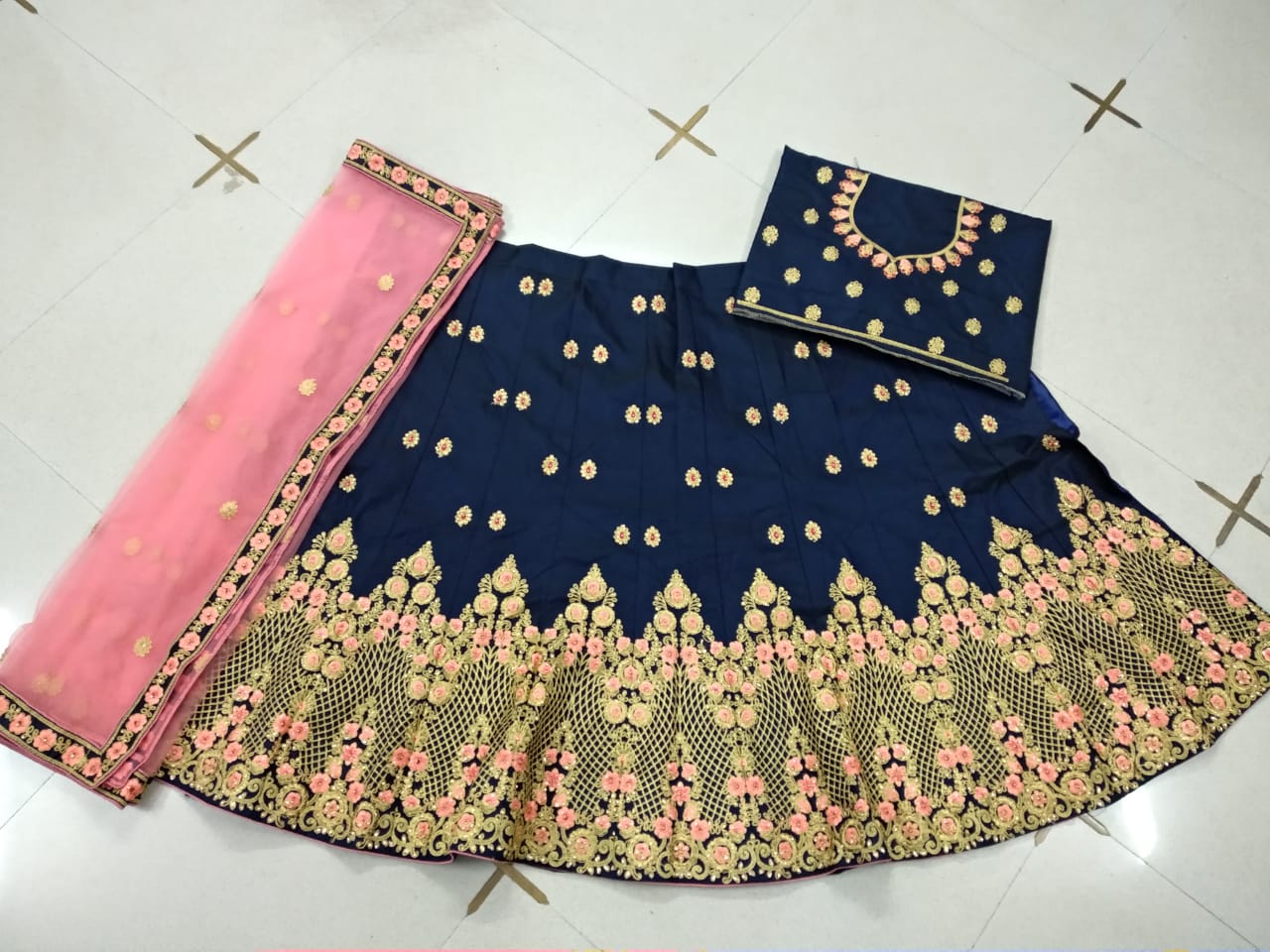 ??D.N.1048?? ??Type - Lehnga- Semi Stitched ??Colour - 3 (as shown in Neavy Blue, Rama, MAROON) ??Lehnga- 9000 Silk Velvet (Coding dori+ Zari Work + Diamond work) ??Inner- Satin ??Blouse- 9000 SILK Velvet (0.8 meter) ??Duppata- Net (2.5mtr) (Lace border+ Diamond work) ??Length Ghagra- 44 inch ??Waist Size - 44 (XXL) ?Weight -1kg per piece ?Price INR 1599/- ? per piece Single Available Gst ship extra |