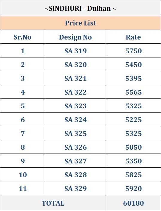 Buy Online Dulhan Series 319 To 329 Sindhuri By Kimora 11 Pcs of Full Catalogue at Wholesale Price. Looking for Dulhan Series 319 To 329 Sindhuri By Kimora Full Catalouge at Best Price? Buy Now Dulhan Series 319 To 329 Sindhuri By Kimora at Wholesale Rate of Rs 0 with Total 11 Pcs from authroized dealer and supplier of KIMORA Brand. Cost of Each piece is just only Rs 0 which is very low and affordable price to resale the product in your retail store ,This is Surat based Wholesale Supplier & Dealer of KIMORA Brand. Click on Brand name to Know more about KIMORA Brand's products.Call or Whatsapp on 9898838984 for booking or enquiry