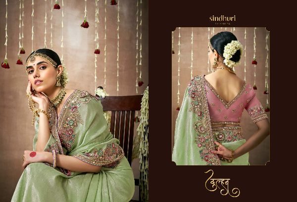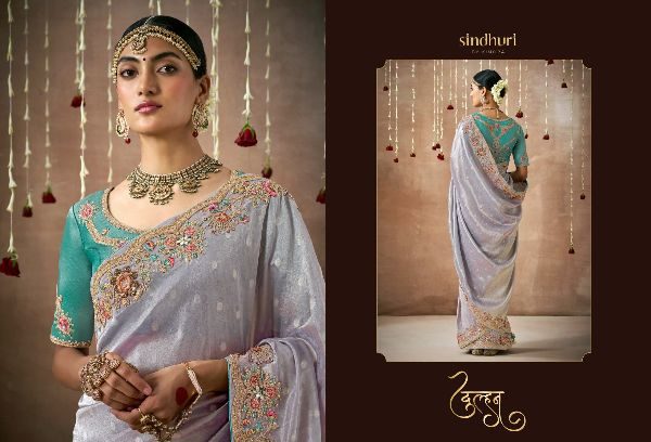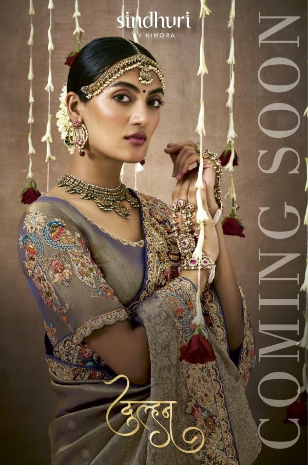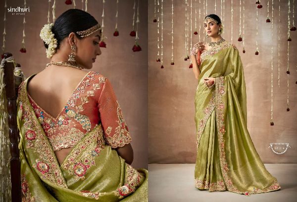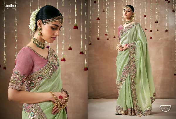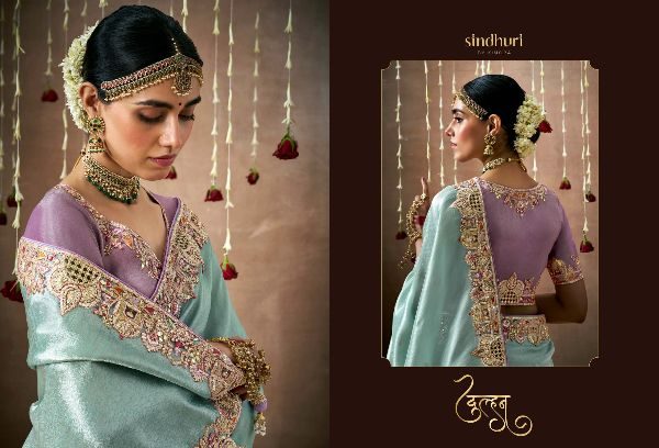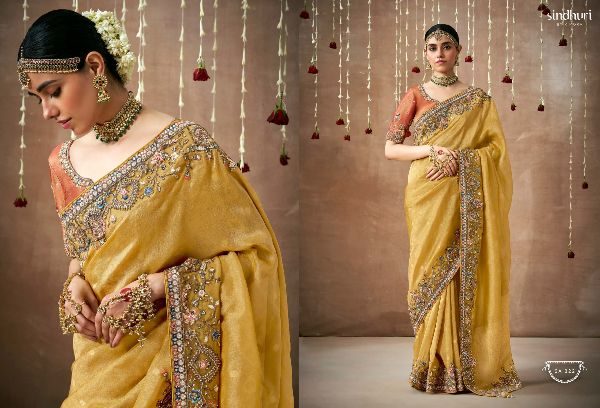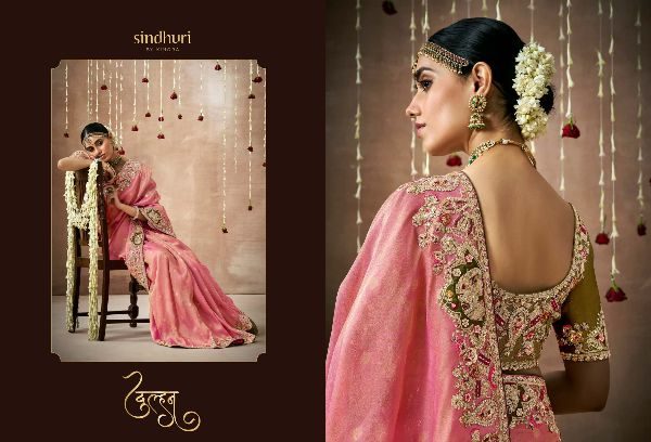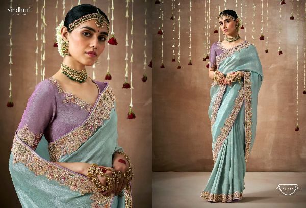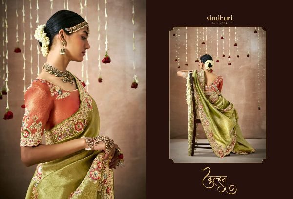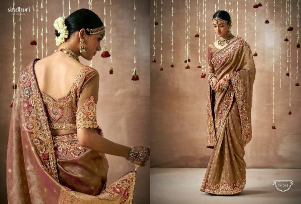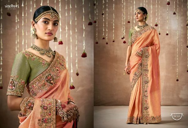 This Bridal Saree Are creating a stunning silhouette , Every thread, every motif, and every drape tells a story of love, prosperity, and new beginnings. This heavy bridal saree is a true marvel of Indian craftsmanship, making the feel like a queen on your special day Brand Name : Kimora Catalogue Name: Sindhuri Dulhan Series : 319 to 329 Price : List Attached+5%GST Fabric: Tissue Dola Silk Adorned with intricate zari Weaving work, adds a touch of regality, embellished with Embroidery, Sequince,Pearl ,Mirror,Thread ,Hand Work & Stone Work Attached Heavy Tussles On Pallu Blouse: Tissue Dola Silk With Heavy Work Contras Or Matching Blouse Style : Bridal Wear 100+ SINGLE |