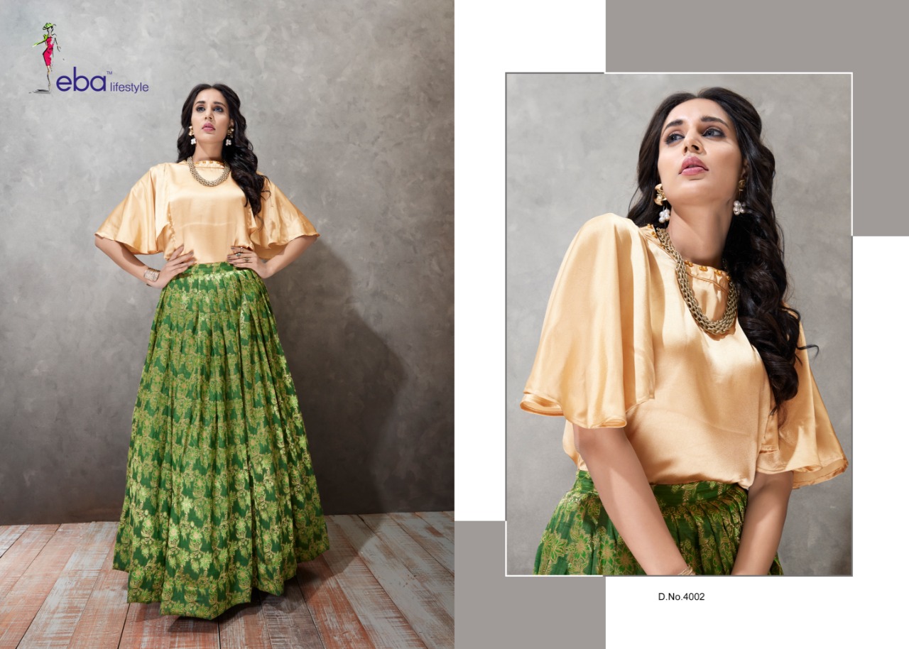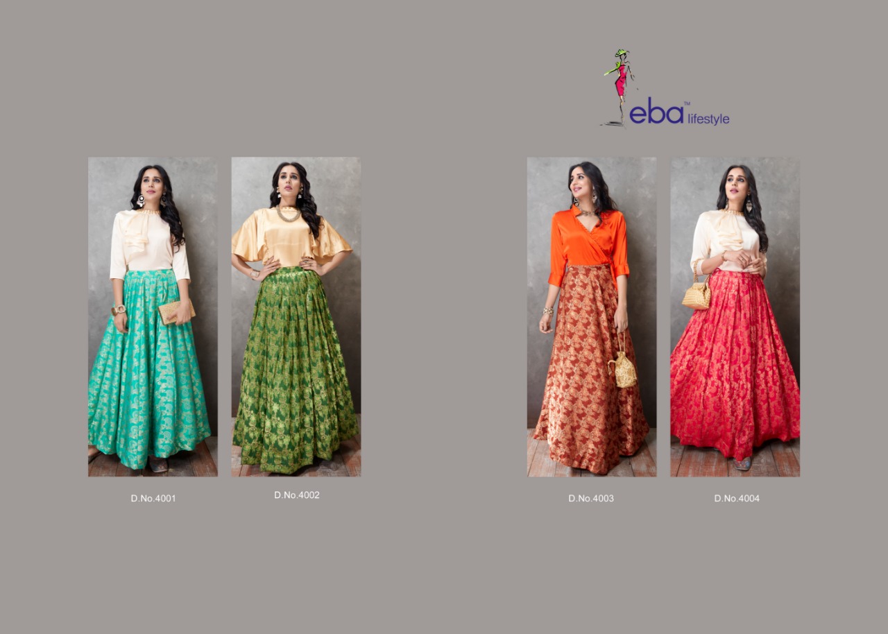 Buy Online Eba Lifestyle Western Vol 1 Readymade Collection 4001 Series Designer Top And Skirt Collection Wholesaler And Supplier Surat 4 Pcs of Full Catalogue at Wholesale Price. Looking for Eba Lifestyle Western Vol 1 Readymade Collection 4001 Series Designer Top And Skirt Collection Wholesaler And Supplier Surat Full Catalouge at Best Price? Buy Now Eba Lifestyle Western Vol 1 Readymade Collection 4001 Series Designer Top And Skirt Collection Wholesaler And Supplier Surat at Wholesale Rate of Rs 5580 with Total 4 Pcs from authroized dealer and supplier of Eba Lifestyle Brand. Cost of Each piece is just only Rs 1395 which is very low and affordable price to resale the product in your retail store ,This is Surat based Wholesale Supplier & Dealer of Eba Lifestyle Brand. Click on Brand name to Know more about Eba Lifestyle Brand's products.Call or Whatsapp on 9898838984 for booking or enquiry