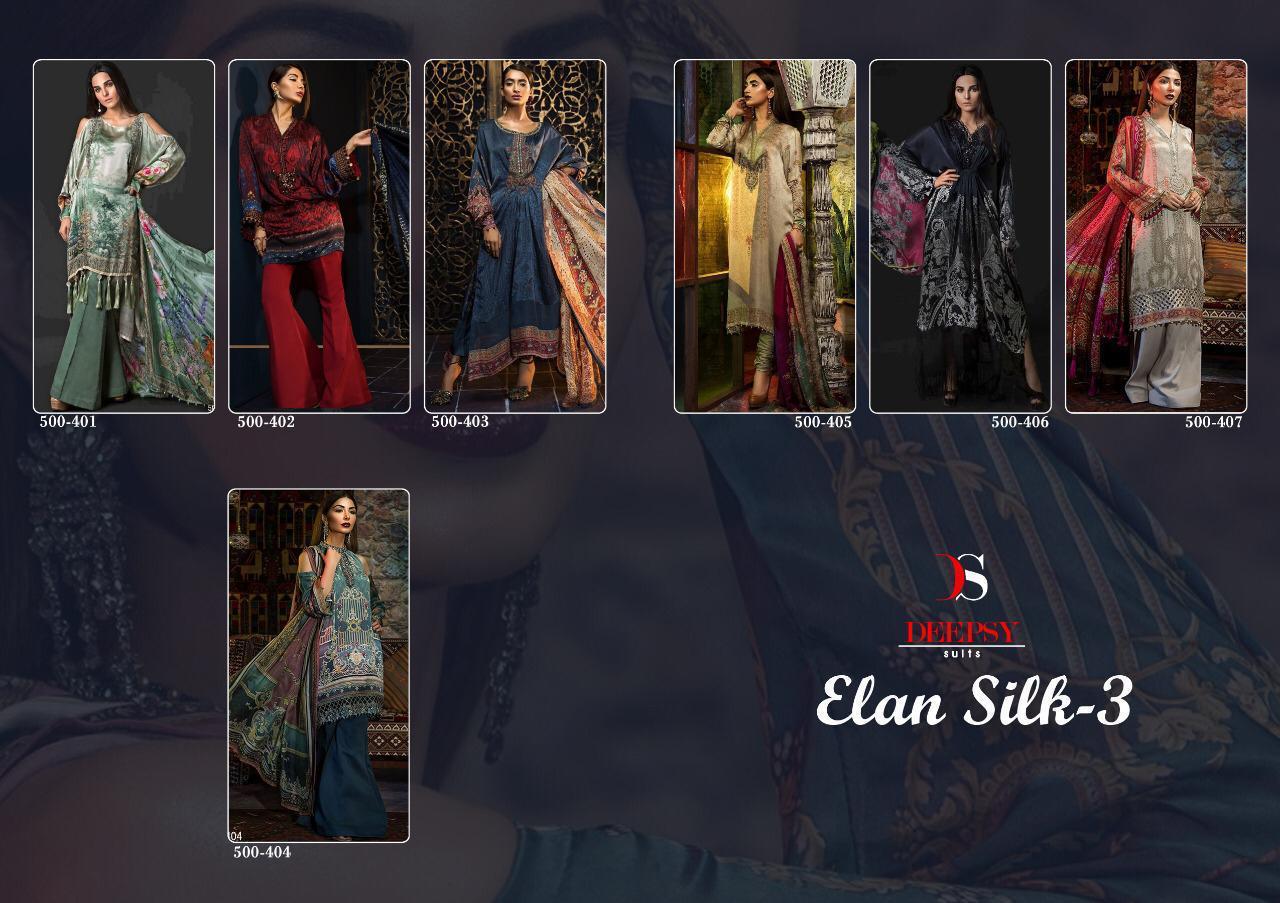 Buy Online Elan Silk Vol 3 By Deepsy 500401 Series Fancy Pakistani Style Suit Catlog Wholesale Dealer Surat 7 Pcs of Full Catalogue at Wholesale Price. Looking for Elan Silk Vol 3 By Deepsy 500401 Series Fancy Pakistani Style Suit Catlog Wholesale Dealer Surat Full Catalouge at Best Price? Buy Now Elan Silk Vol 3 By Deepsy 500401 Series Fancy Pakistani Style Suit Catlog Wholesale Dealer Surat at Wholesale Rate of Rs 7693 with Total 7 Pcs from authroized dealer and supplier of DEEPSY Brand. Cost of Each piece is just only Rs 1099 which is very low and affordable price to resale the product in your retail store ,This is Surat based Wholesale Supplier & Dealer of DEEPSY Brand. Click on Brand name to Know more about DEEPSY Brand's products.Call or Whatsapp on 9898838984 for booking or enquiry