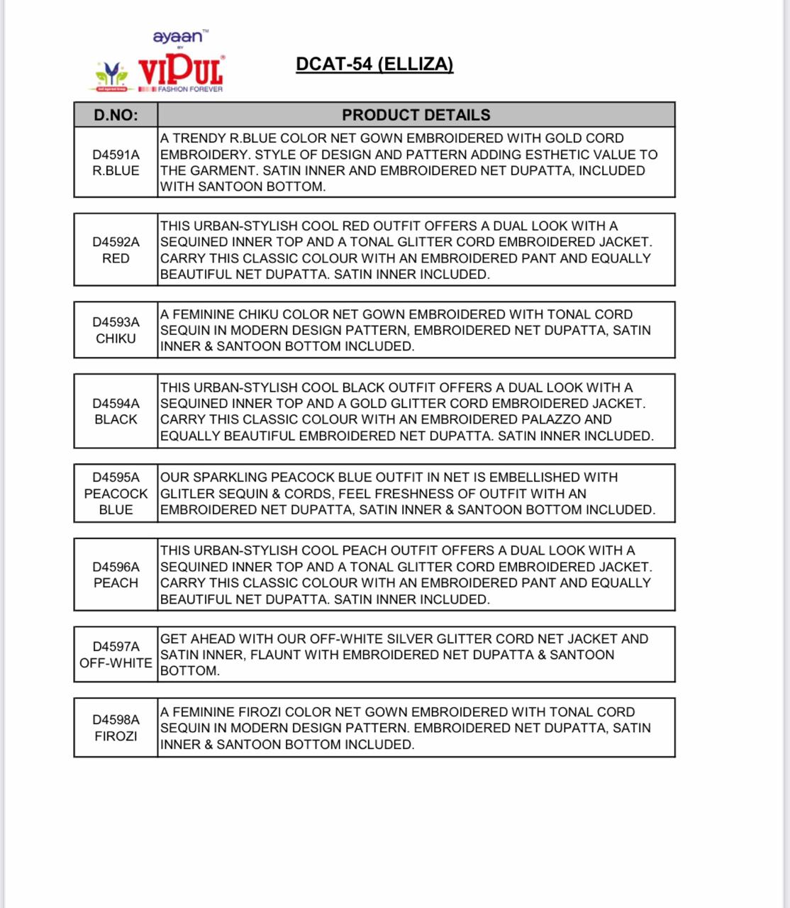 Brand - Vipul . Catlog name - ELLIZA . Series - 4591 A to 4598 A. GST 5 Percent Extra. Delivery from tomorrow SINGLE 100+ |