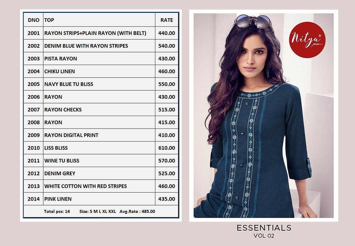 Buy Online Essential 2 By Lt Nitya Western Top Collection Catalog Wholesale Supplier And Dealer Surat 14 Pcs of Full Catalogue at Wholesale Price. Looking for Essential 2 By Lt Nitya Western Top Collection Catalog Wholesale Supplier And Dealer Surat Full Catalouge at Best Price? Buy Now Essential 2 By Lt Nitya Western Top Collection Catalog Wholesale Supplier And Dealer Surat at Wholesale Rate of Rs 6790 with Total 14 Pcs from authroized dealer and supplier of LT FABRICS Brand. Cost of Each piece is just only Rs 485 which is very low and affordable price to resale the product in your retail store ,This is Surat based Wholesale Supplier & Dealer of LT FABRICS Brand. Click on Brand name to Know more about LT FABRICS Brand's products.Call or Whatsapp on 9898838984 for booking or enquiry