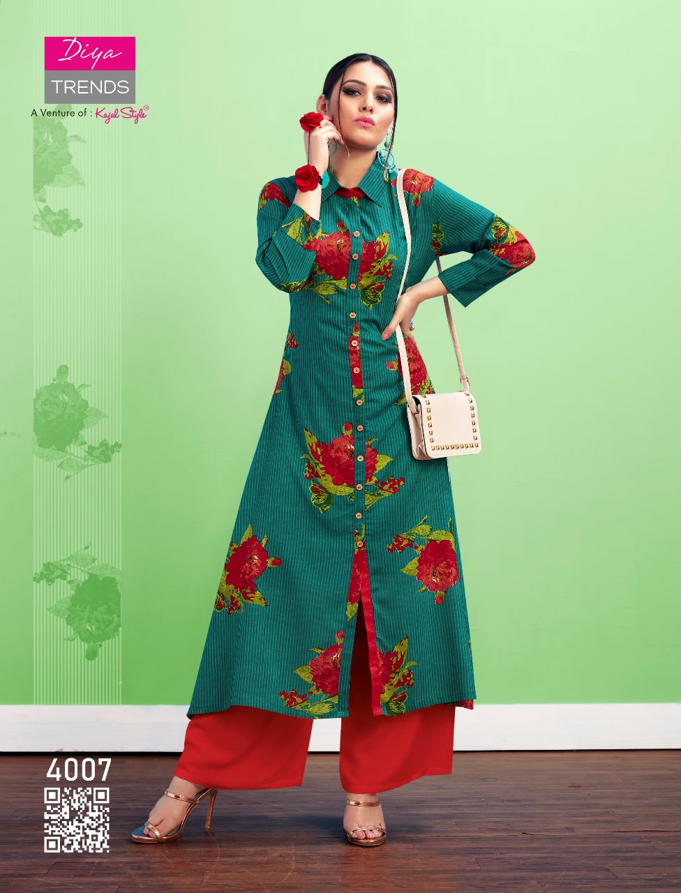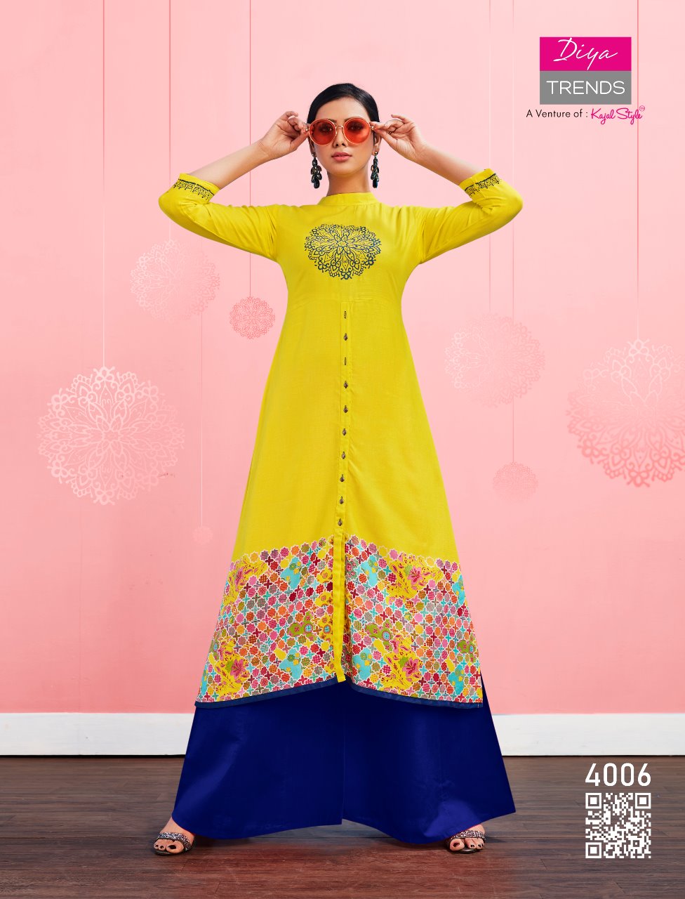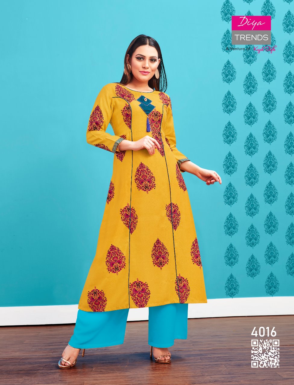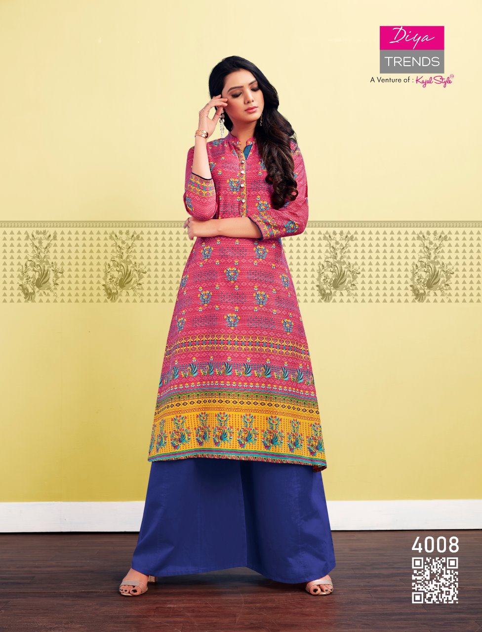 Buy Online Ethnicity Vol 4 By Diya Trendz 4001 Series Fancy Cotton Reyon Kurti Collection Wholesaler Surat 16 Pcs of Full Catalogue at Wholesale Price. Looking for Ethnicity Vol 4 By Diya Trendz 4001 Series Fancy Cotton Reyon Kurti Collection Wholesaler Surat Full Catalouge at Best Price? Buy Now Ethnicity Vol 4 By Diya Trendz 4001 Series Fancy Cotton Reyon Kurti Collection Wholesaler Surat at Wholesale Rate of Rs 5760 with Total 16 Pcs from authroized dealer and supplier of Brand. Cost of Each piece is just only Rs 360 which is very low and affordable price to resale the product in your retail store ,This is Surat based Wholesale Supplier & Dealer of Brand. Click on Brand name to Know more about Brand's products.Call or Whatsapp on 9898838984 for booking or enquiry