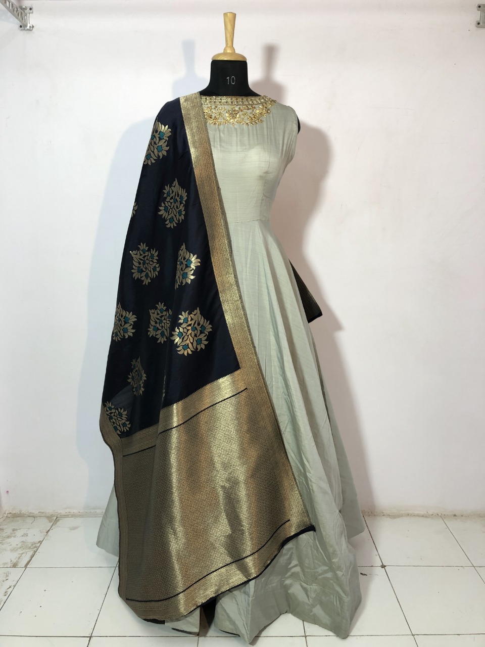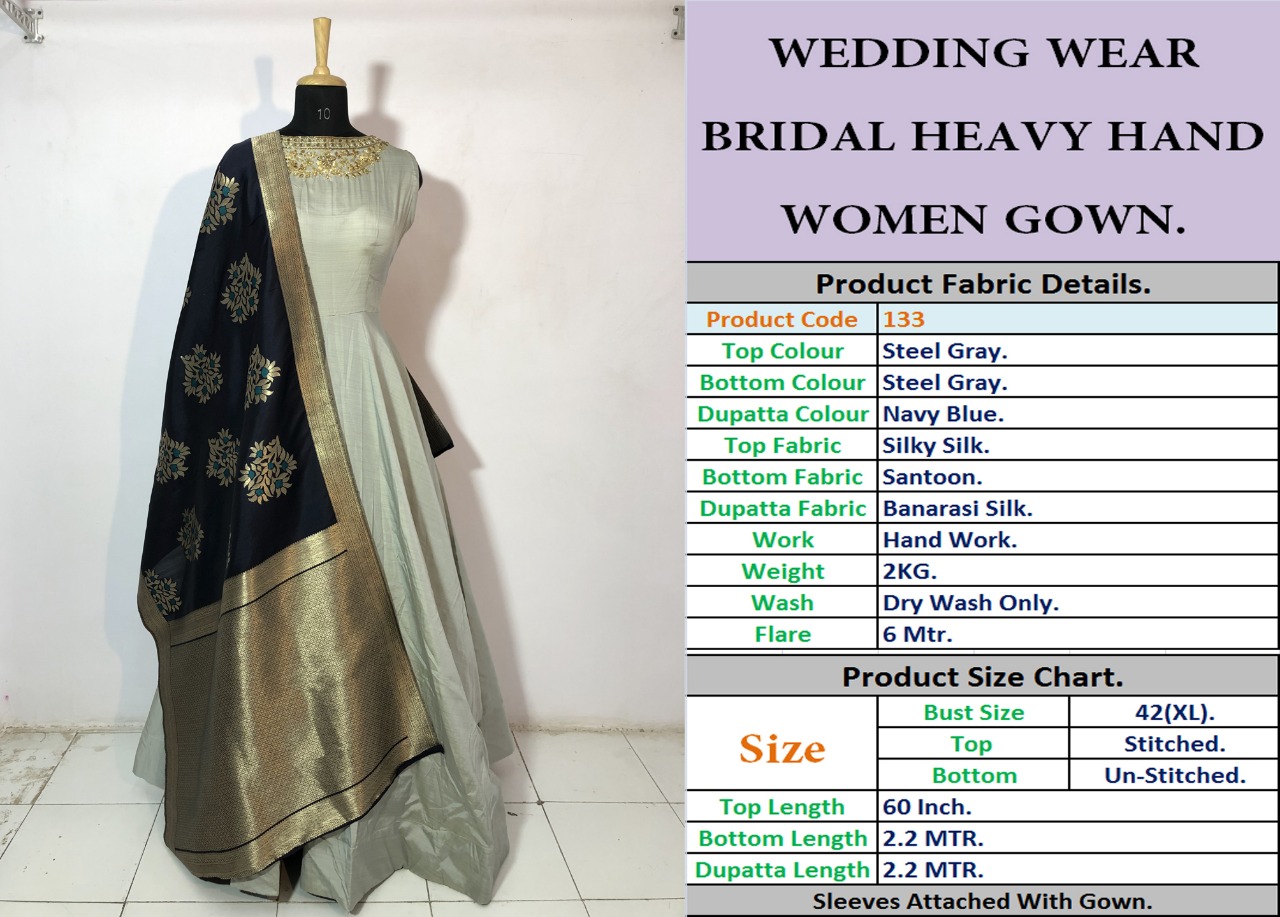 THE GIRLISH COLLECTION ? *Product Code: 133* ? ?Colour Details? Top Colour: Steel Gray. Bottom Colour: Steel Gray. Dupatta Colour: Navy Blue. ?Fabric Details? Top Fabric: Silky Silk. Bottom Fabric: Santoon. Dupatta Fabric: Banarasi Silk Dupatta. ?Work/Weight/Wash Details? Gown Work: Hand Work. Weight: 2Kg. Wash: Dry Wash Only. ?Product Size Details? Bust Size: 42 (XL). Top: Stitched. Bottom: Un-Stitched. Top Length: 57 Inch. Bottom Length: 2.2 Mtr. Dupatta Length: 2.3 Mtr. Sleeves: Available. ? *Price: 3000/-*? Gst ship extra ? *No Less* *Assured Quality!* *Authentic Original Product!* *Custom Size Stitching Available.* *Ready to Shipping World Wide.* *Single Pic Available...* |